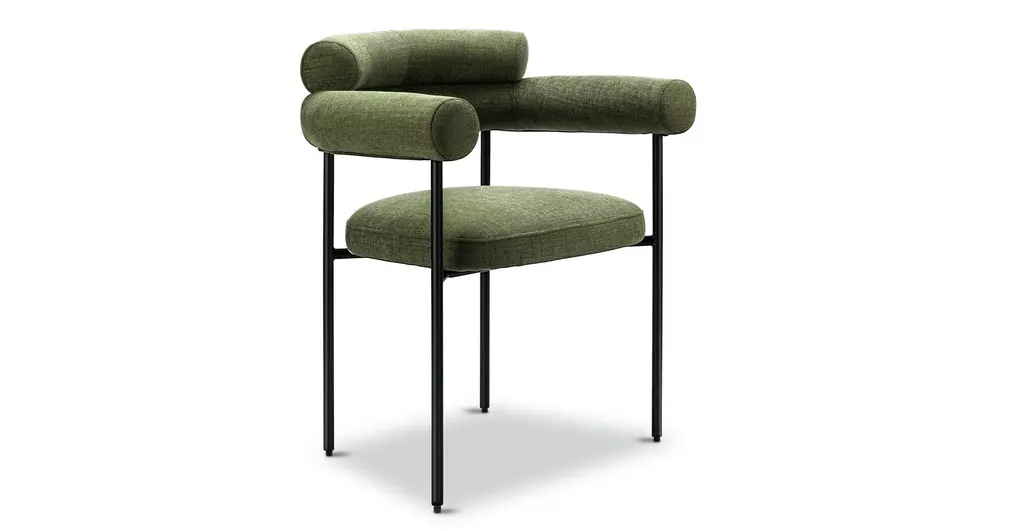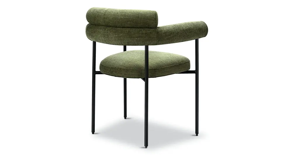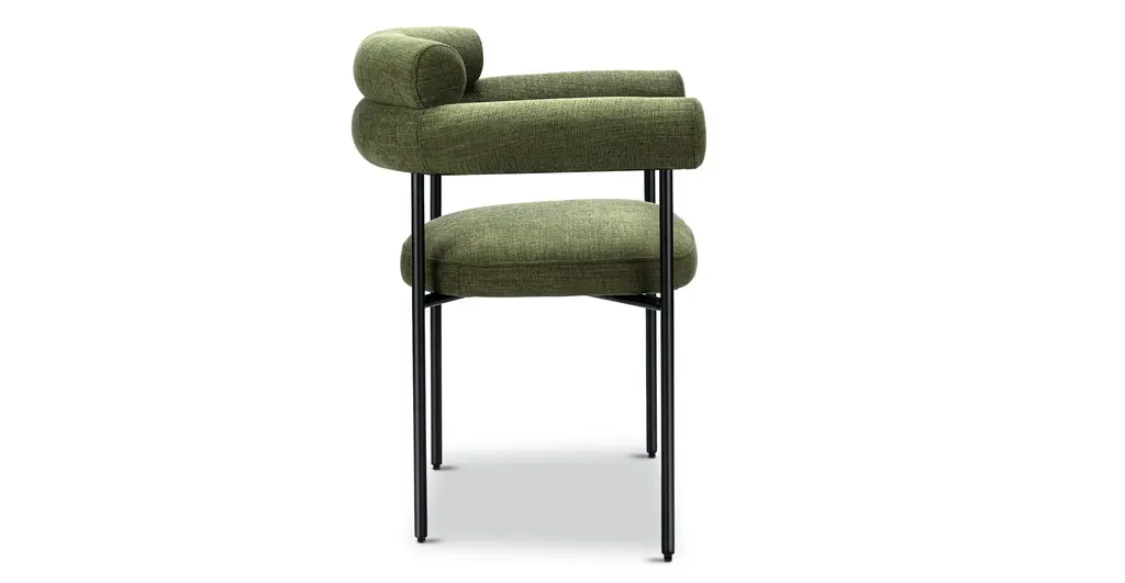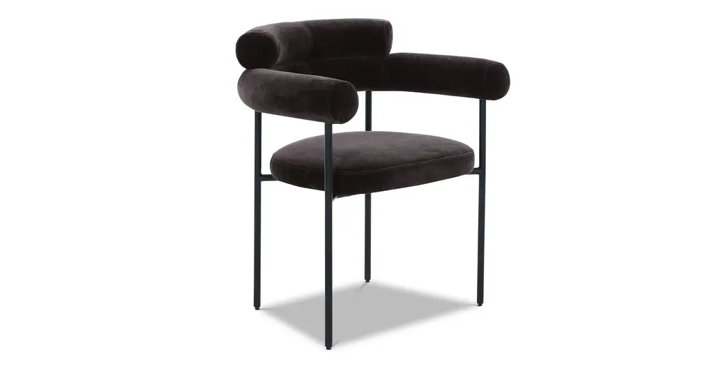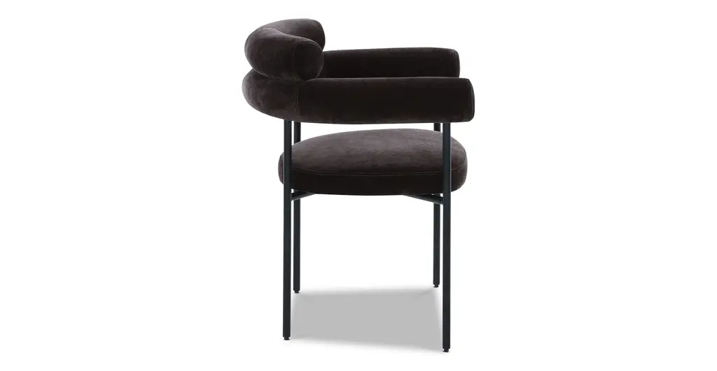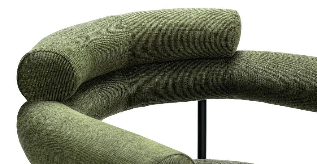 Meet the epitome of elegance: our Bolus chair with a round, sumptuously padded back that cradles you in comfort. Supported by slender, sleek black metal legs, it's a marriage of grace and modernity. This chair doesn't just invite you to sit; it beckons you to indulge in a moment of pure luxury and sophistication.