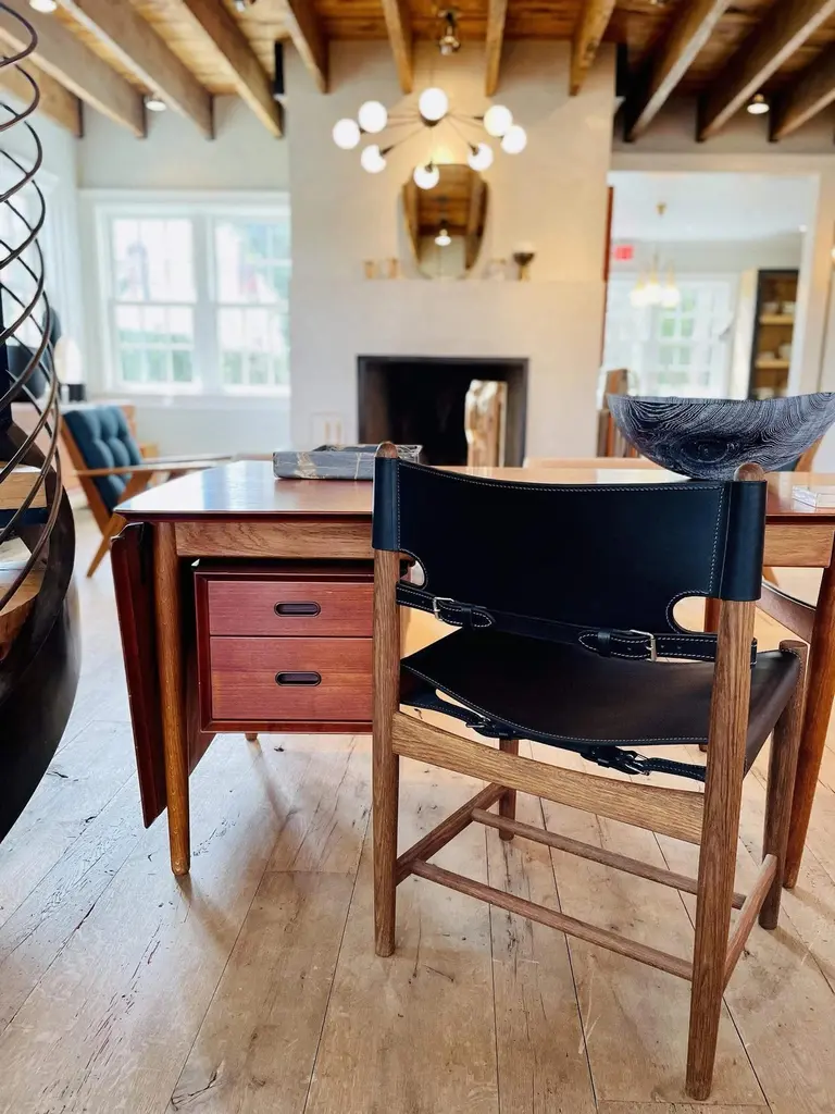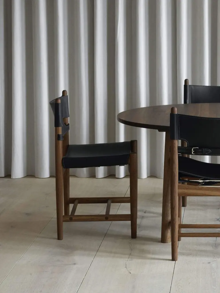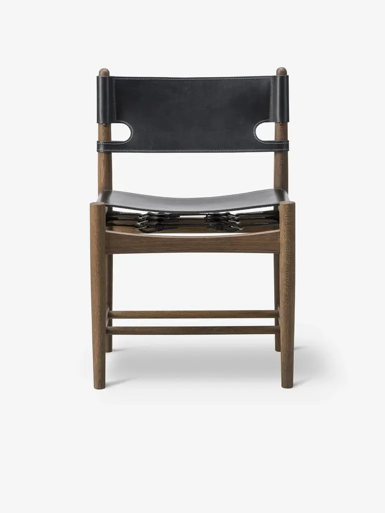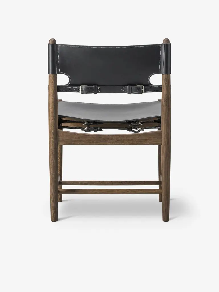 In 1958, Børge Mogensen and his family travelled to Spain. In Andalucia he fell in love with an old chair with a wide seat and broad armrests. Once back in Denmark, he created The Spanish Chair.The chair he fell in love with is a traditional type of chair and is very common in areas influenced by ancient Islamic culture – from Spain to northern India. Børge Mogensen modernised the design by removing the elaborate carvings, and thus he created his own version with his customary geometrical precision. Yet he retained the most important feature: the broad armrests that give the chair its distinctive character. The broad armrests also serve as a practical place to place a cup or a glass.By designing The Spanish Chair Mogensen proved that he did not need to use steel or plastic to be innovative. Like The Hunting Chair, it is made of oak and butt leather. This gives it a strong, masculine character, and ensures that the chair ages beautifully. The straps allow that the back can be tightened as the leather expands, which means that you can sit securely and comfortably in this chair from day one – and for the rest of your life.