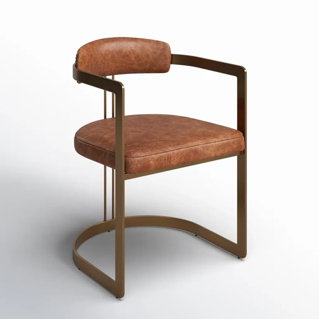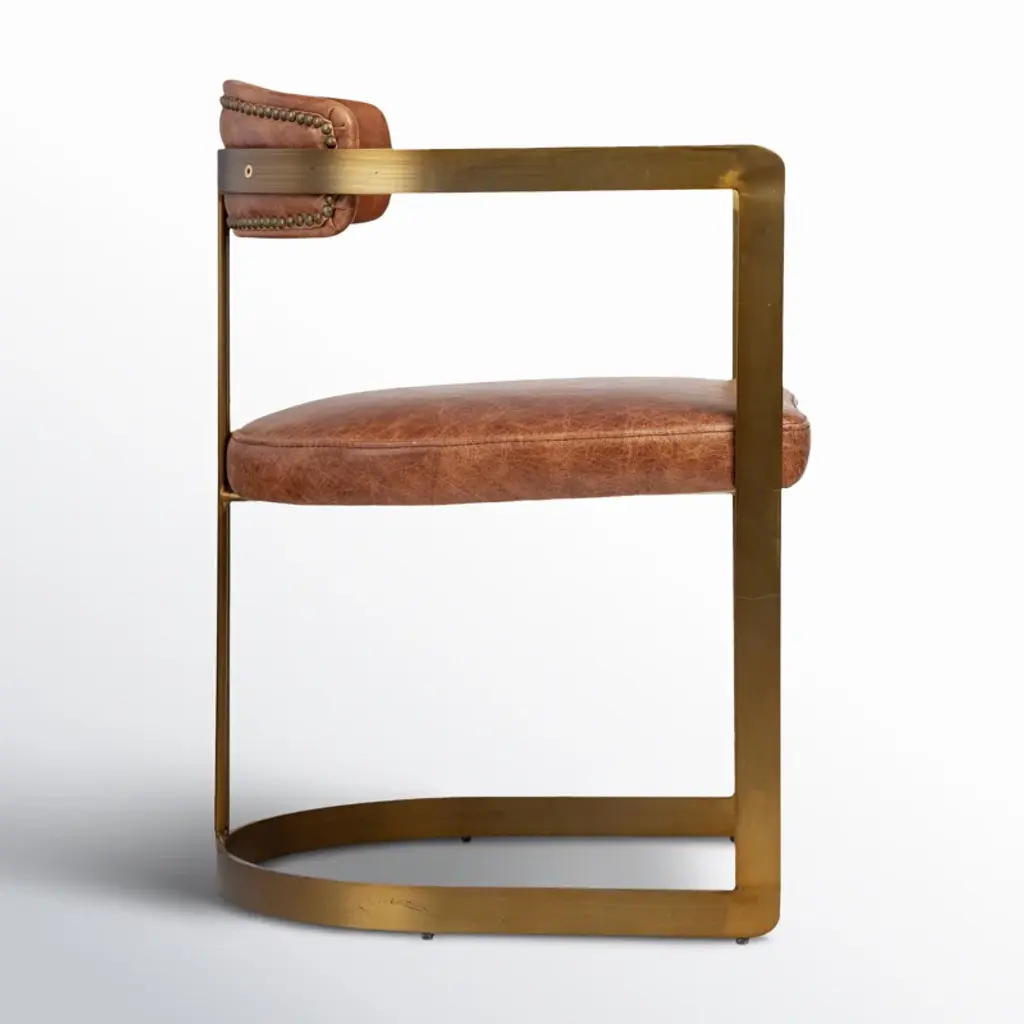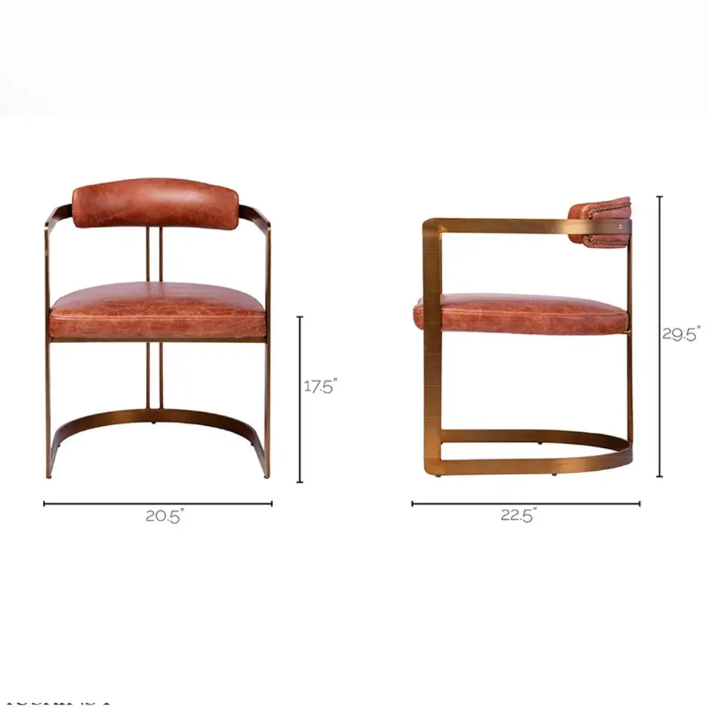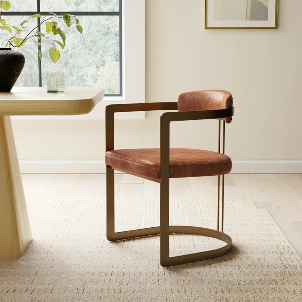 Our dining armchair is wrapped in genuine leather upholstery that elevates any aesthetic. It has a bold U-shaped metal frame with an antique brass finish and a curved back that wraps around to form arms. Consider multiples to surround your dining table for a cohesive look.