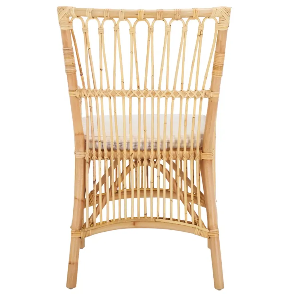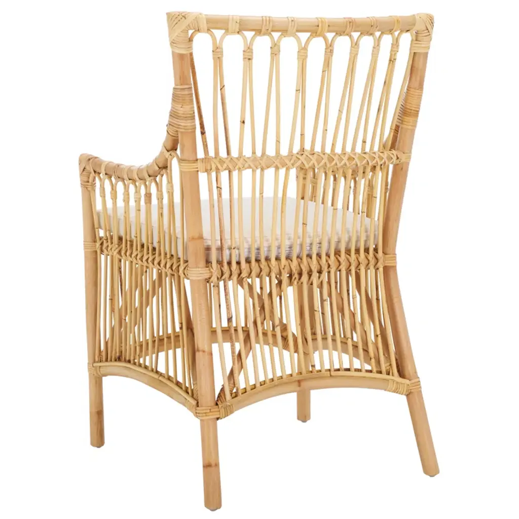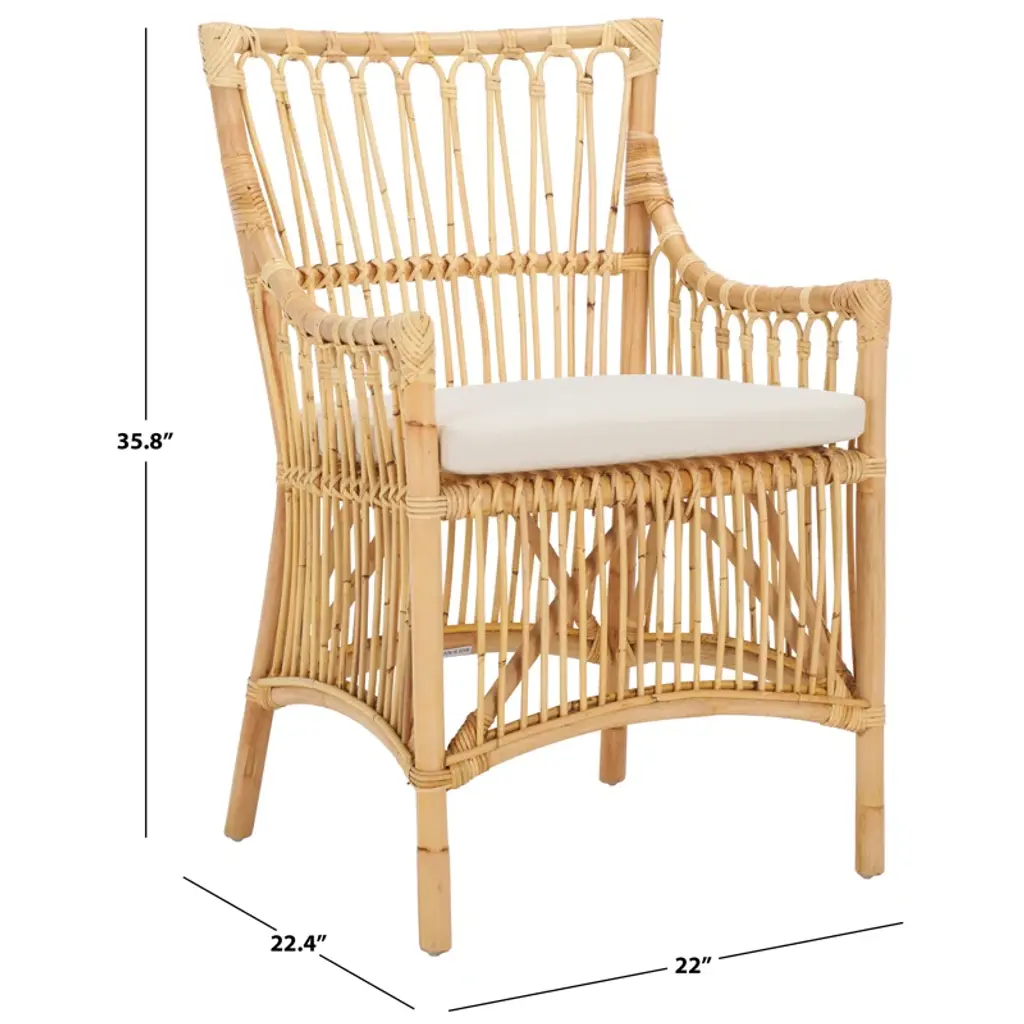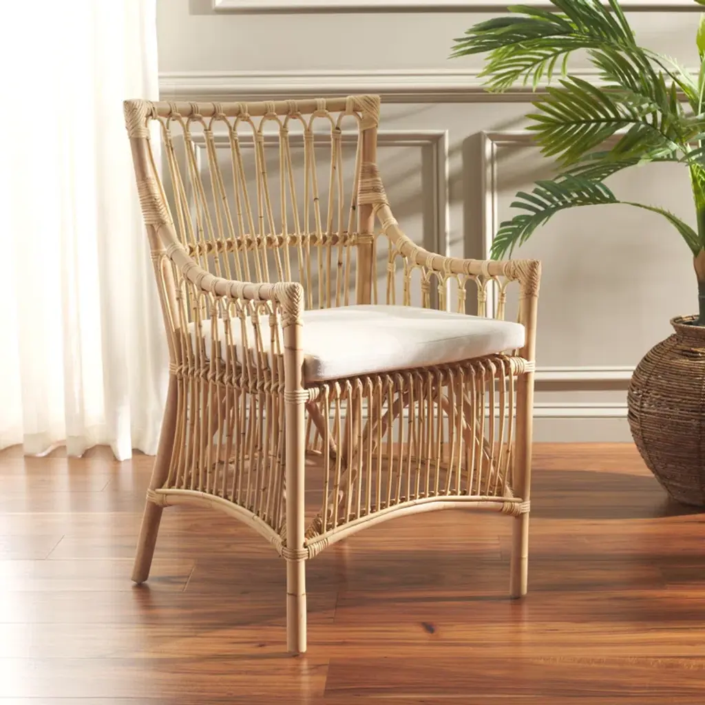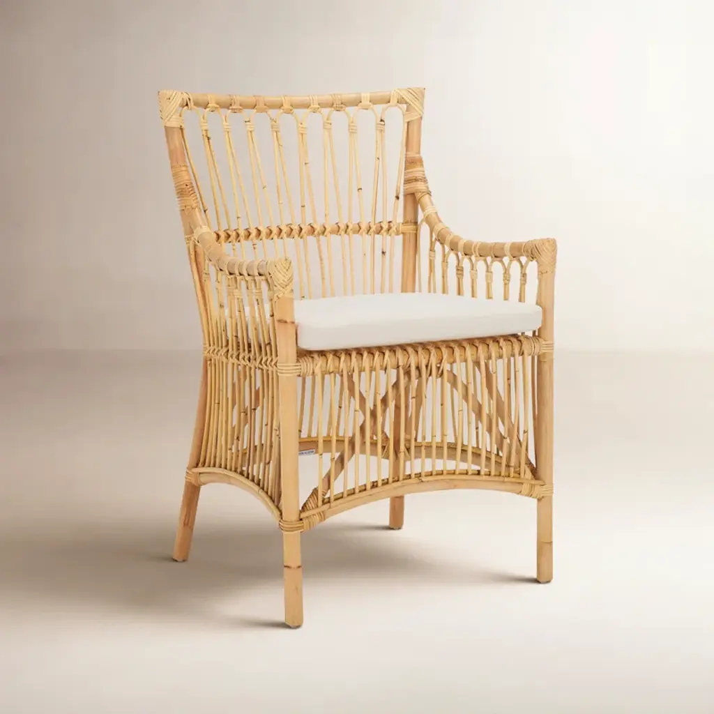 Liven up your space with our texturally rich and artful Foluke dining chair with cushion. Our handmade chair offers artisanal charm and warmth with its natural textures and exquisite craftsmanship. The chair attains a beautiful balance between clean lines and curves to attain a breezy and eye-catching presence. Our dining chair is crafted from rattan to enrich any room with its warmth and artful character. Featuring a tall back, armrest, and a padded white cushion, the chair offers an easy and comfortable seat in your kitchen, dining room, or lounge.