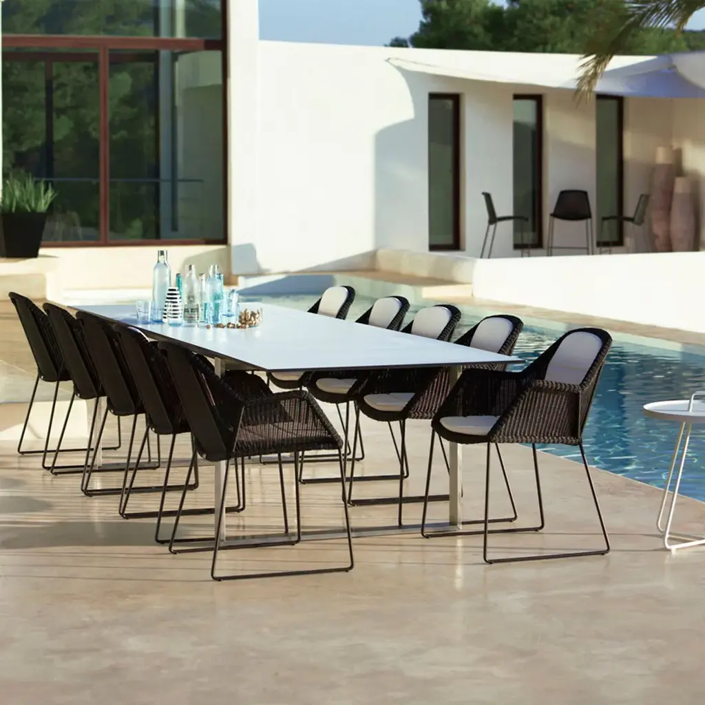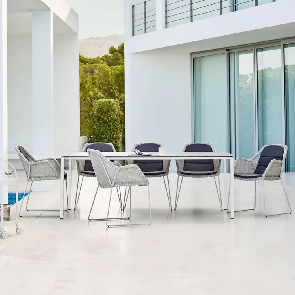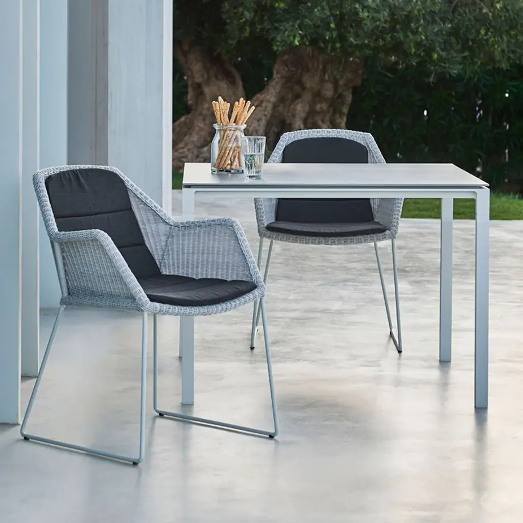 The Breeze dining chair is designed by the dynamic Danish duo Strand + Hvass. The Outdoor chair combines beautiful and elegant lines with great comfort and is maintenance free. The angled legs, as well as the meticulously woven intricate lines all contribute to the end product; a chair that not only looks great, but also doubles as an incredibly comfortable dining chair. Combine the luxurious Breeze garden chair with a minimalistic Pure table, a modern Edge table, or any of the Share tables to create a stylish, yet comfortable, modern dining area. Note: Chair and cushion sold separately.