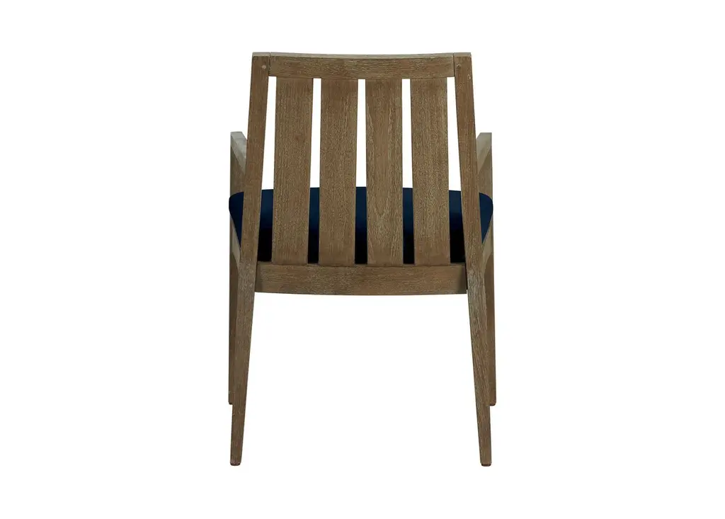If you’re looking for a modern teak outdoor armchair, look no further! Our Bridgewater Cove teak outdoor chair with arms, with its sleek, uncluttered silhouette, adds a striking finishing touch to your alfresco dining ensemble. Its style is simple but unmistakable nonetheless, with a unique narrowing slat back, tapered details, and an amply sized seat with durable, comfortable cushions. Coordinate it with our Bridgewater Cove dining table and side chairs for a stand-out alfresco dining look—or bring it indoors! Its sophisticated style is that versatile!