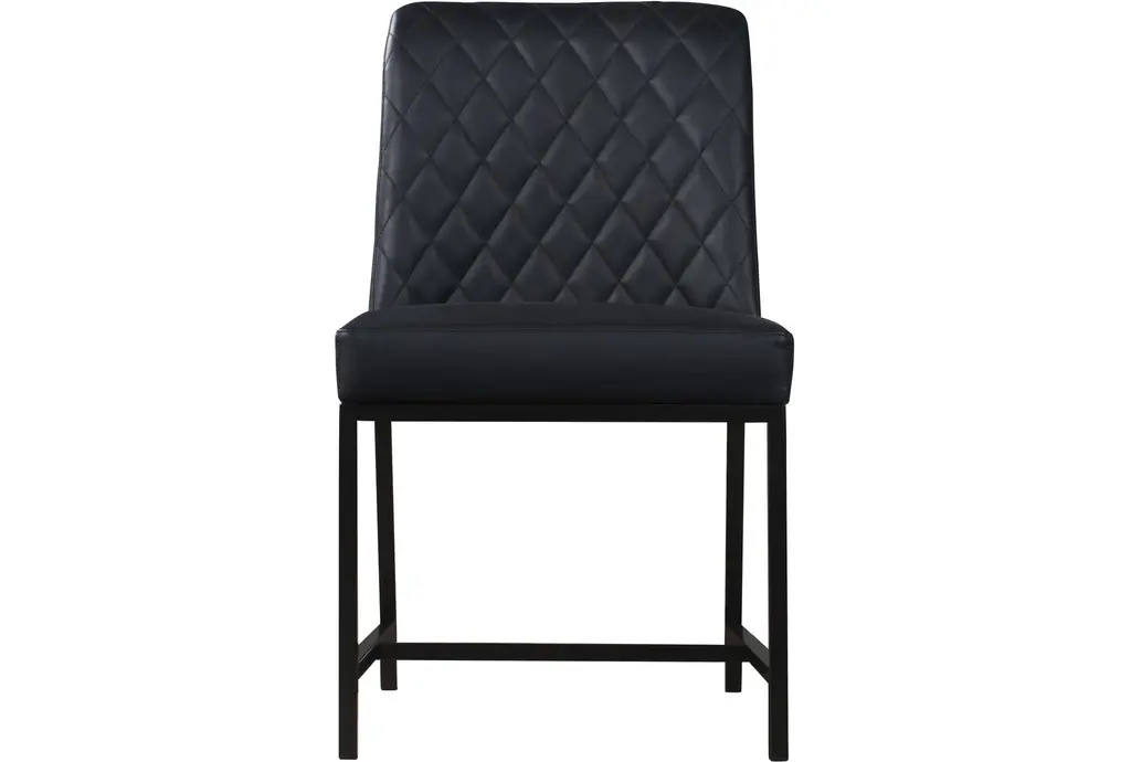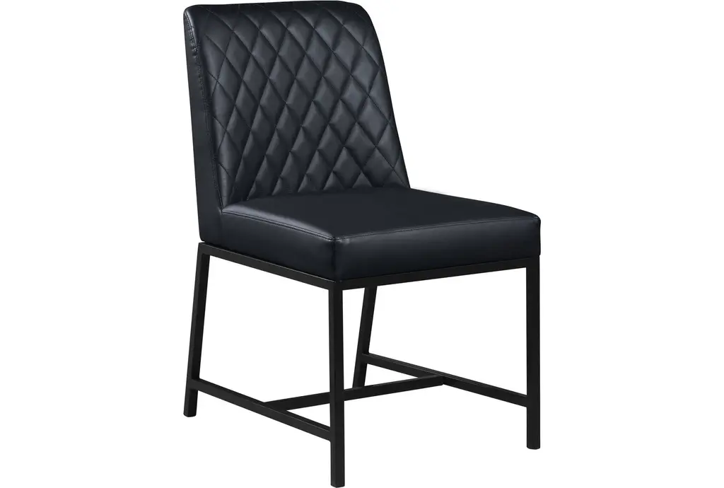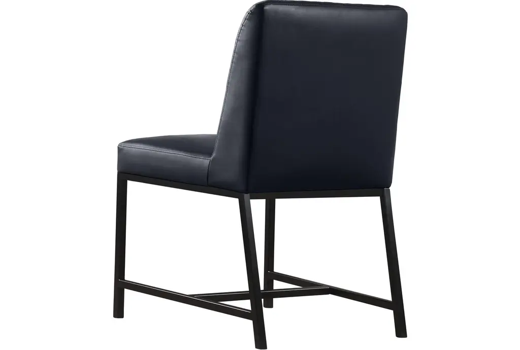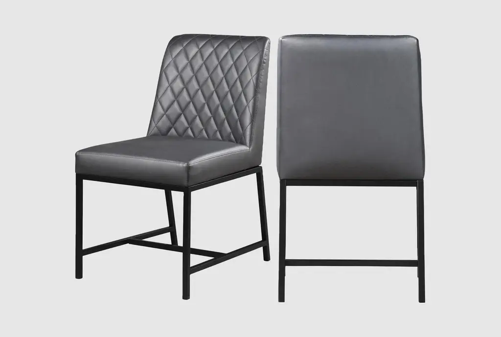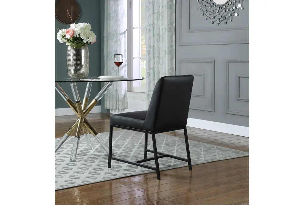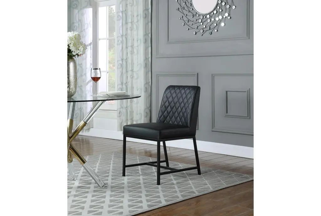Enhance your dining experience with the Brine Black Vegan Leather Fabric Dining Chair Set. Designed in a modern style, these chairs combine comfort with sophistication. The matte black leg finish adds a sleek touch to any dining room setting.