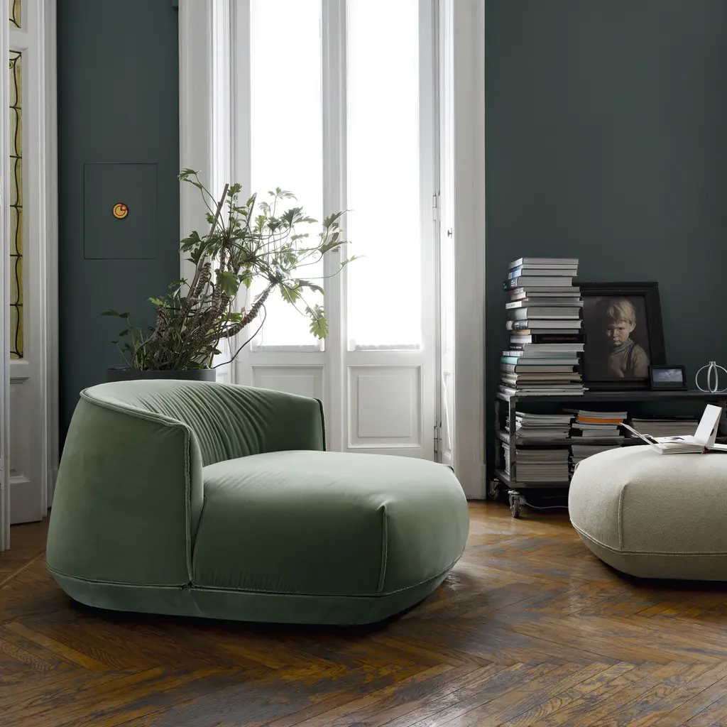 Inspired by the archipelago in the Adriatic Sea of the same name, Brioni is a collection of seats comprising lounge armchairs, daybeds and poufs with a soft and full appearance. Initially designed for outdoor use, the six items in the Brioni collection have been redesigned by LucidiPevere for use in homes: the entire surface of the seat is now covered in fabric or leather, without the dark lower band that prevented contact with the ground. It has a zip, an aesthetic and functional detail, like the previous version, as well as soft polyester padding with plastic slats. Light and easy to move, the poufs are perfect when positioned next to the sofa, whereas the armchairs and daybeds are comfortable and versatile seats that invite you to relax.