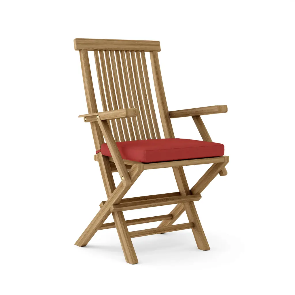 The Bristol Teak Outdoor Dining Chair with Arms is a very sturdy, versatile side chair making the perfect complement for outdoor teak dining tables. This chair requires no assembly and can easily fold for moving and storing so you can accommodate guests when you need to, or store the set away when you don't. Made from solid teak wood coated in a waterbased sealer, it provides added weather protection from the outdoor elements of rain, hail, and shine. Set includes 2 dining armchairs