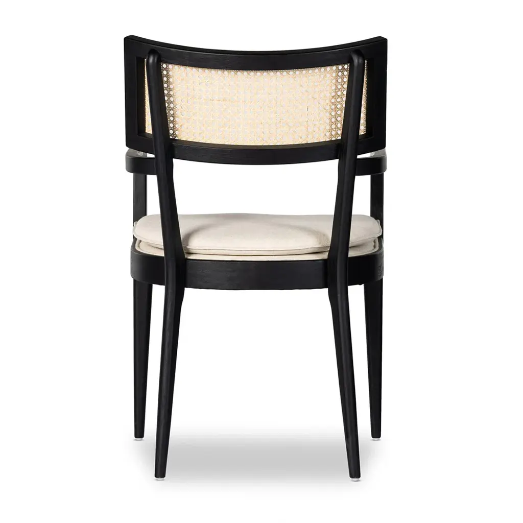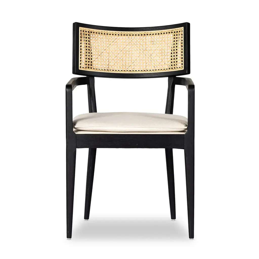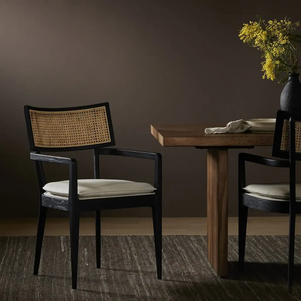 Mixed materials refresh retro dining style. Ebony-finished nettlewood frames a textural inlay of natural cane, with Velcro-fastened high-performance seating. Performance fabrics are specially created to withstand spills, stains, high traffic and wear, ensuring long-term comfort and unmatched durability. Ships In 10-14 Business Days Natural cane back Performance fabric This image is for illustrative purposes only. The colors shown are accurate within the constraints of lighting, photography, and the color accuracy of your screen.