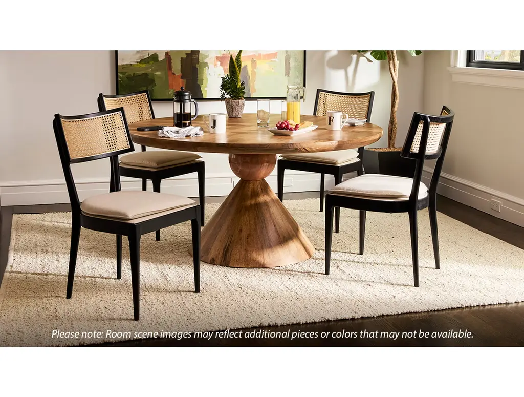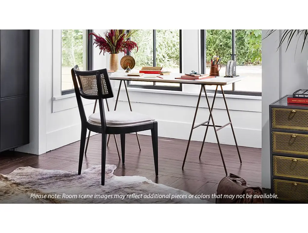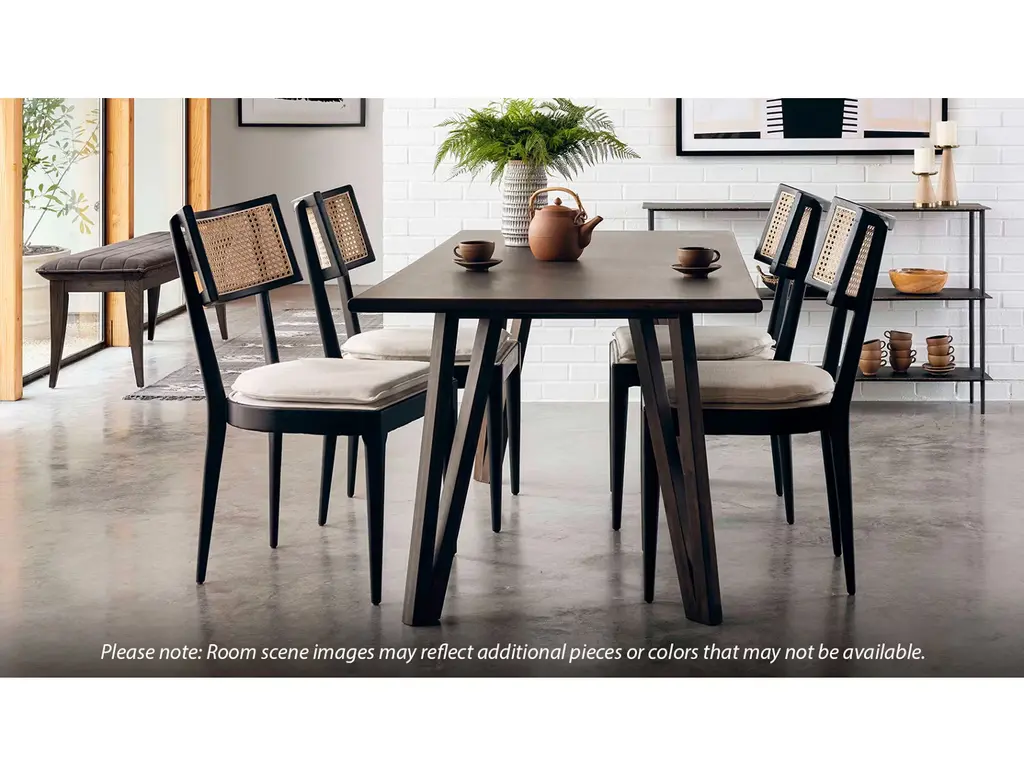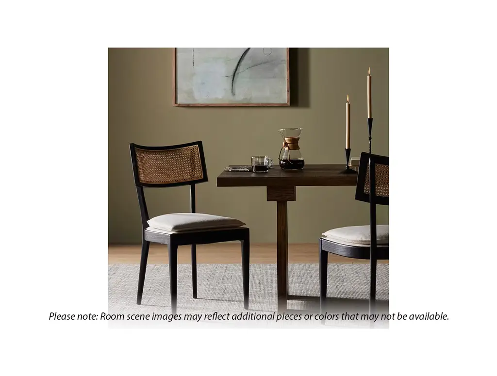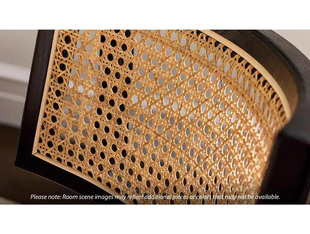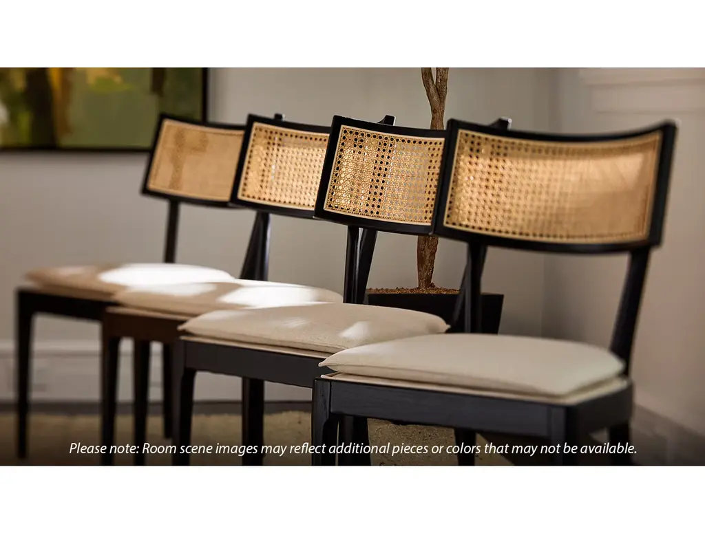 Sleek lines and gentle curves define the Britt Dining Chair from Four Hands Furniture. This traditional-style two-tone chair features a brushed ebony finish with elegantly tapered legs. The curved backrest features a British cane inset framed in ebony, and the seat cushion offers additional comfort while you dine.