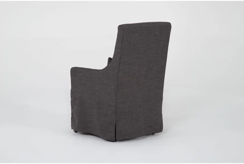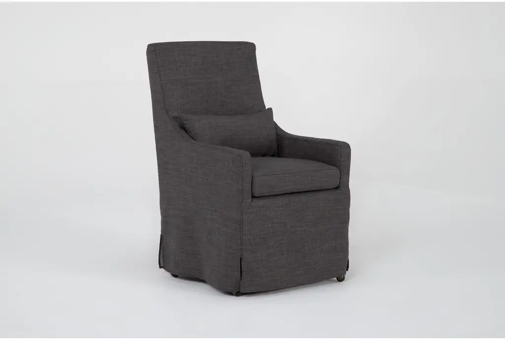 Experience comfort and style with the Broadway Charcoal Dining Arm Chair With Wheels. This traditional dining chair features a charcoal fabric upholstery, providing a classic and timeless look for your dining room or kitchen. Designed with functionality in mind, the chair includes arms and rolling wheels for easy mobility.