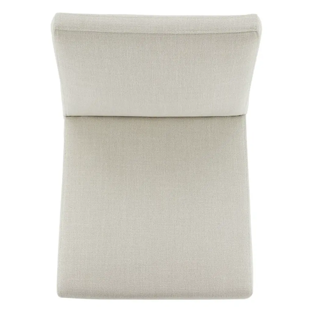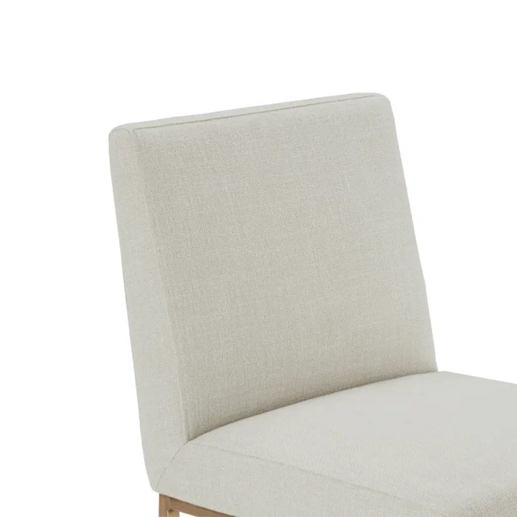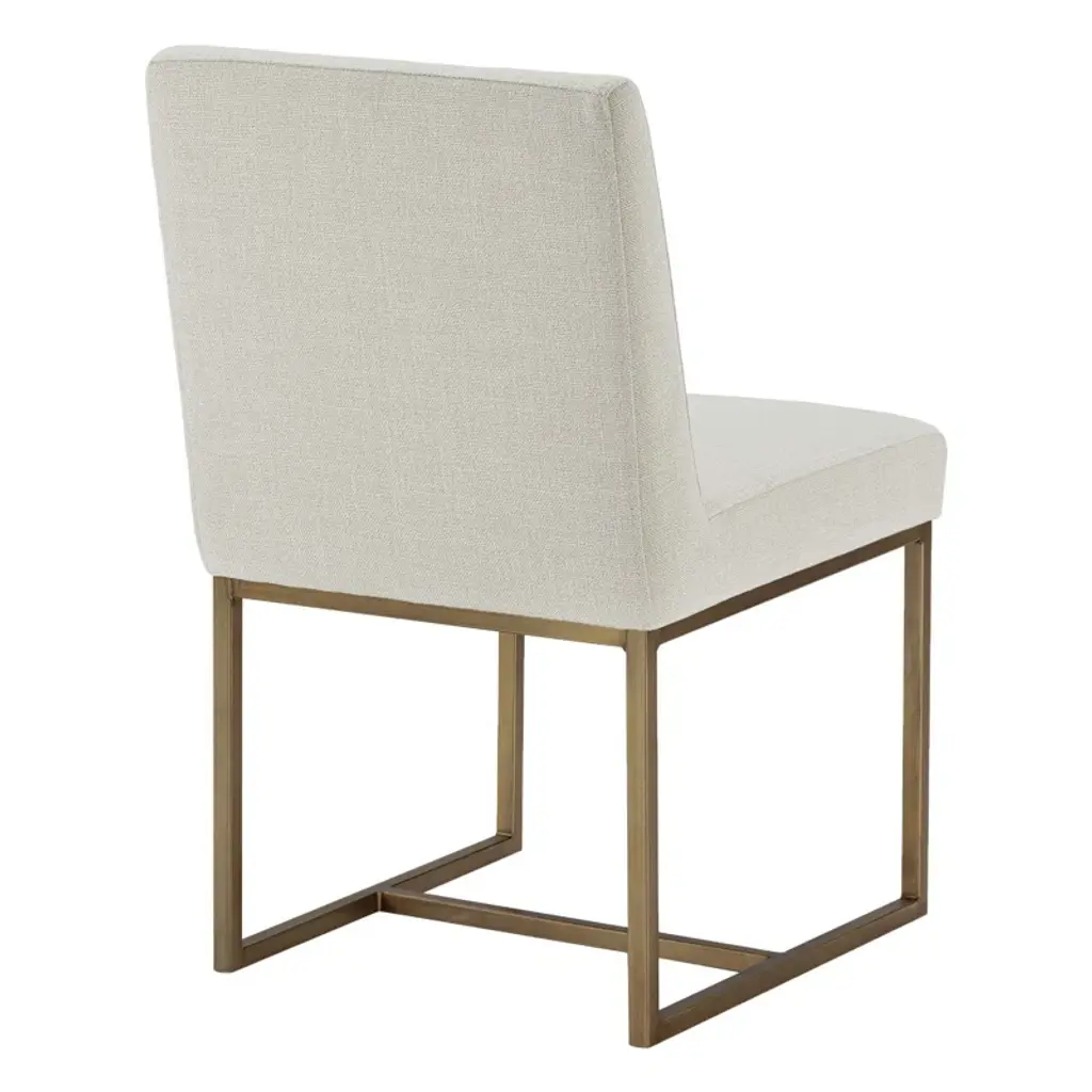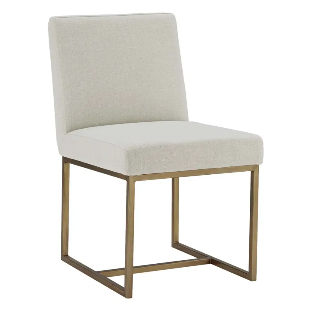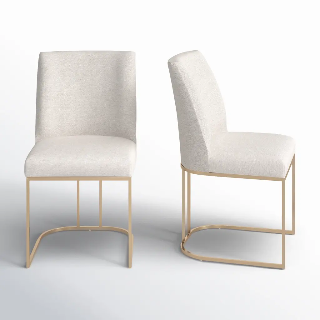 Contemporary seating. Our pair of side chairs effortlessly blends sophistication and function, giving you extra seats around your dining table or in your conversation area. The frames are padded with foam and wrapped with performance fabric, and they rest on metal sled legs with a bold brass finish for a distinctive design. A stretcher bar connects the base for extra stability.