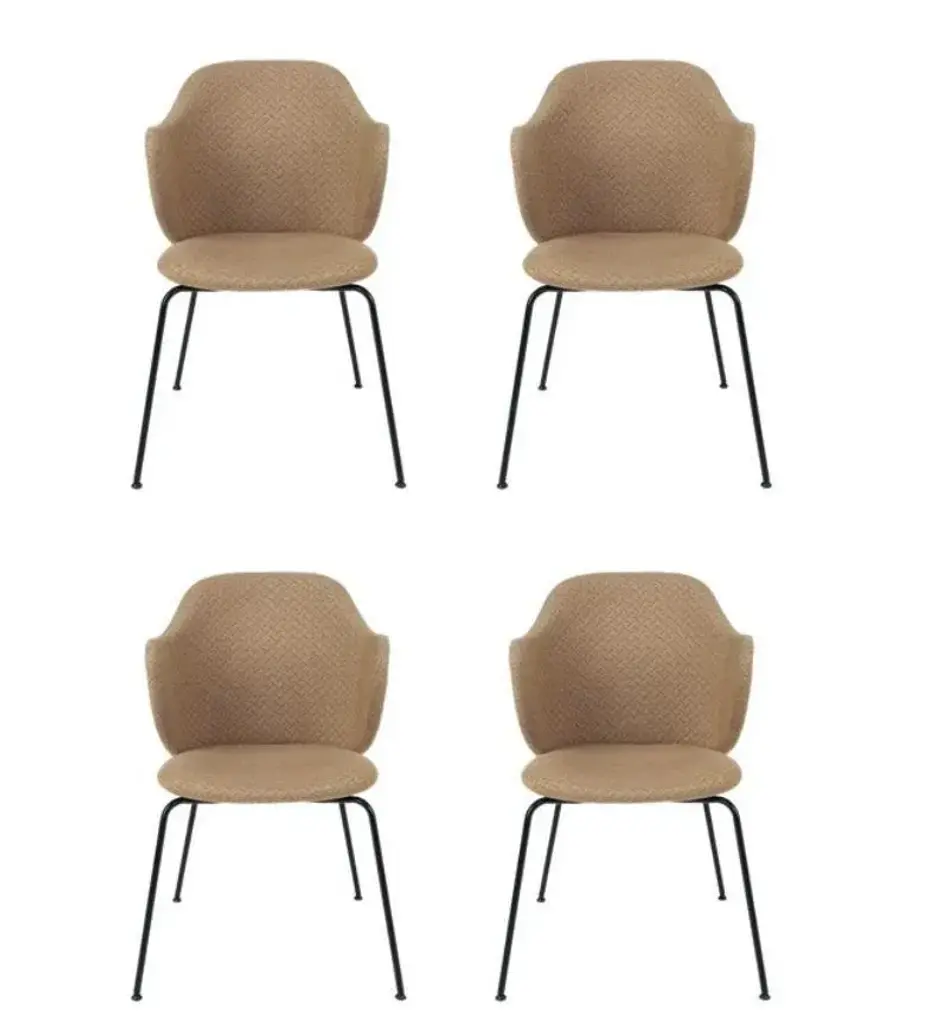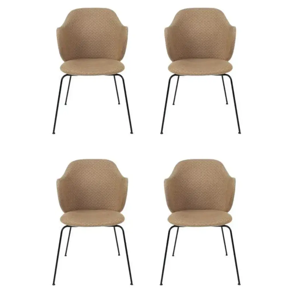 Set of 4 brown Jupiter Lassen chairs by Lassen. Dimensions: W 58 x D 60 x H 88 cm. Materials: Textile. The Lassen Chair by Flemming Lassen, Magnus Sangild and Marianne Viktor was launched in 2018 as an ode to Flemming Lassen’s uncompromising approach and special feel for detail, aesthetics, quality and form. The upholstered seat and back is placed on a geometric frame in powder-coated black metal and the dining chair embraces one’s body, letting you sit comfortably for hours on end.