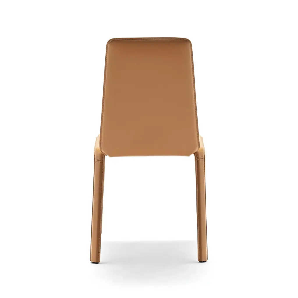 Ande is a dining chair with a slightly padded seat and backrest, fully upholstered in full-grain leather. The legs, made of steel, are also completely covered in full-grain leather. With its soft yet bold lines, the chair offers comfort and elegance. The craftsmanship and careful selection of materials truly enhance its design.