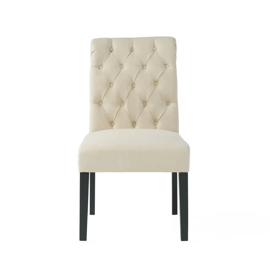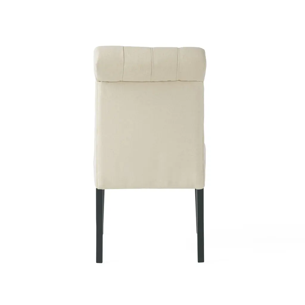 Upgrade your living room or dining room space with a splendid set of chairs that will instantly transform your decor. With an elegantly rolled top, these dining chairs will be a beautiful contemporary addition that will add luxury to your interior space. Featuring clean, straight lines contrasted by gentle curves, these chairs offer plush upholstery with button tufting and diamond stitch accents for immaculate texture and design. Finished with complementing tapered wood legs, our chair set will bring your home to the next level of sophistication Contemporary Design These dining chairs feature a contemporary design that combines modern aesthetics with comfort and functionality. The button tufted diamond stitching and rolltop backrests contribute to the overall contemporary look, creating a stylish and sophisticated piece of furniture for your dining space Plush Upholstery The chairs are upholstered in plush fabric, offering a luxurious and comfortable seating experience Sturdy and Durable The rubber wood leg dining chair is able to withstand daily use and heavy pressure, not easily deformed or damaged Sturdy and Durable The seat and back cushions are filled with high-quality foam, providing a soft and rich sitting feeling Design The high elasticity of the dining chair provides individual support according to body curves and weight distribution, providing comfort and lumbar supportTechnical Details Color NaturalProduct Dimensions 29.25"D x 21.25"W x 37.25"HBack Style Solid BackRoom Type Dining RoomCountry of Origin China With elegantly rolled Top and Tufted features, these Ivory dining chairs are suitable for most any decor. Set includes: two dining chairs Materials: Sturdy hardwood, linen color: Ivory These chairs feature Ivory linen upholstery with complementary Espresso Stained legs.