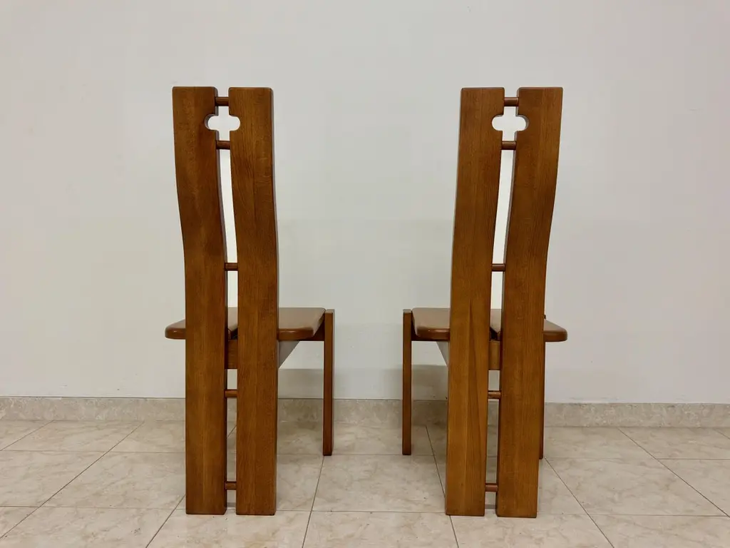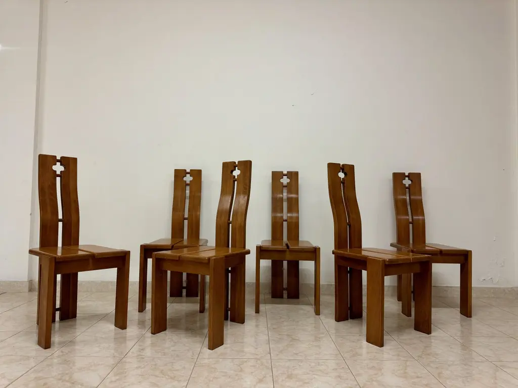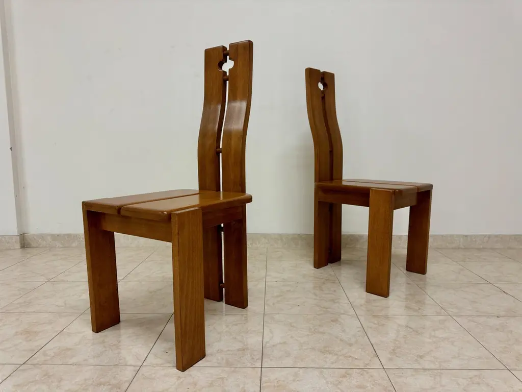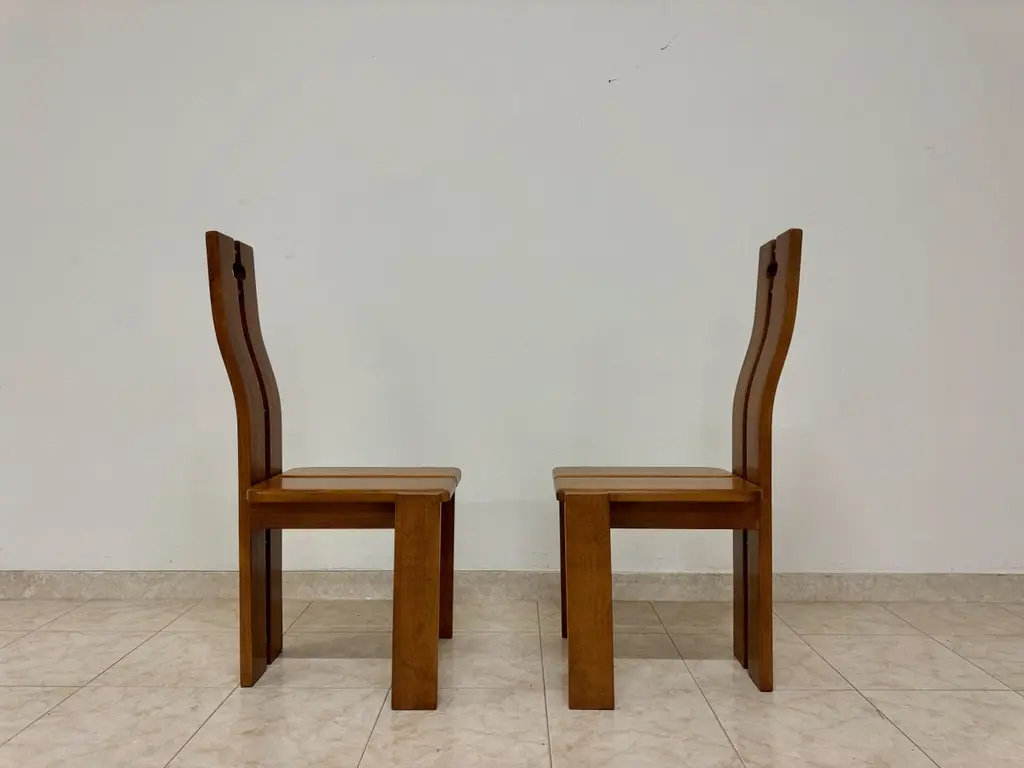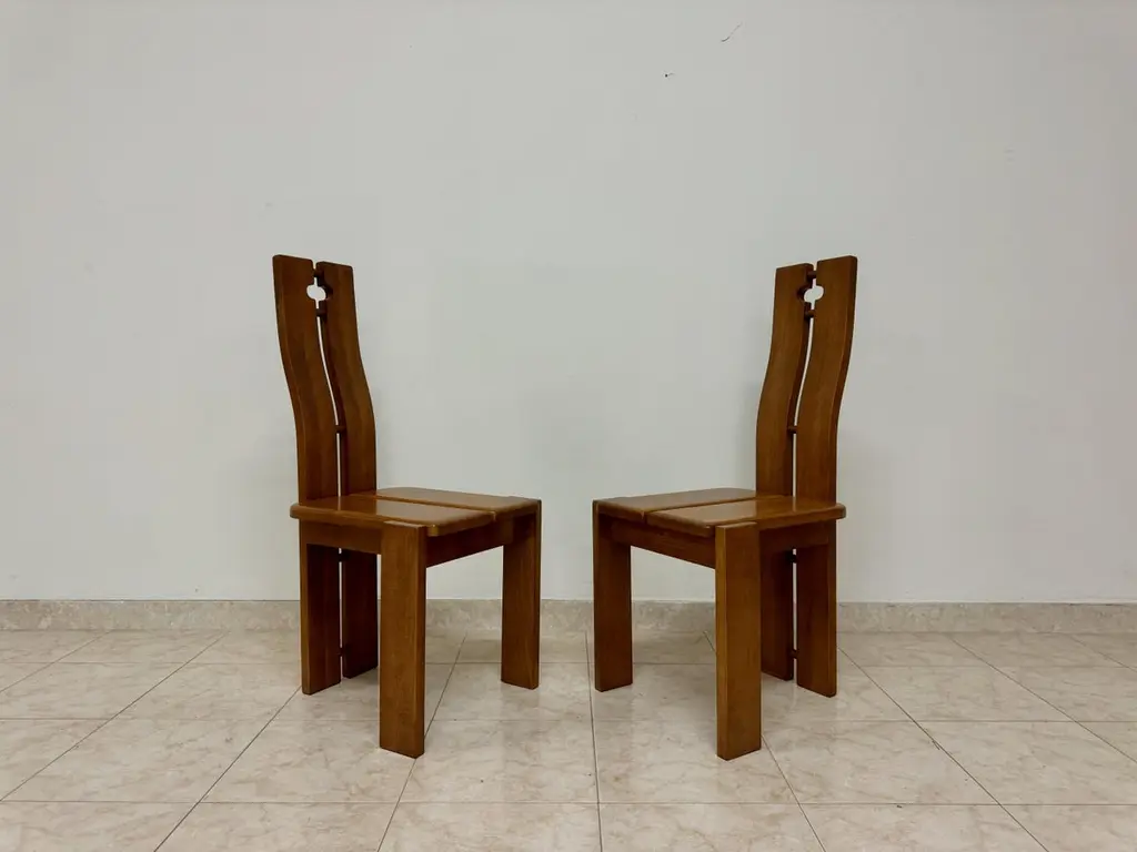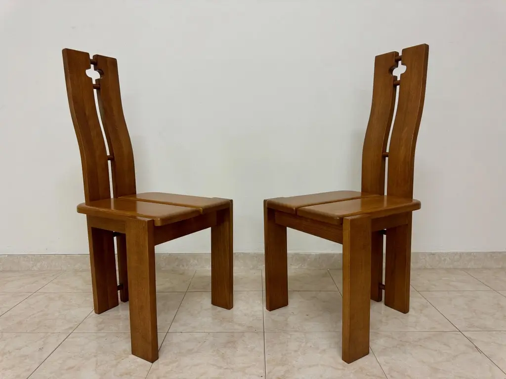Dining chairsBrutalist styleWalnutMade in ItalySeat height 44cmPrice is per chair and can be ordered in any quantity.These contemporary Italian dining chairs are a striking embodiment of minimalist elegance and robust design, reflecting a Brutalist influence. Crafted from high-quality wood, the chairs feature a solid construction that ensures durability and stability. The warm, natural wood finish accentuates the grain, adding a touch of organic beauty to their geometric form.Each chair showcases a tall, slightly curved backrest, providing ergonomic support for comfortable dining experiences. The distinctive cut-out design near the top of the backrest adds a unique architectural element, enhancing their visual appeal and creating a focal point in any dining room.The wide, flat seats are designed for comfort and practicality, seamlessly blending form and function. The substantial, squared legs contribute to the chairs' sturdy appearance while maintaining a clean and modern silhouette.These dining chairs are perfect for those who appreciate contemporary design with a nod to classic craftsmanship. They can effortlessly complement various interior styles, from modern and industrial to eclectic and rustic, making them a versatile addition to any dining space.