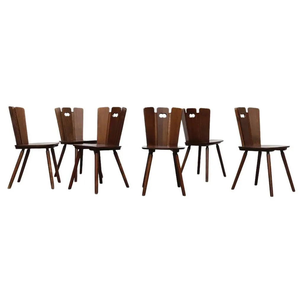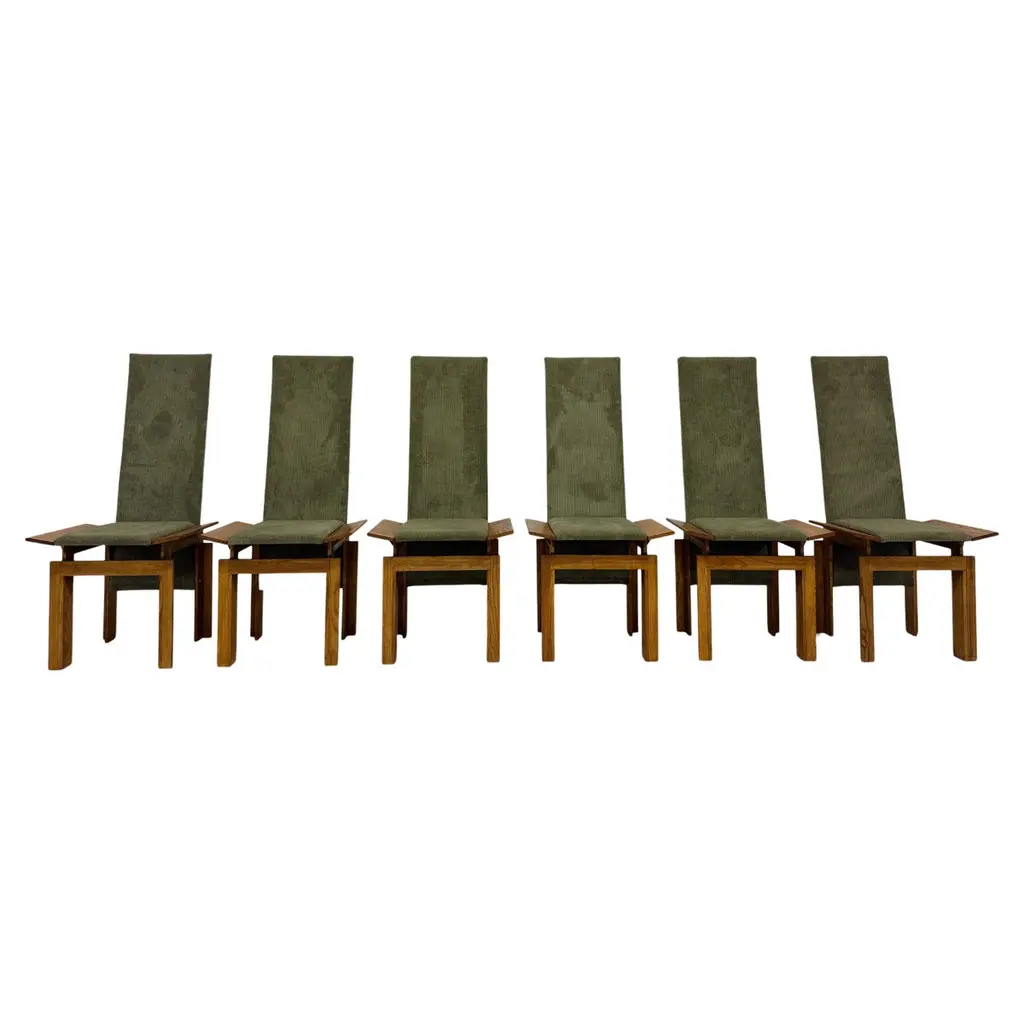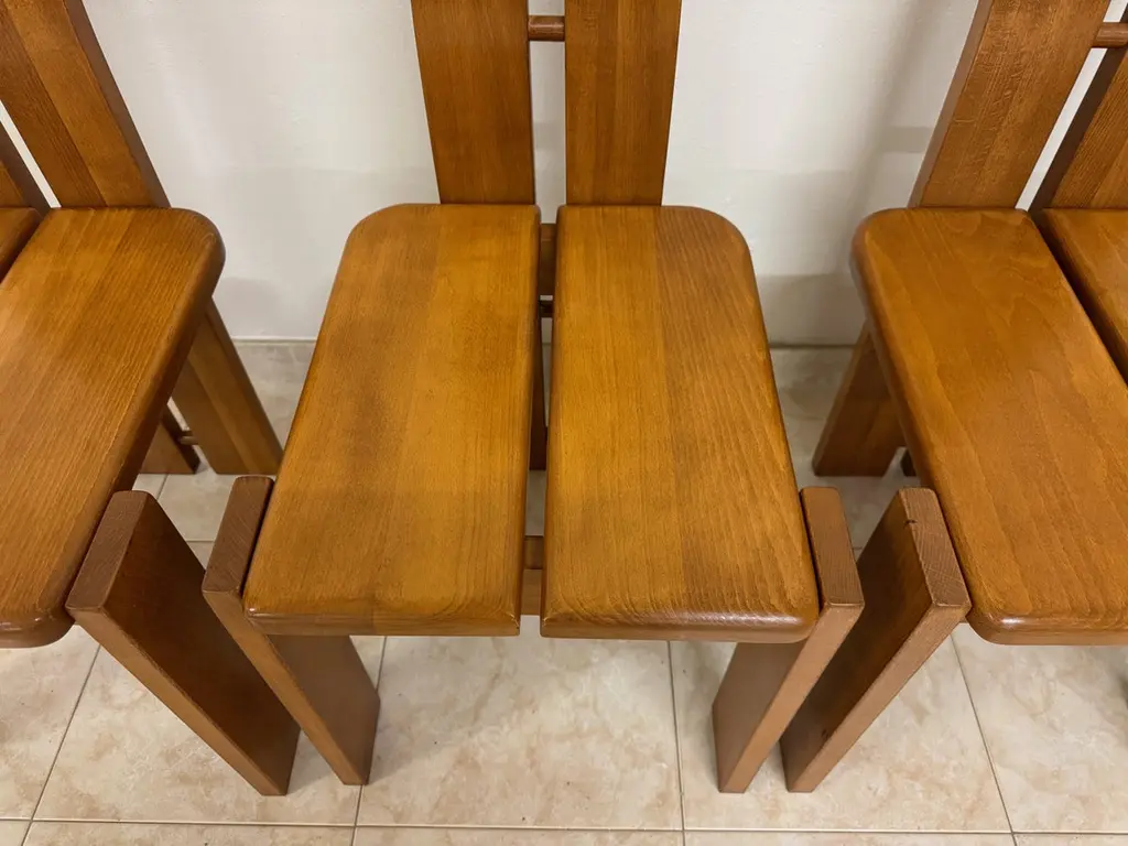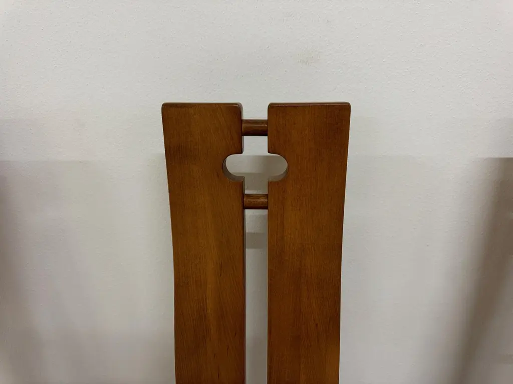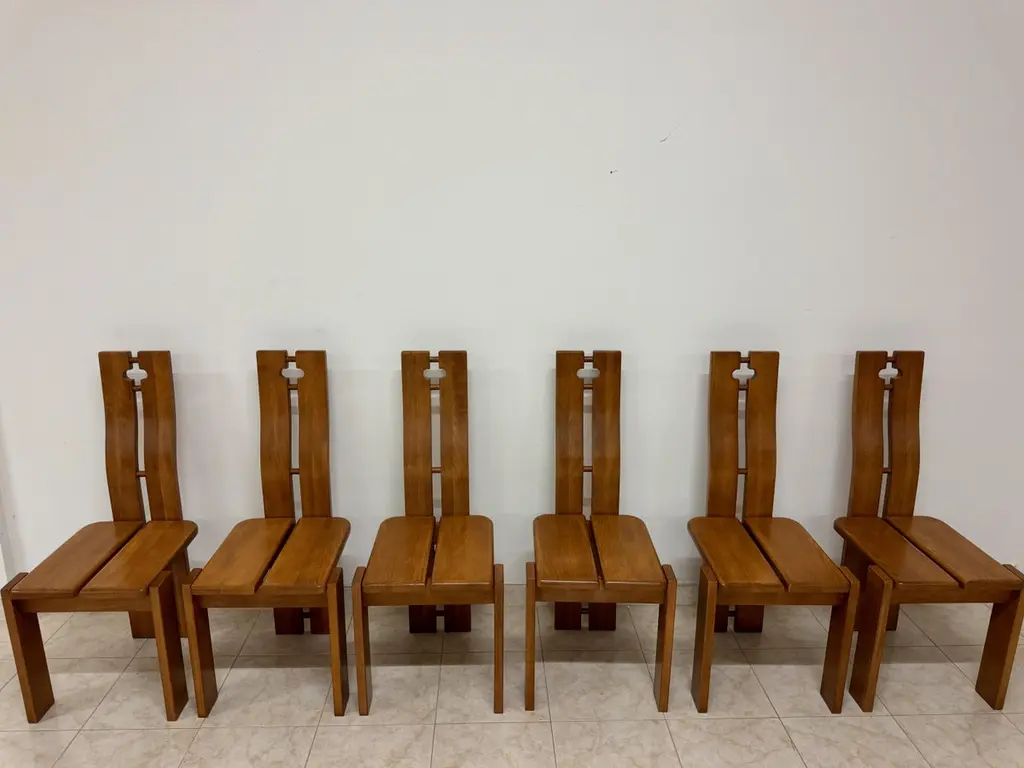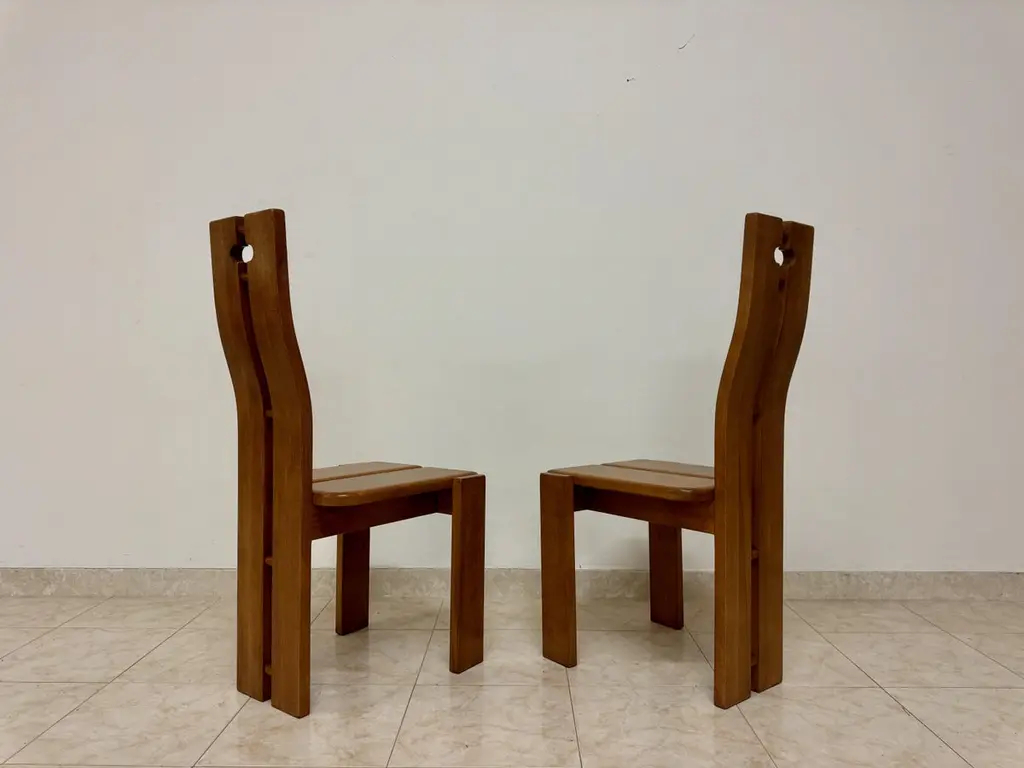 Dining chairsBrutalist styleWalnutMade in ItalySeat height 44cmPrice is per chair and can be ordered in any quantity.These contemporary Italian dining chairs are a striking embodiment of minimalist elegance and robust design, reflecting a Brutalist influence. Crafted from high-quality wood, the chairs feature a solid construction that ensures durability and stability. The warm, natural wood finish accentuates the grain, adding a touch of organic beauty to their geometric form.Each chair showcases a tall, slightly curved backrest, providing ergonomic support for comfortable dining experiences. The distinctive cut-out design near the top of the backrest adds a unique architectural element, enhancing their visual appeal and creating a focal point in any dining room.The wide, flat seats are designed for comfort and practicality, seamlessly blending form and function. The substantial, squared legs contribute to the chairs' sturdy appearance while maintaining a clean and modern silhouette.These dining chairs are perfect for those who appreciate contemporary design with a nod to classic craftsmanship. They can effortlessly complement various interior styles, from modern and industrial to eclectic and rustic, making them a versatile addition to any dining space.
