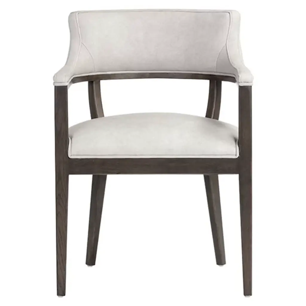 The Brylea Dining Armchair from Sunpan features an elegant open-back design, perfectly blending style and comfort. Upholstered in linoso ivory performance fabric, it offers moisture repellency, durability, and easy maintenance. The exposed ash grey solid oak wood frame adds a sophisticated touch, showcasing the natural beauty of the wood. Due to the organic nature of wood, each piece will display unique variations in texture, color, and grain, along with charming knots and burls that enhance its character and appeal.