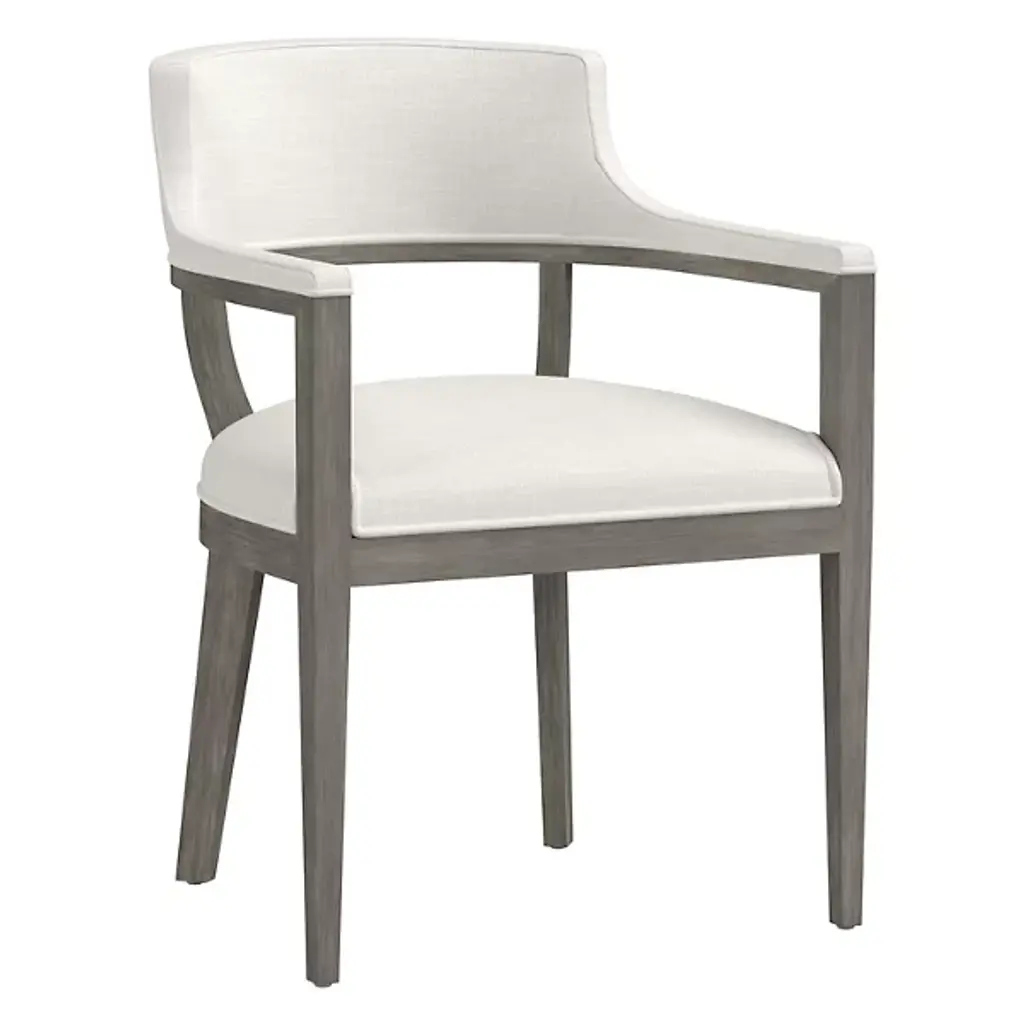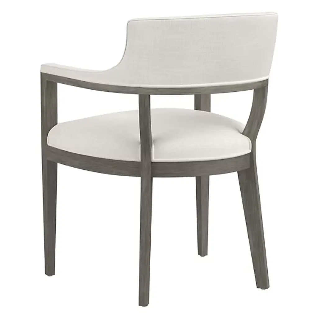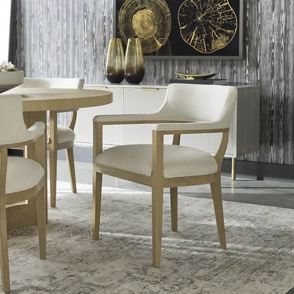 The Brylea Dining Armchair from Sunpan features an elegant open-back design, perfectly blending style and comfort. Upholstered in linoso ivory performance fabric, it offers moisture repellency, durability, and easy maintenance. The exposed ash grey solid oak wood frame adds a sophisticated touch, showcasing the natural beauty of the wood. Due to the organic nature of wood, each piece will display unique variations in texture, color, and grain, along with charming knots and burls that enhance its character and appeal.