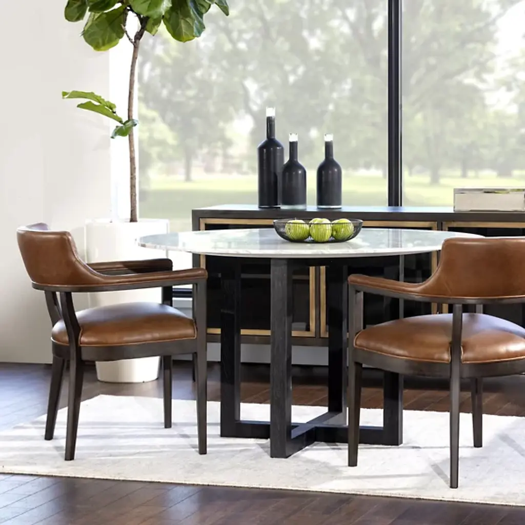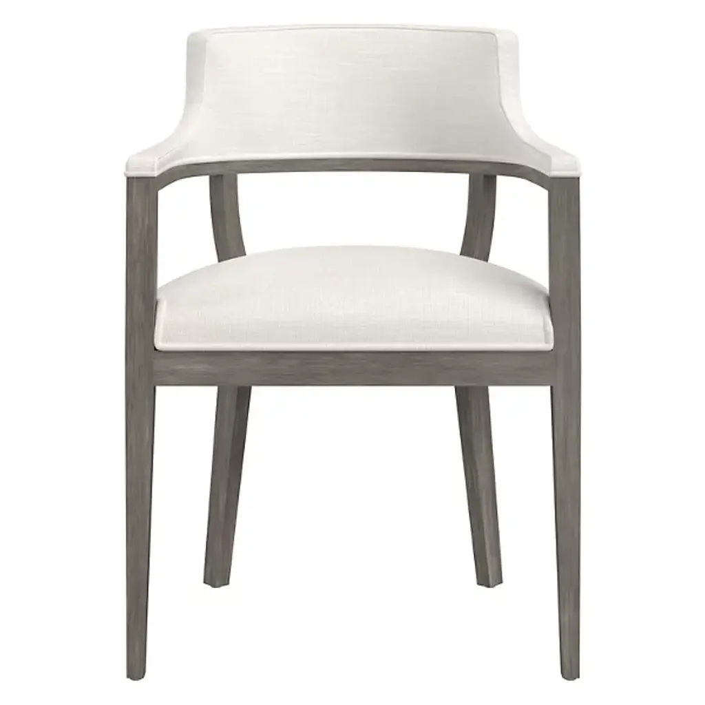 The Brylea Dining Armchair from Sunpan features an elegant open-back design, perfectly blending style and comfort. Upholstered in linoso ivory performance fabric, it offers moisture repellency, durability, and easy maintenance. The exposed ash grey solid oak wood frame adds a sophisticated touch, showcasing the natural beauty of the wood. Due to the organic nature of wood, each piece will display unique variations in texture, color, and grain, along with charming knots and burls that enhance its character and appeal.