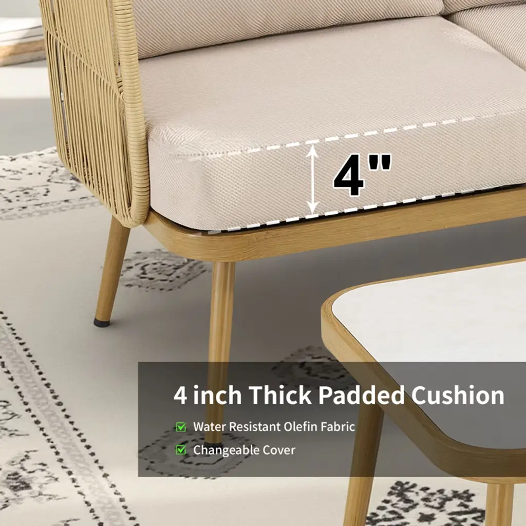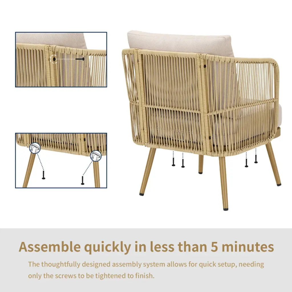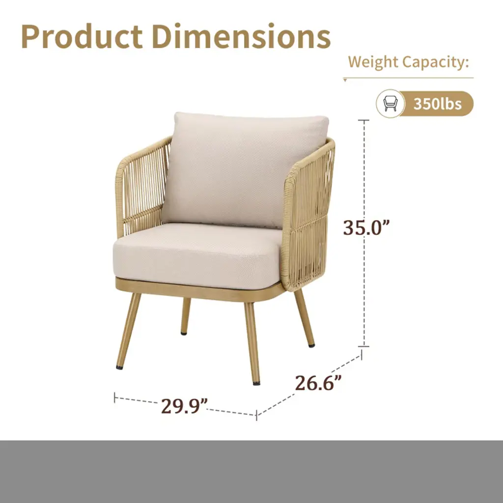 Decorate your outdoor space with this exquisite and elegant patio furniture! The chic and novel look will add a visual focal point to your outdoor space. The widened seat area and curved backrest conform to the curves of the human body, providing a luxurious and comfortable seating experience. Our rattan outdoor furniture frames are crafted from weather- and UV-resistant wicker and heavy-duty powder-coated iron frames, which not only provide a sophisticated and elegant look, but also offer superior stability and durability for years of brand-new appearance. Also, it can be widely used in patios, gardens, decks, and even lawns and poolsides to enjoy cozy conversation times and fun party times with family and friends.