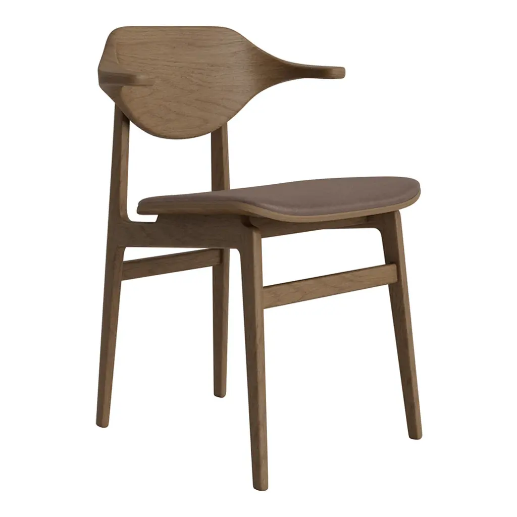 With rich wood grain, the Bufala Chair has a distinctive appearance to match its high-quality, solid-wood construction. The back is made with a special production technique pressing 36 layers of oak veneer in a compression mold, forming the characteristic buffalo horn shape that provides back and arm support.
