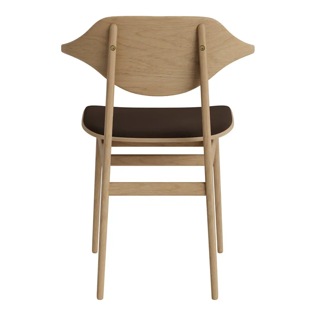 With rich wood grain, the Bufala Chair has a distinctive appearance to match its high-quality, solid-wood construction. The back is made with a special production technique pressing 36 layers of oak veneer in a compression mold, forming the characteristic buffalo horn shape that provides back and arm support.