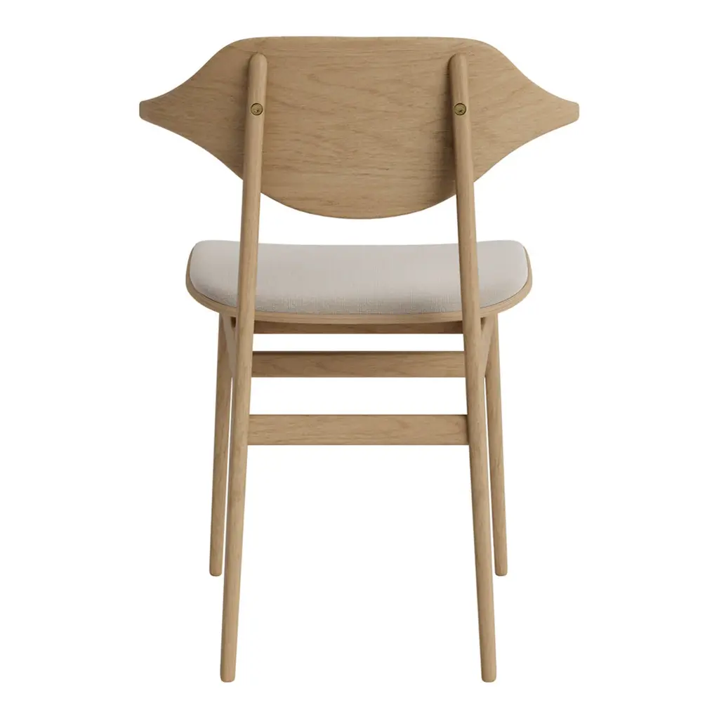 With rich wood grain, the Bufala Chair has a distinctive appearance to match its high-quality, solid-wood construction. The back is made with a special production technique pressing 36 layers of oak veneer in a compression mold, forming the characteristic buffalo horn shape that provides back and arm support.