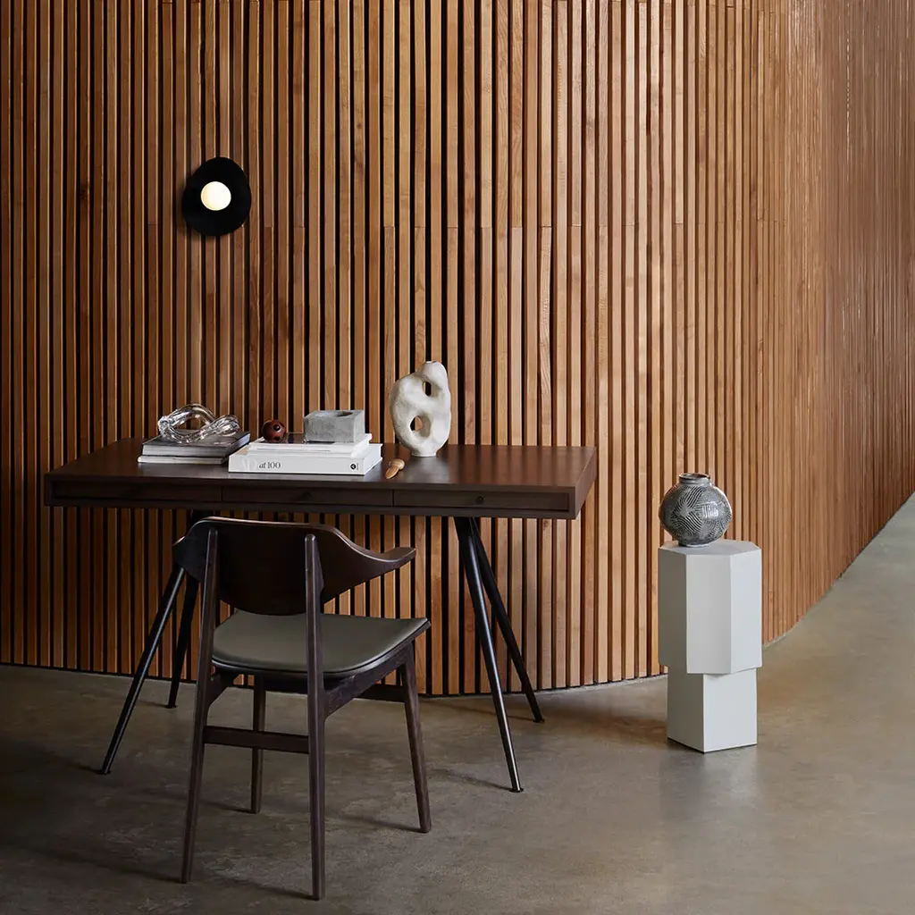 With rich wood grain, the Bufala Chair has a distinctive appearance to match its high-quality, solid-wood construction. The back is made with a special production technique pressing 36 layers of oak veneer in a compression mold, forming the characteristic buffalo horn shape that provides back and arm support.