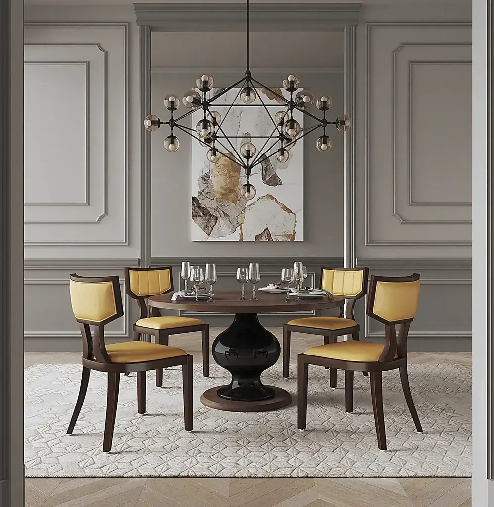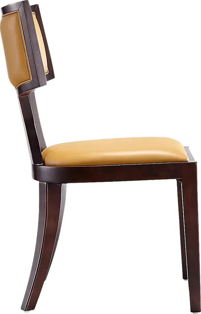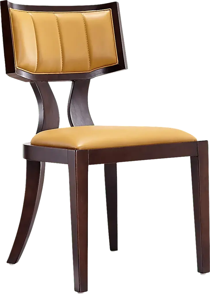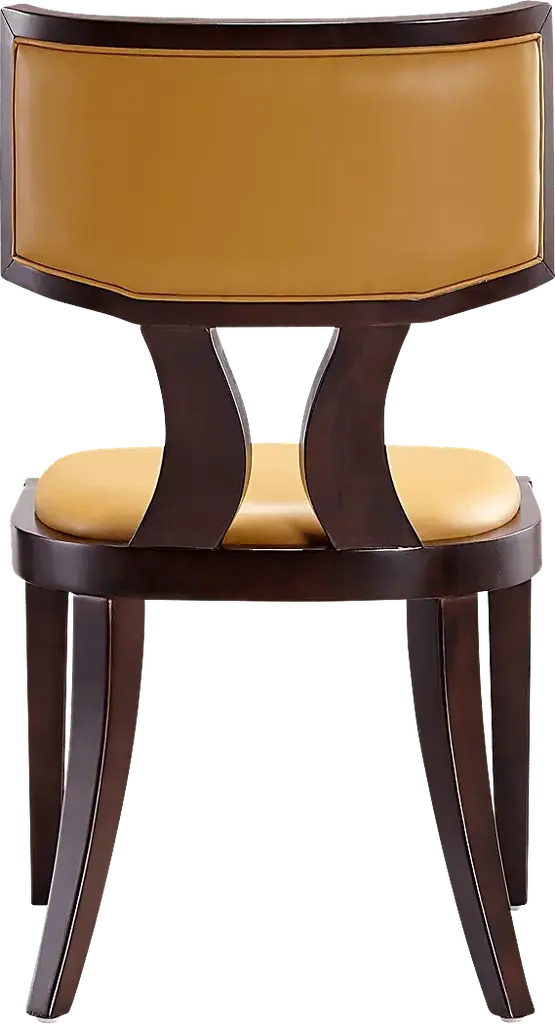 Uniquely sophisticated. Dating back to ancient Greece, the classic klismos style seat gets a fresh update in the Bullnite camel side chair, set of 2. The timeless design is iconic and practical, distinguished by its horizontal back panel and intriguing segmented construction. Fluted accents on tightly upholstered panels contribute a crisp, sophisticated air to its balanced lines. Though austere, its unconventional silhouette is utterly fascinating, delivering a dramatic impact to any dining room.