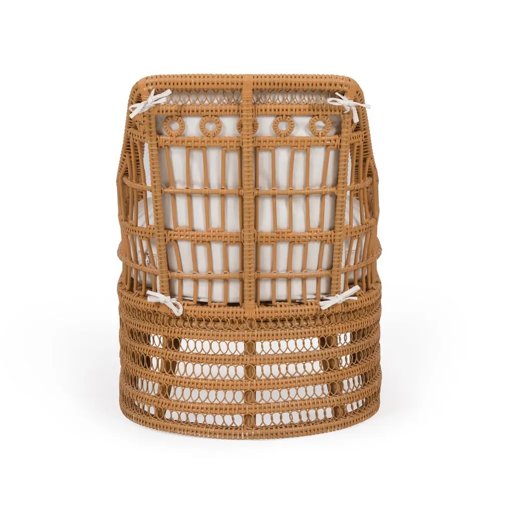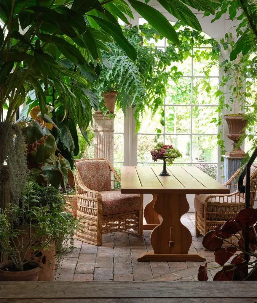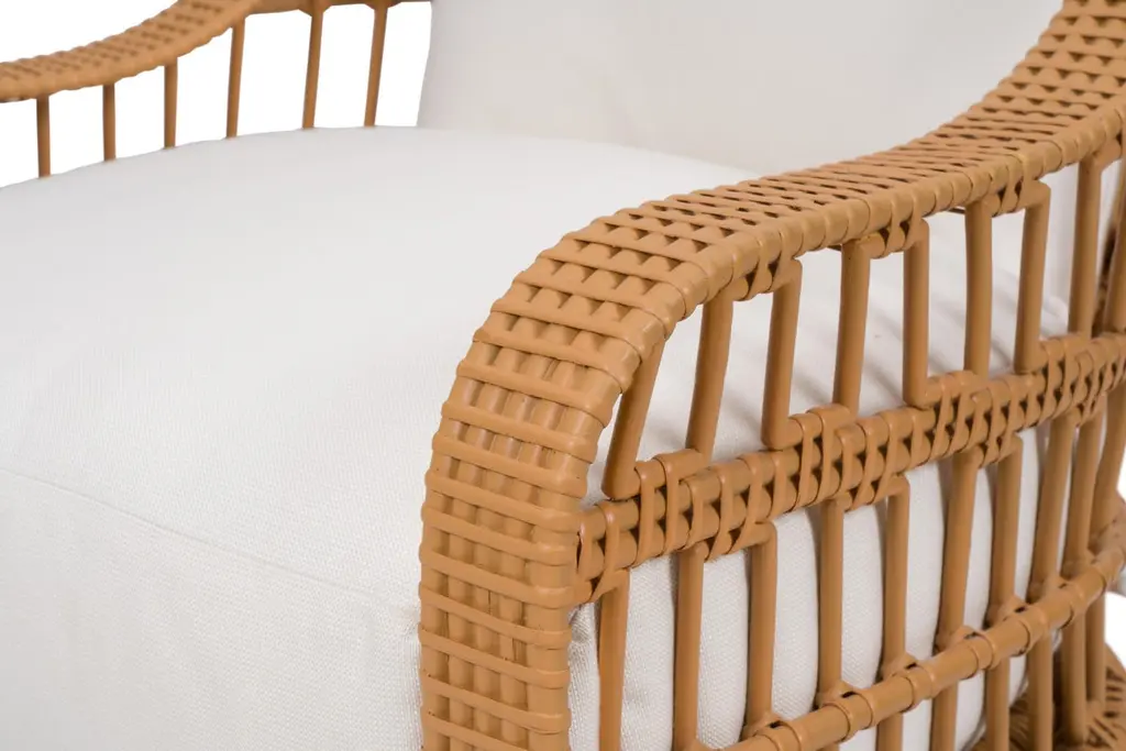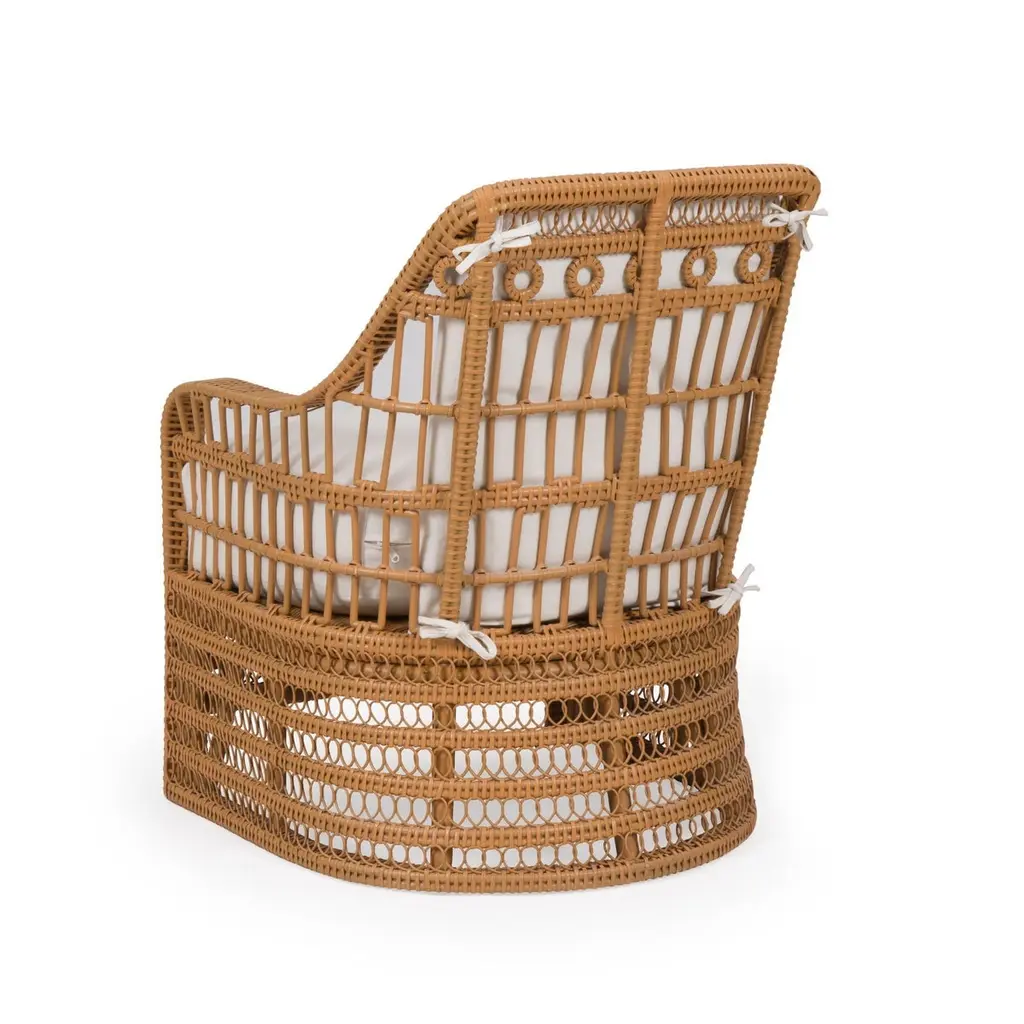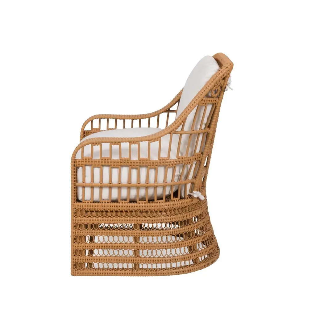 The Carolina dining chair is comfortably upholstered with tie-on seat and back cushions.- Natural rattan is suitable for use indoors or on a covered loggia, porch, or veranda.- Seat and back cushions come ready-to-ship with frames.- Cushions are currently offered in Sunbrella Natte Nature fabric only.