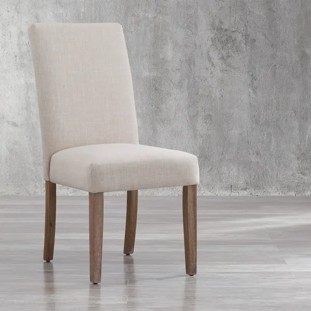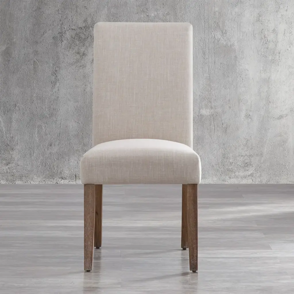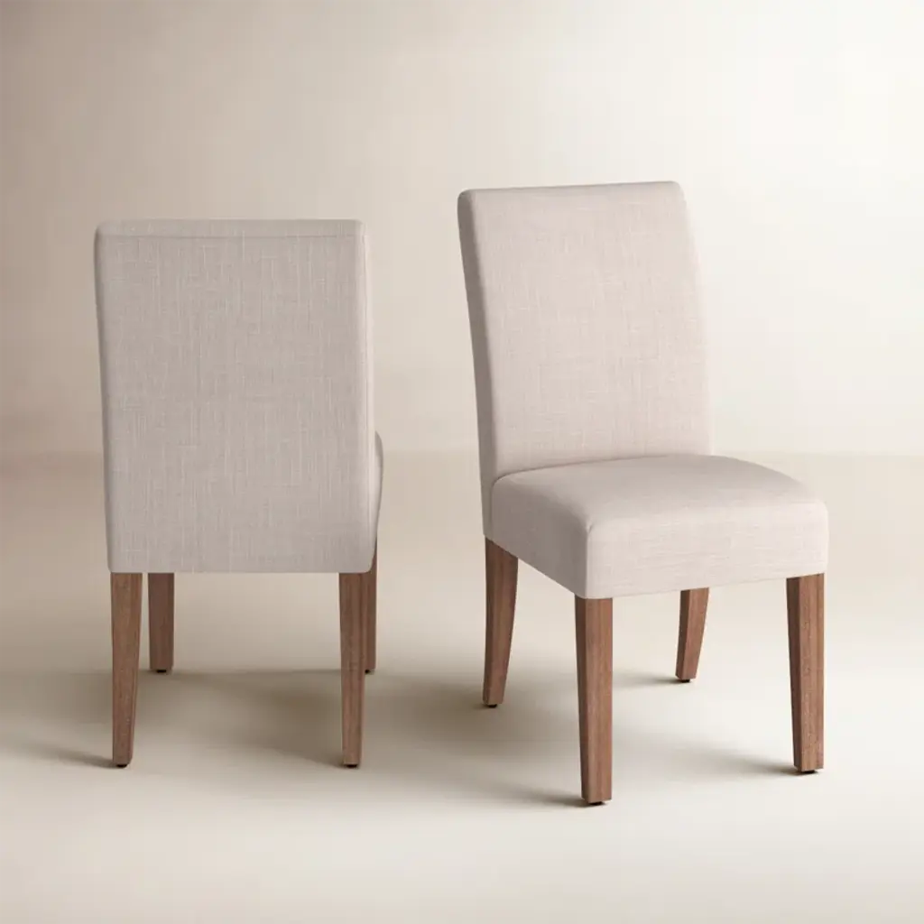 Elevate your dining experience with this set of two parsons chairs, crafted from solid rubberwood for a touch of natural elegance. Upholstered in linen, these chairs offer a cozy seat with foam filling, while the solid back design adds a timeless appeal. The wood grain color variation and scoring give it a rustic flair, making it a great addition to any dining space. Plus, plastic glides on the feet protect your floors from scratches. Just remember to wipe them clean with a damp cloth to keep them looking fresh.