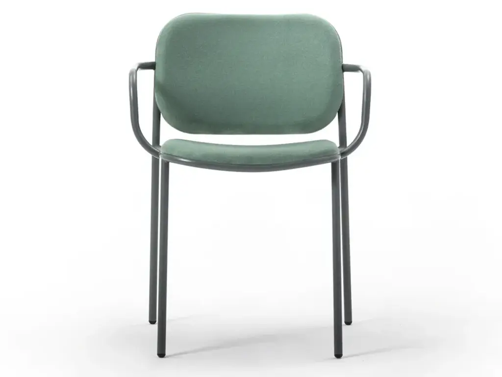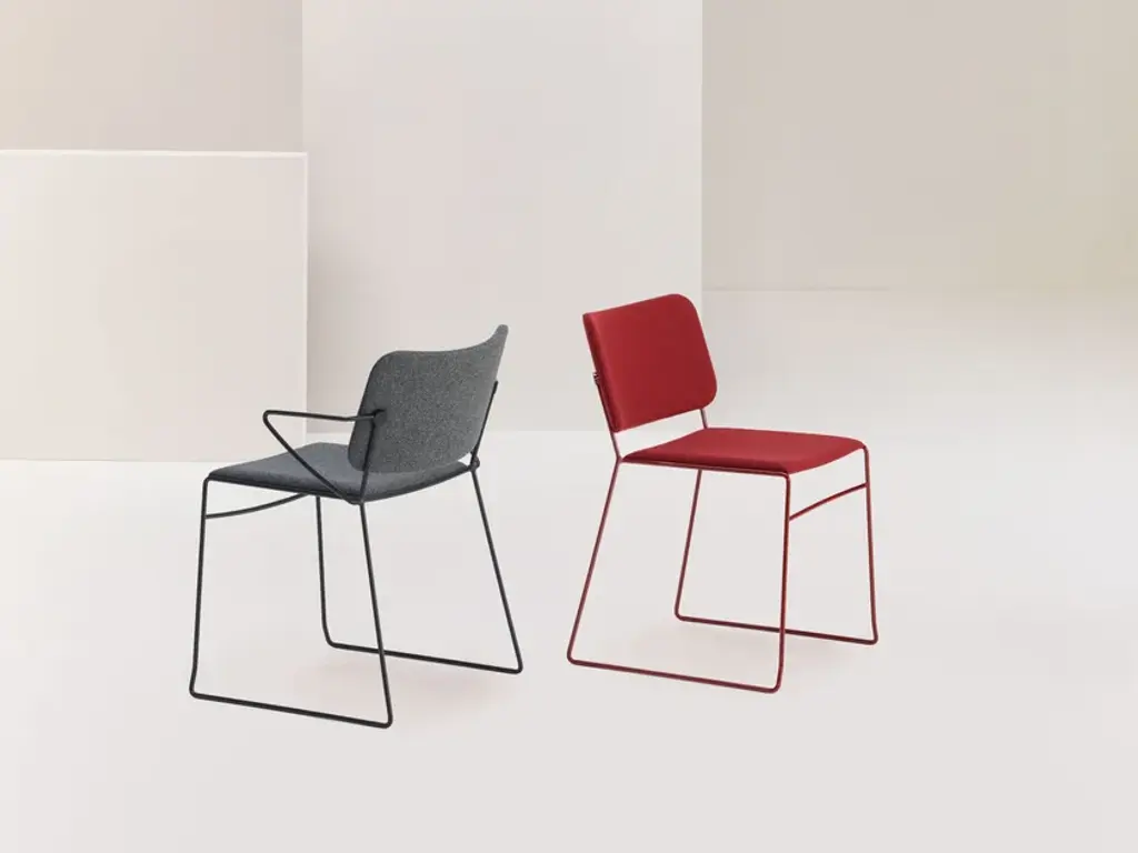 Button Down 7C23 is a sled-base chair with armrests, featuring a steel frame and upholstered seat/backrest.Button Down is a collection defined by the distinctive button-like joint between the frame and backrest—a detail that inspired the name, echoing the timeless elegance of the classic button-down shirt.The slender steel rod frame supports either upholstered or wooden beech or ash seats and backrests, making this a versatile chair well-suited to a variety of contract settings.