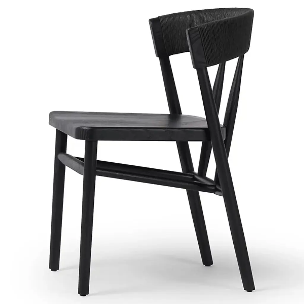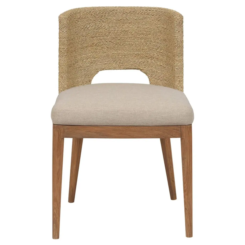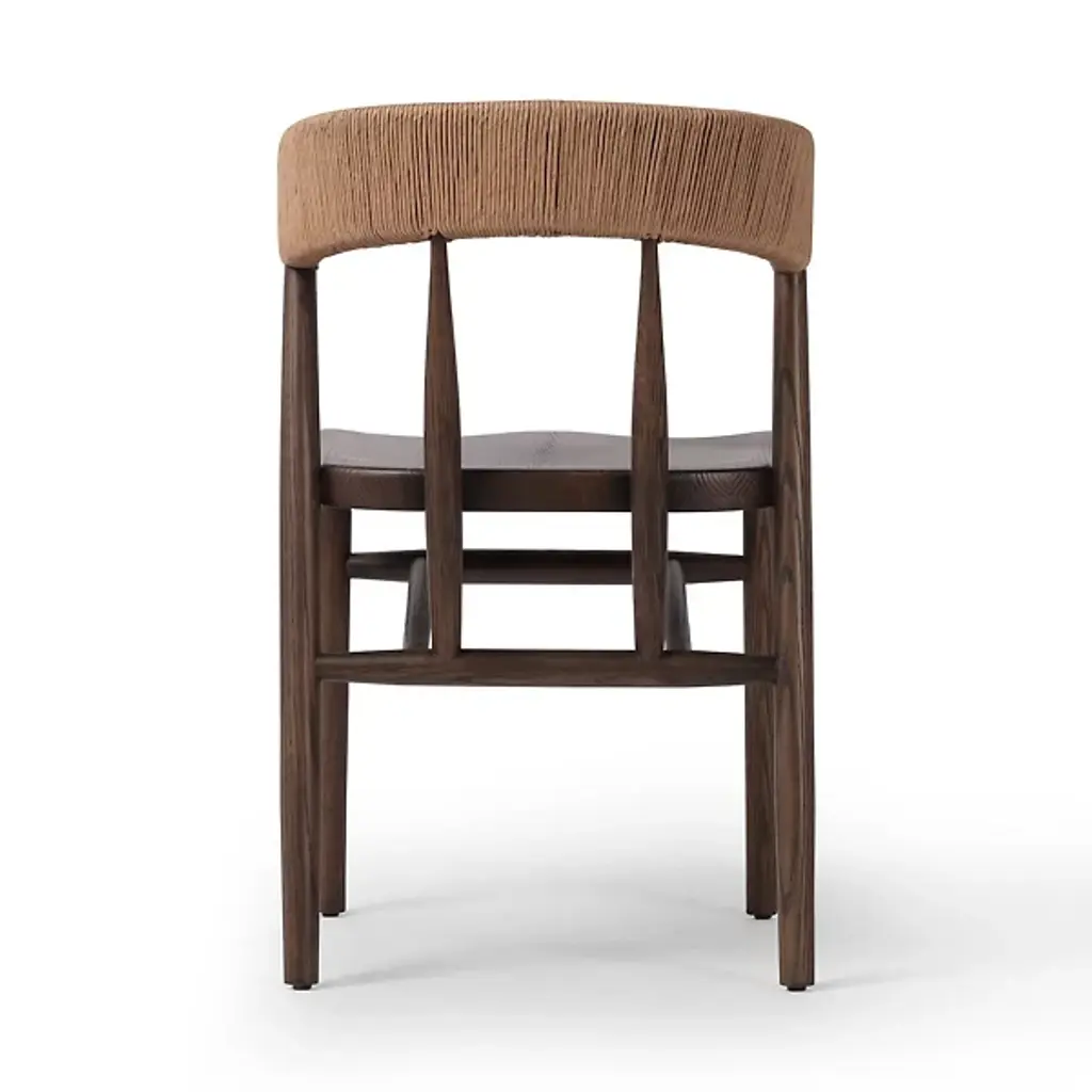 Elevate your dining experience with the Buxton Dining Chair from Four Hands, featuring solid oak construction and tapered legs that offer a fresh twist on the classic whistler chair design. This chair is meticulously finished with a paper rush wrapped detail on the back, adding a touch of rustic charm to its transitional aesthetic. Crafted from high-quality rush and solid oak, it combines modern sophistication with rustic elements, making it a perfect addition to any dining room seeking a blend of timeless elegance and contemporary flair.