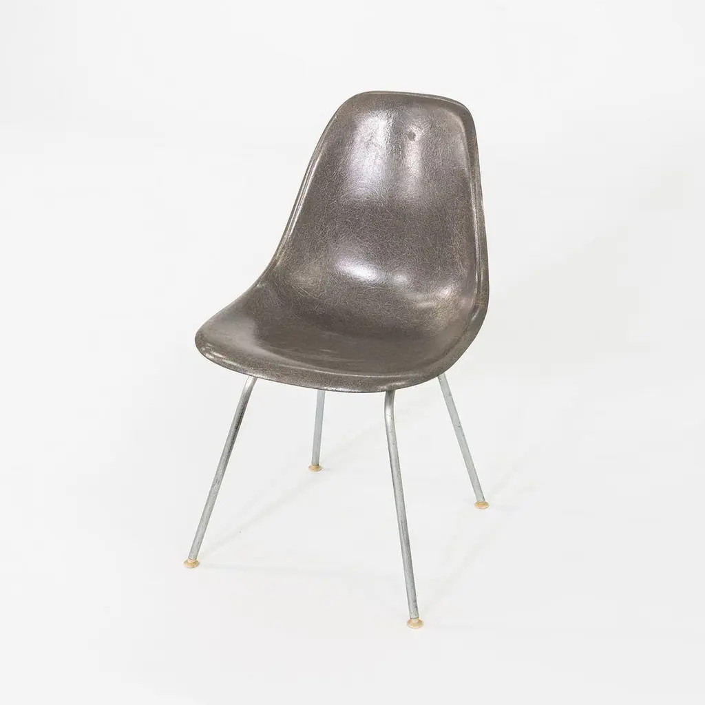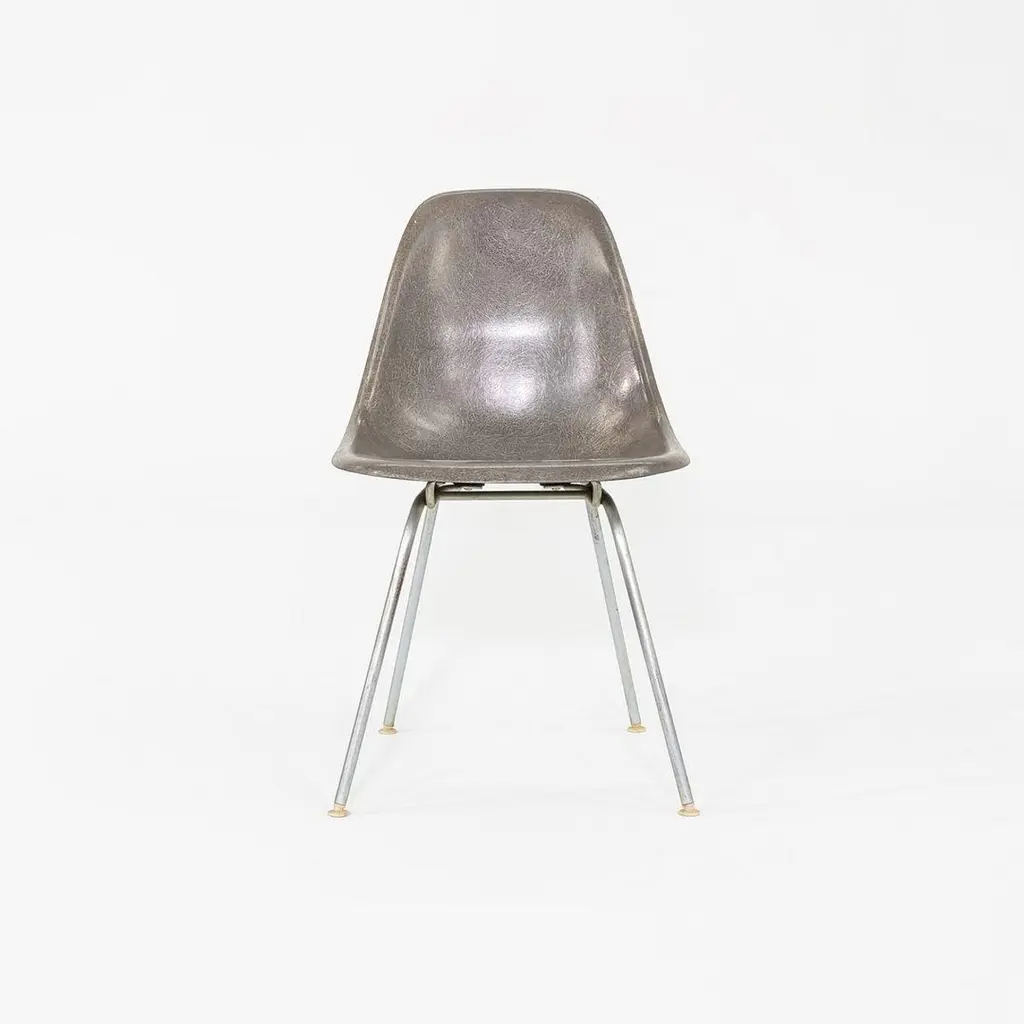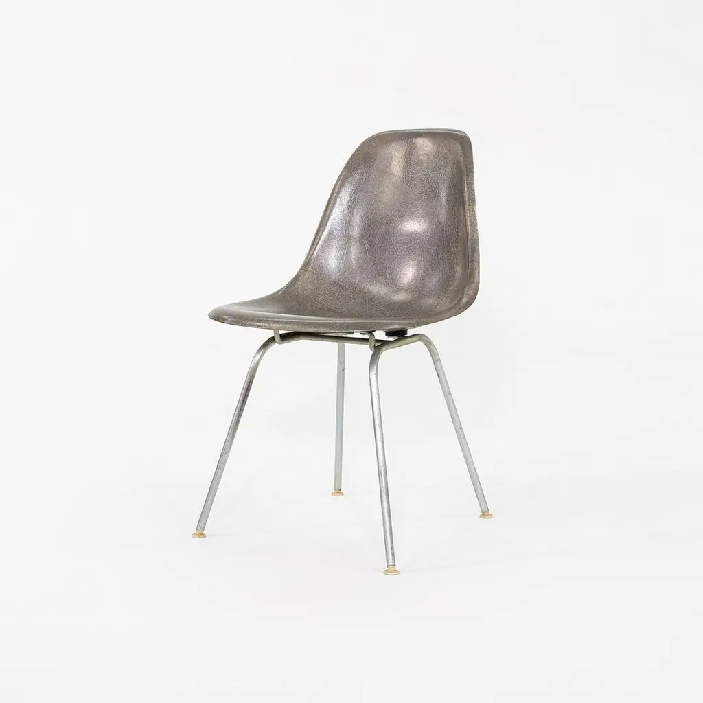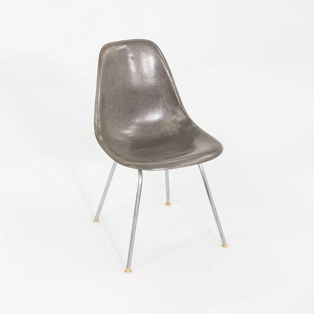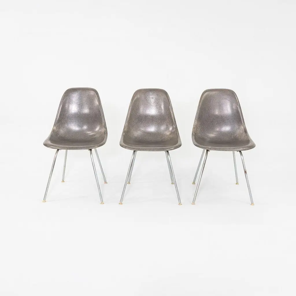 These are Eames DSX side chairs, originally designed by Ray and Charles Eames in the 1950s. These particular examples were produced by Herman Miller in the USA C. 1958. The chairs are comprised of fiberglass shells in elephant hide gray atop a steel chrome H-base. DSX is an acronym for Dining Height Side Chair on X-Base. The acronym stayed the same after they switched production to H-bases from X-bases. The listed price includes one chair and there are three available to purchase. Each DSX chair measures 22 inches deep, 18.5 inches wide, and 31.25 inches high with a seat height of 18 inches. These chairs show wear consistent with expected use, but overall are in very good to excellent condition. Please see photos.