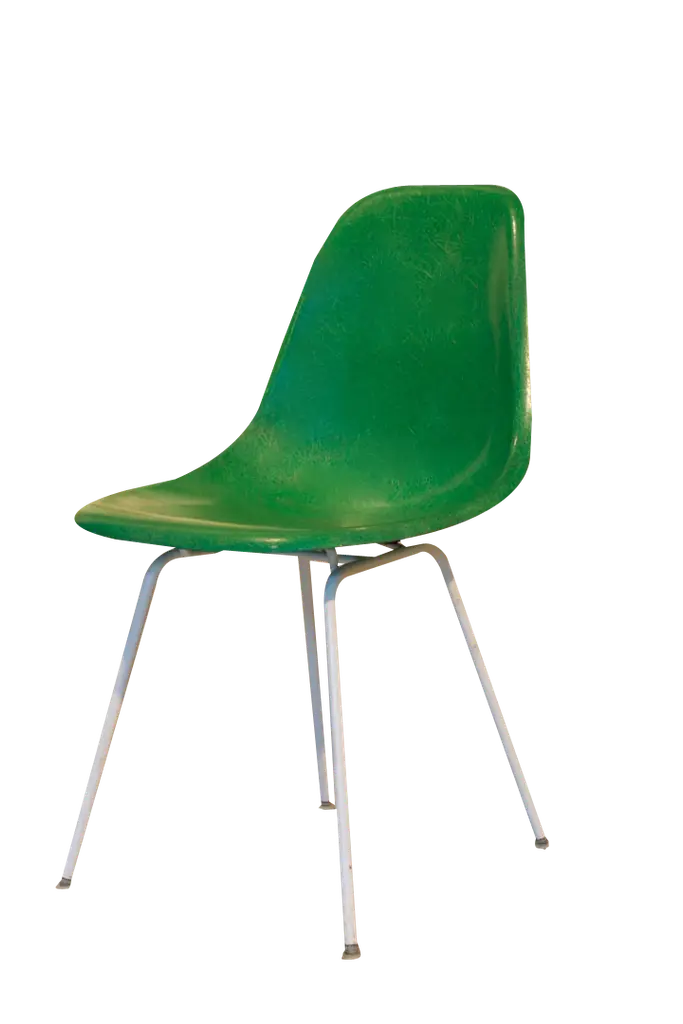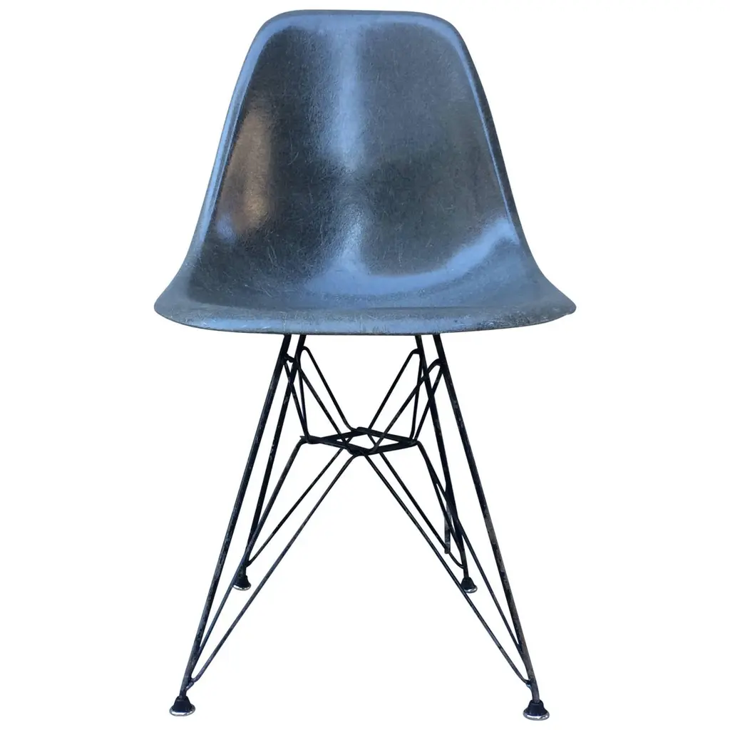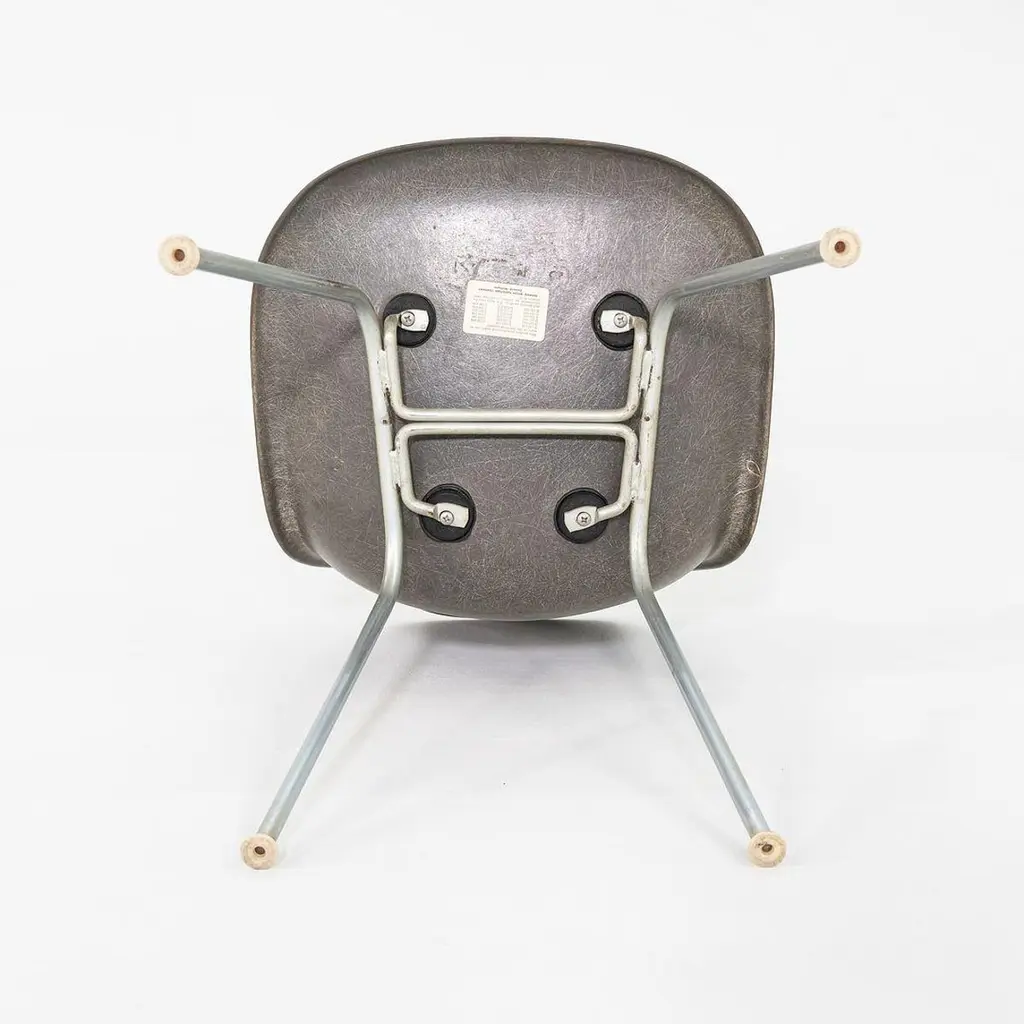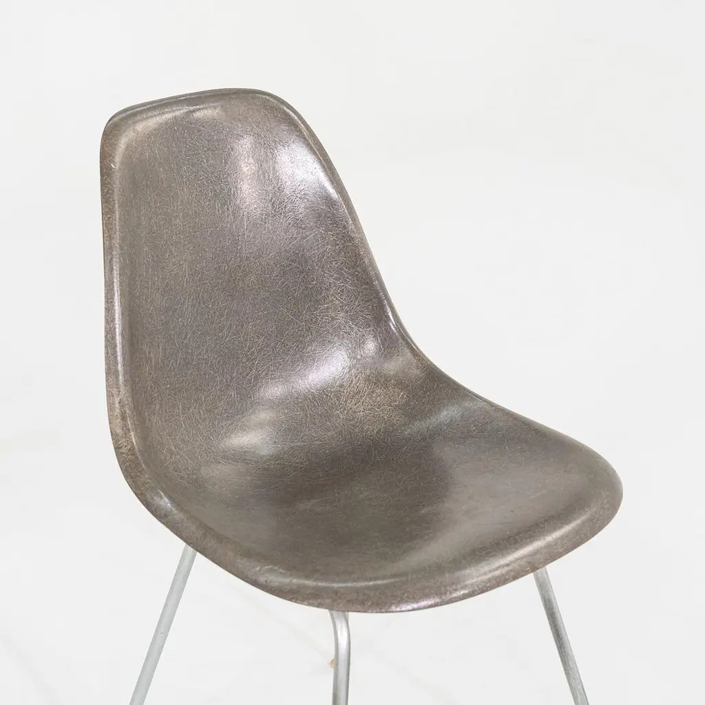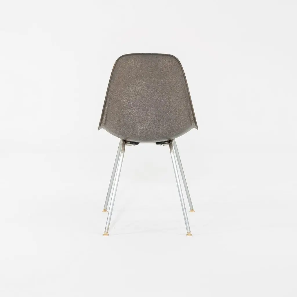 These are Eames DSX side chairs, originally designed by Ray and Charles Eames in the 1950s. These particular examples were produced by Herman Miller in the USA C. 1958. The chairs are comprised of fiberglass shells in elephant hide gray atop a steel chrome H-base. DSX is an acronym for Dining Height Side Chair on X-Base. The acronym stayed the same after they switched production to H-bases from X-bases. The listed price includes one chair and there are three available to purchase. Each DSX chair measures 22 inches deep, 18.5 inches wide, and 31.25 inches high with a seat height of 18 inches. These chairs show wear consistent with expected use, but overall are in very good to excellent condition. Please see photos.