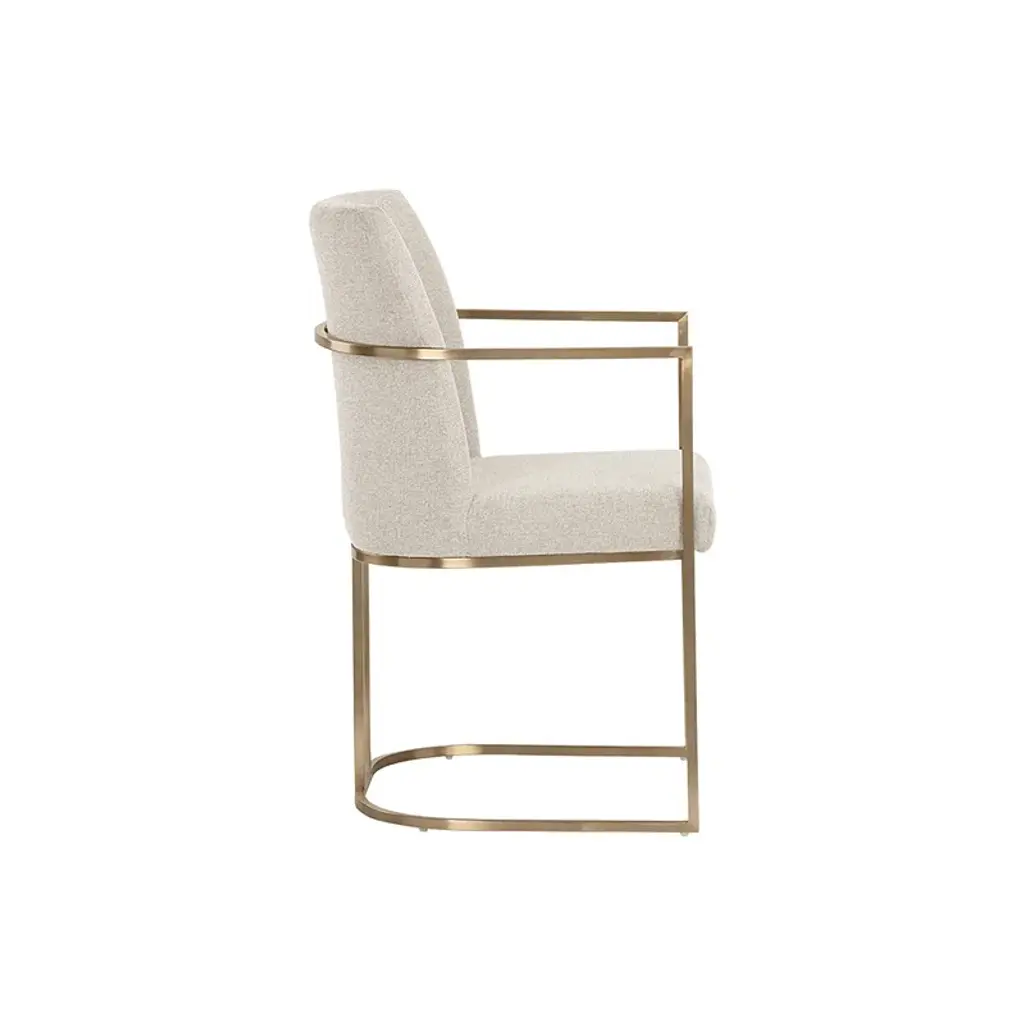 Undeniably mid-century modern, our dining armchair is a bold seat for dining areas and living rooms. An open metal frame comes in an antique brass finish, and it consists of a sled-inspired base with legs that rise up to the arms for a more streamlined look. The seat and back are wrapped in a neutral-toned polyester fabric and filled with foam to provide just the right amount of support as you sit and relax. And it accommodates up to 300 lbs.