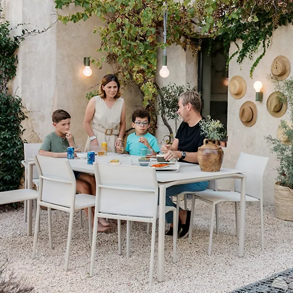 Sleek design and eternal comfort for a modern outdoor dining area. The Cadiz Chair - Set of 2 by Fermob has a lightweight look and feel backed up by strong materials and careful construction. Each chair features panels of tough and breathable Outdoor Technical Fabric for the seat and back, stretched across a slender Aluminum frame. Slight angles at the middle of the back and the front of the seat both ensure maximum ergonomic comfort and support, and provide visual continuity throughout the design. When not in use, these outdoor dining chairs can be stacked up to 10 high for compact, out-of-the-way storage.