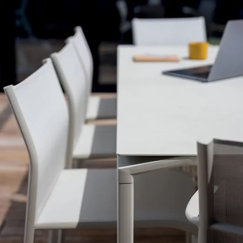A streamlined seating design inspired by the laidback sophistication of the Spanish coast. Designed by Antoine Lesur, the Cadiz Side Chair - Set of 4 by Fermob is at once airy and lightweight, strong and refined. It has a sturdy aluminum frame, which is angled just so to accommodate the natural position of a person sitting in the chair. Outdoor Technical Fabric (OTF) is stretched tightly across the frame to provide breathable support for the seat and back, and it is resistant to tears, mold and stains.