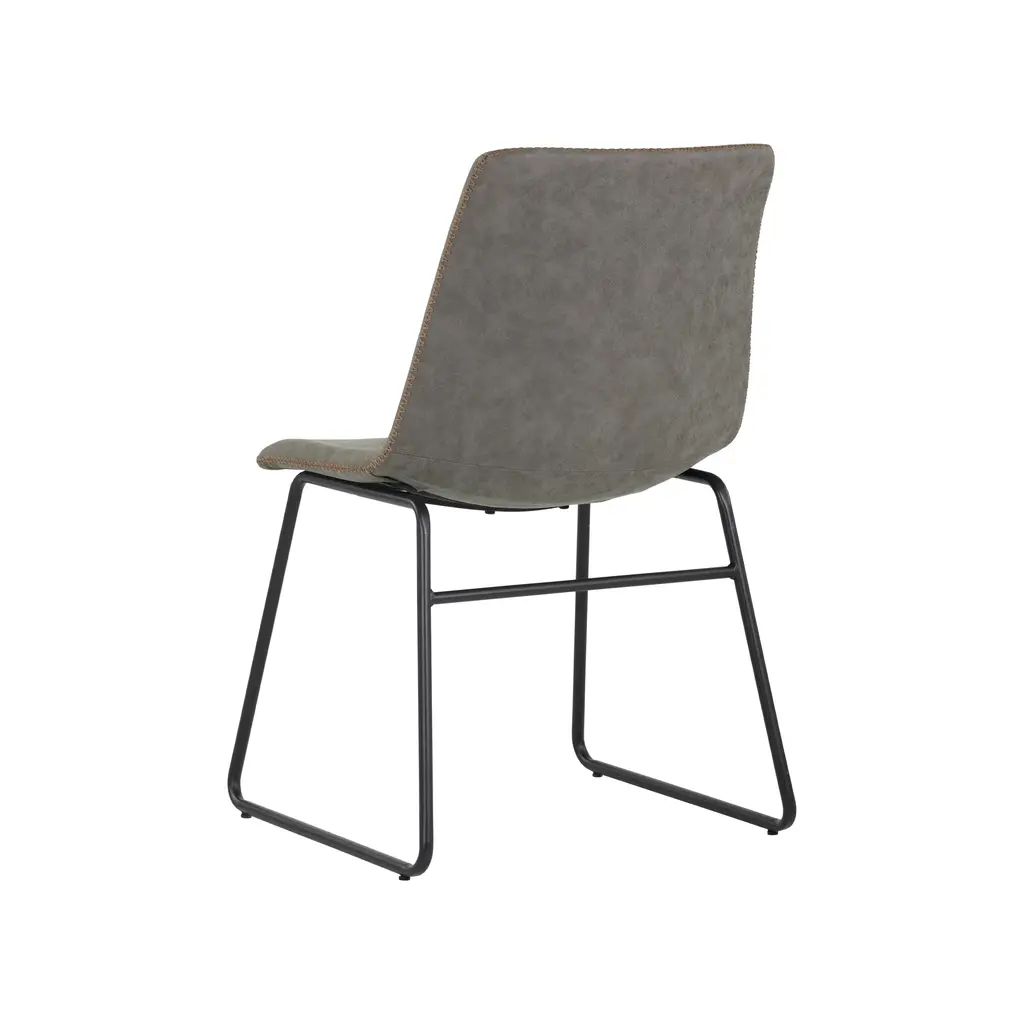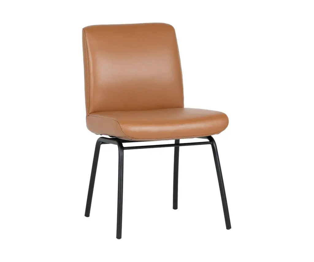 Elevate your dining experience with the Cal Dining Chair (Set. of 2) from Sunpan Crafted with faux leather for comfort and durability, the sleek, mid-century silhouette and brushed black steel frame exude sophistication. Each chair is unique, with natural leather markings adding character and charm to your well-appointed interior. Highlights