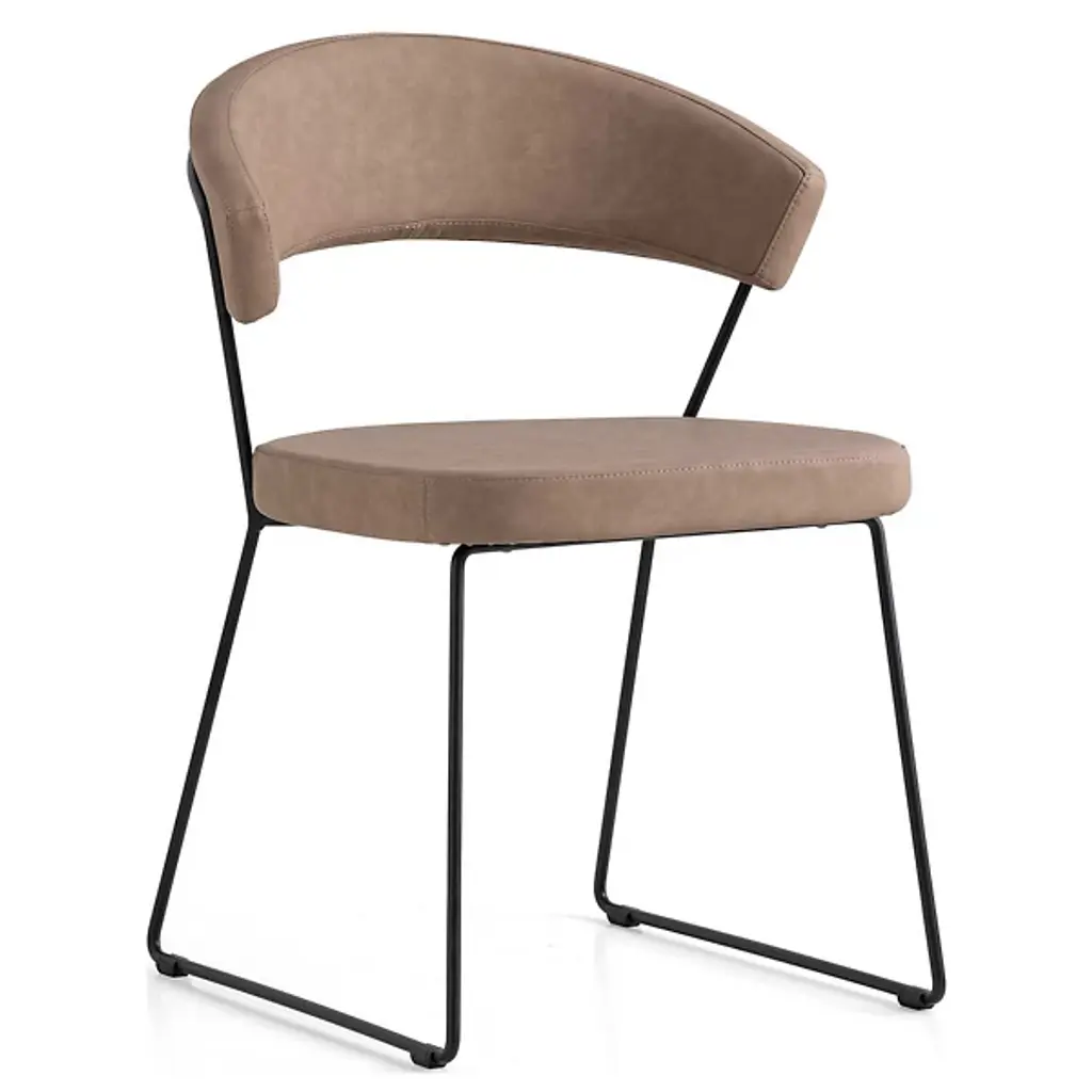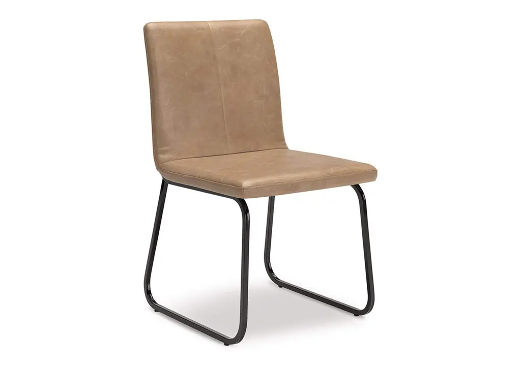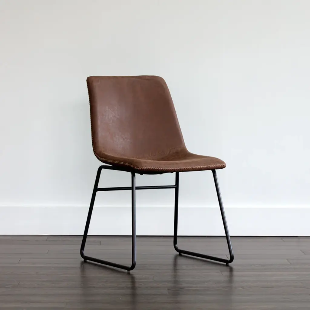 Elevate your dining experience with the Cal Dining Chair (Set. of 2) from Sunpan Crafted with faux leather for comfort and durability, the sleek, mid-century silhouette and brushed black steel frame exude sophistication. Each chair is unique, with natural leather markings adding character and charm to your well-appointed interior. Highlights