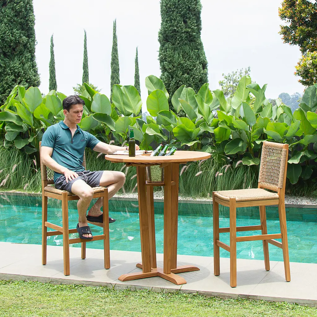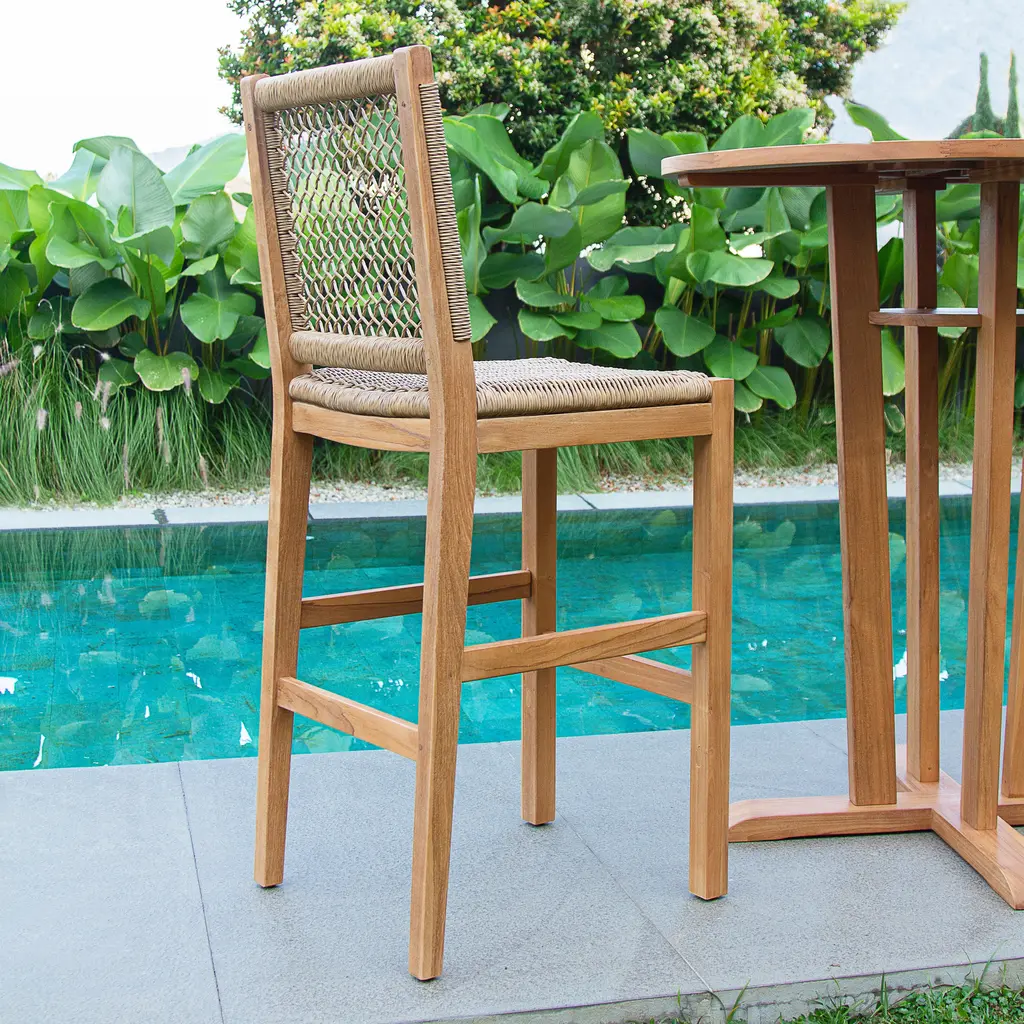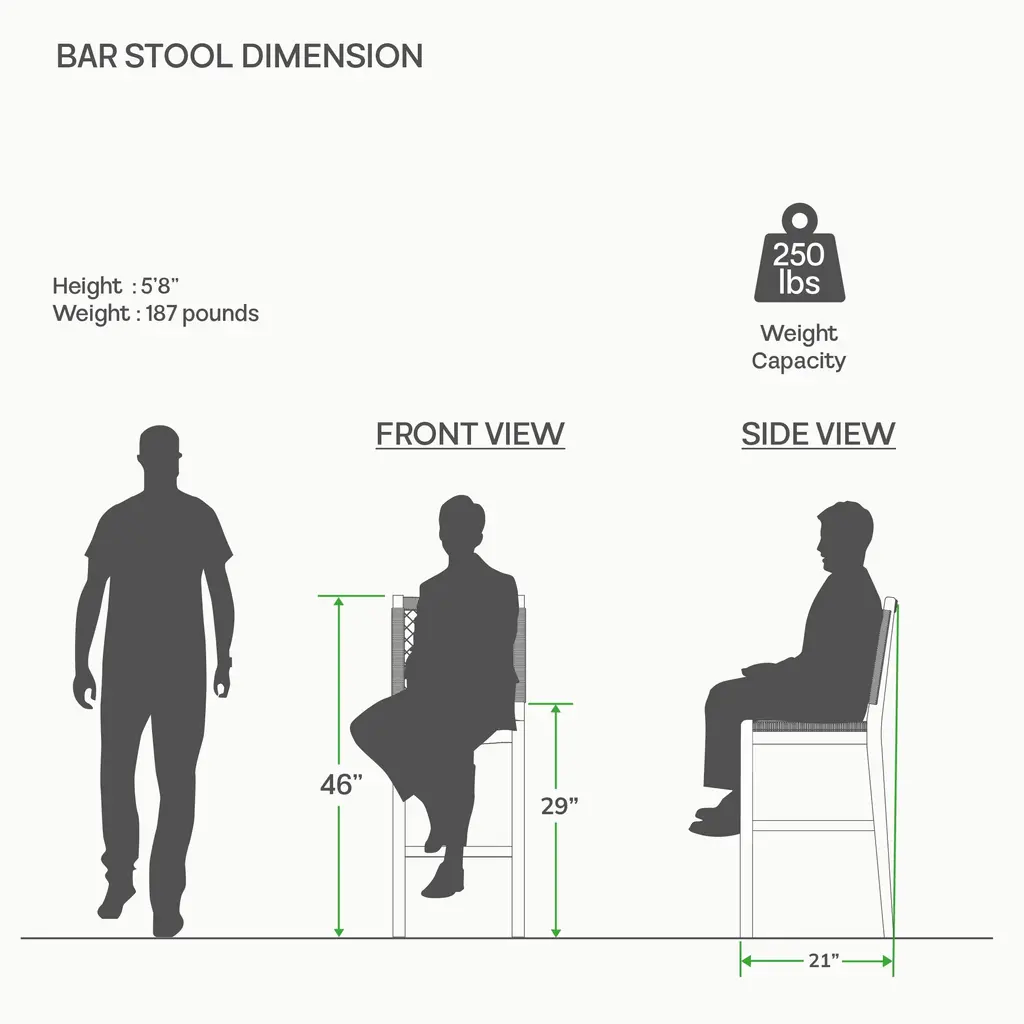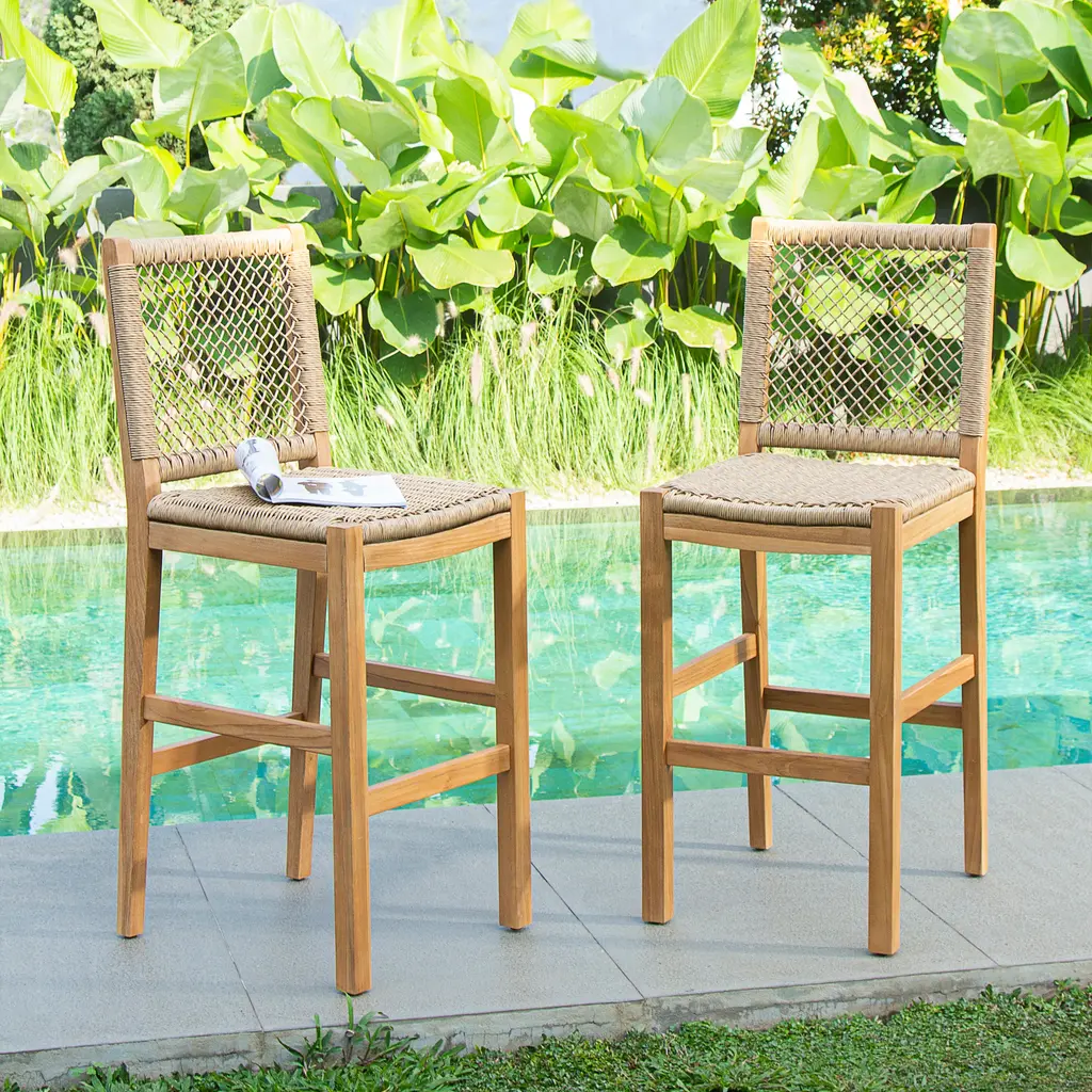 Add a relaxed, coastal touch to your outdoor space with the Cambridge Casual Paxton Teak 2-piece Patio Bistro Chair. These bar-height outdoor dining chairs are crafted from solid teak wood and handwoven wicker, offering durability with a natural, breezy charm. Features:Bar Stool Chair Dimension:Everything You Need to Know About Teak Furniture: Strength, Sustainability & Care Tips.Q: Is teak durable enough for my outdoor space?A: Dense grain, high mineral content, and natural oils make our teak furniture highly resistant to weather conditions. Ideal for outdoor use, teak furniture withstands water, sun, and bugs, preserving its quality over time.Q: Is teak environmentally friendly? A: Our teak is crafted from superior Indonesian teak sourced from plantation-grown forests. Teak wood minimizes environmental impact by absorbing and storing carbon dioxide, ensuring a low carbon footprint. Q: Is teak furniture easy to maintain? A: For easy cleaning, gently scrub mild soap along the grain, rinse thoroughly with warm water, pat dry, and let air-dry. Teak naturally develops a silver-gray patina over time. Use a teak oil or sealant if you prefer to maintain the warm honey-brown color.