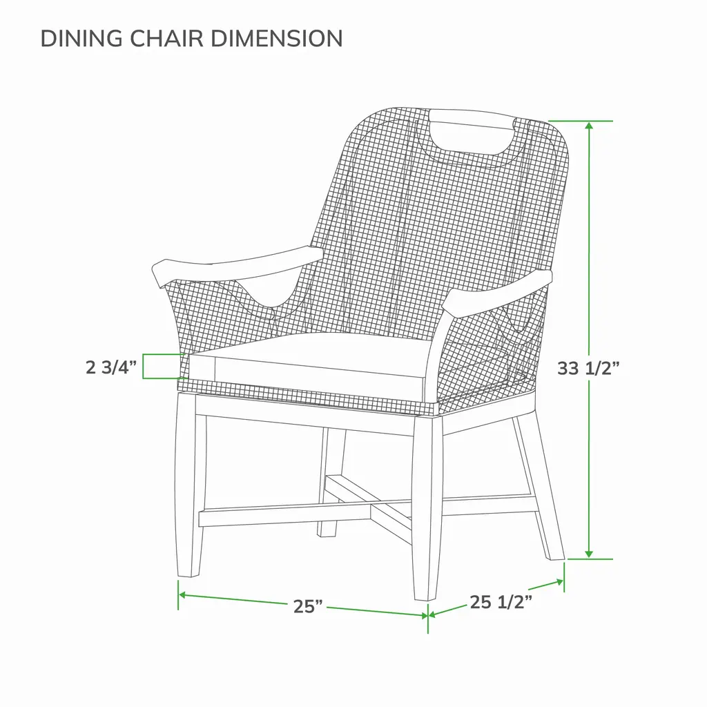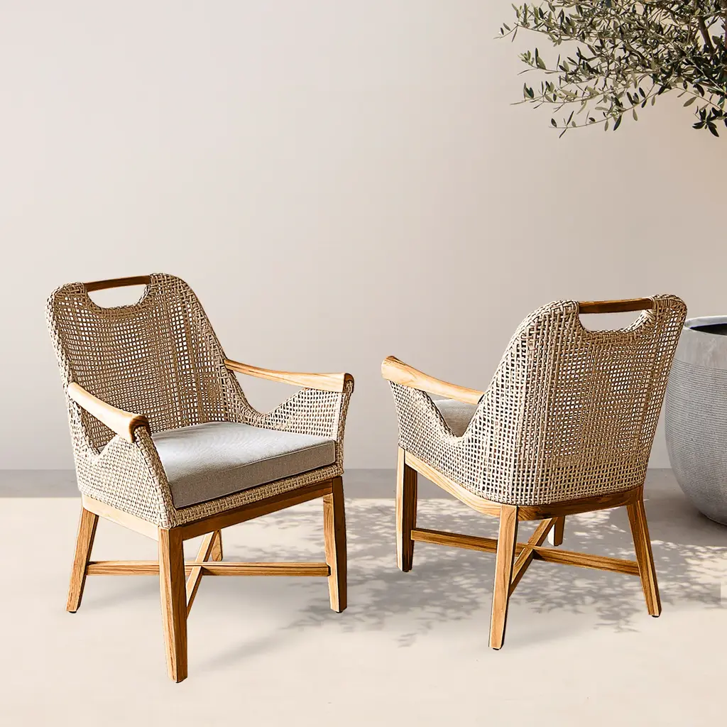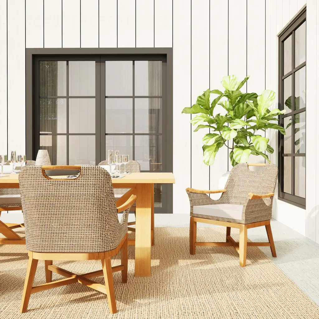 Discover pure relaxation with our Sydney outdoor dining chair. This patio dining chair is crafted from natural, unfinished teak wood and framed with teak wood, the teak dining chair brings both elegance and sustainability to your outdoor oasis. The seatback of the outdoor dining chair is woven with honey-brown wicker, making it feel warm and inviting, perfect for relaxing. The cushion from the patio dining chair offers a plush seating experience in a soothing light tan hue. The removable seat cushion is equipped with a zipper for added convenience, it's a delightful addition to your outdoor dining setup.Features:Outdoor Dining Chair Dimensions:Elevate your outdoor experience with our premium Teak Furniture. Perfect for patios, decks, porches, and pool areas, our Teak Furniture stands the test of time, offering lasting durability and timeless beauty.Q: Is teak durable enough for my outdoor space?A: Dense grain, high mineral content, and natural oils make our teak furniture highly resistant to weather conditions. Ideal for outdoor use, teak furniture withstands water, sun, and bugs, preserving its quality over time.Q: Is teak environmentally friendly? A: Our teak is crafted from superior Indonesian teak sourced from plantation-grown forests. Teak wood minimizes environmental impact by absorbing and storing carbon dioxide, ensuring a low carbon footprint. Q: Is teak furniture easy to maintain? A: For easy cleaning, gently scrub mild soap along the grain, rinse thoroughly with warm water, pat dry, and let air-dry. Teak naturally develops a silver-gray patina over time. Use a teak oil or sealant if you prefer to maintain the warm honey-brown color.