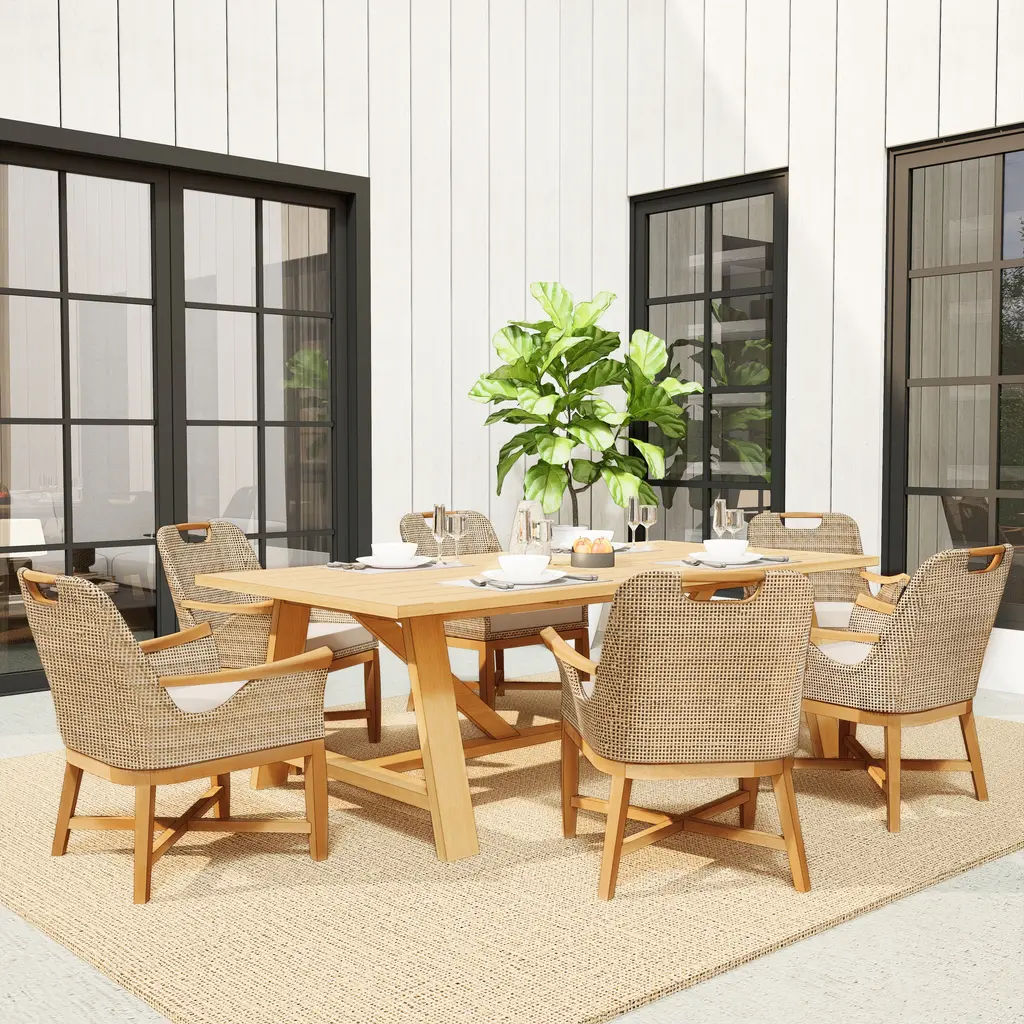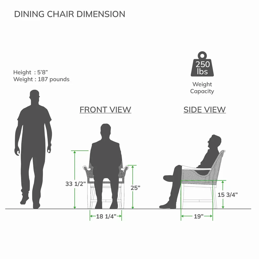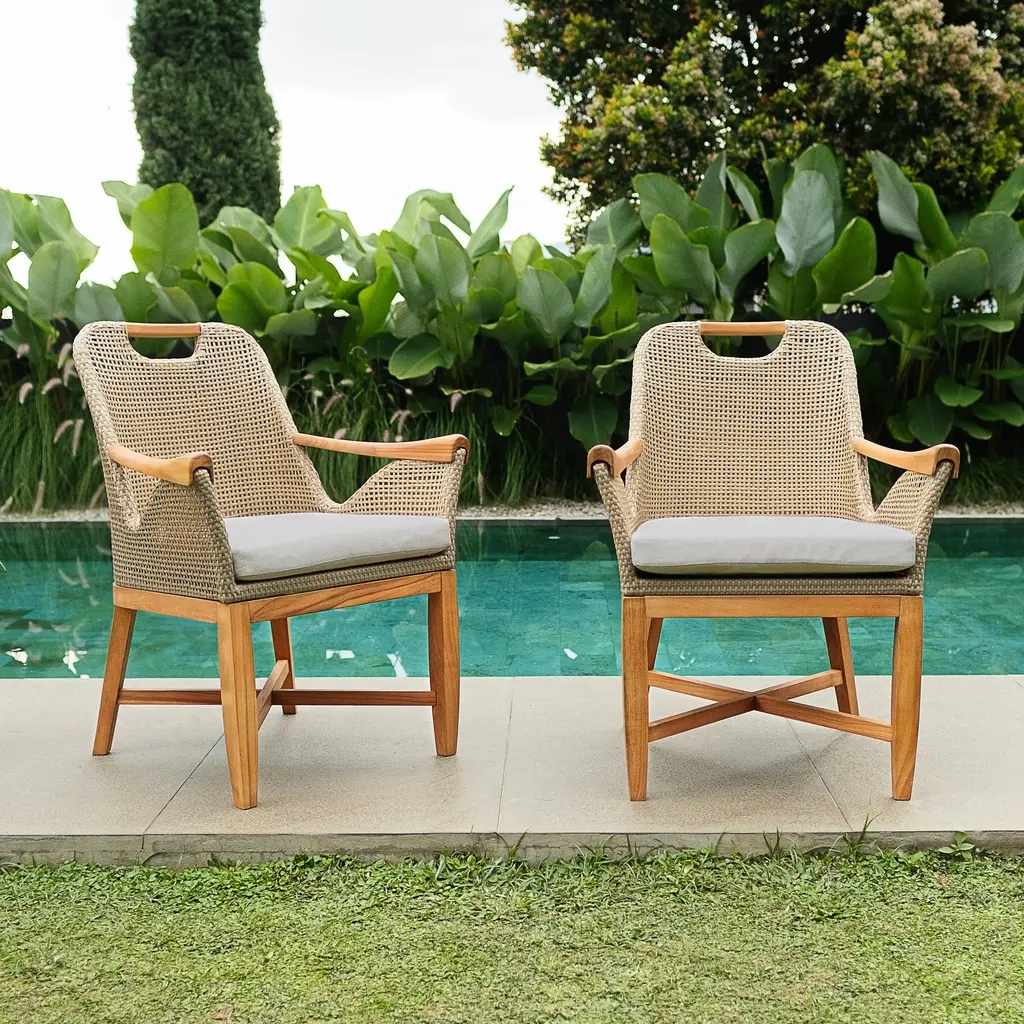Discover pure relaxation with our Sydney outdoor dining chair. This patio dining chair is crafted from natural, unfinished teak wood and framed with teak wood, the teak dining chair brings both elegance and sustainability to your outdoor oasis. The seatback of the outdoor dining chair is woven with honey-brown wicker, making it feel warm and inviting, perfect for relaxing. The cushion from the patio dining chair offers a plush seating experience in a soothing light tan hue. The removable seat cushion is equipped with a zipper for added convenience, it's a delightful addition to your outdoor dining setup.Features:Outdoor Dining Chair Dimensions:Elevate your outdoor experience with our premium Teak Furniture. Perfect for patios, decks, porches, and pool areas, our Teak Furniture stands the test of time, offering lasting durability and timeless beauty.Q: Is teak durable enough for my outdoor space?A: Dense grain, high mineral content, and natural oils make our teak furniture highly resistant to weather conditions. Ideal for outdoor use, teak furniture withstands water, sun, and bugs, preserving its quality over time.Q: Is teak environmentally friendly? A: Our teak is crafted from superior Indonesian teak sourced from plantation-grown forests. Teak wood minimizes environmental impact by absorbing and storing carbon dioxide, ensuring a low carbon footprint. Q: Is teak furniture easy to maintain? A: For easy cleaning, gently scrub mild soap along the grain, rinse thoroughly with warm water, pat dry, and let air-dry. Teak naturally develops a silver-gray patina over time. Use a teak oil or sealant if you prefer to maintain the warm honey-brown color.