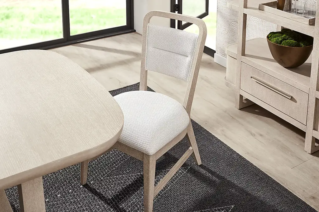 Subtle art deco flair infused with warm, family-friendly appeal is the hallmark of the captivating curves and lines of the Drew & Jonathan Canyon dining room. Exuding contemporary charm, this set is finished in a light gray hue and shaped into organic stirrup-style bends. An open pedestal design showcases the table's interconnected base, and the handsome curved edge on the tabletop invites comfortable, casual enjoyment. Four side chairs mirror the distinctive style with angled, tapered legs complemented by curved backs and seats upholstered in white fabric.