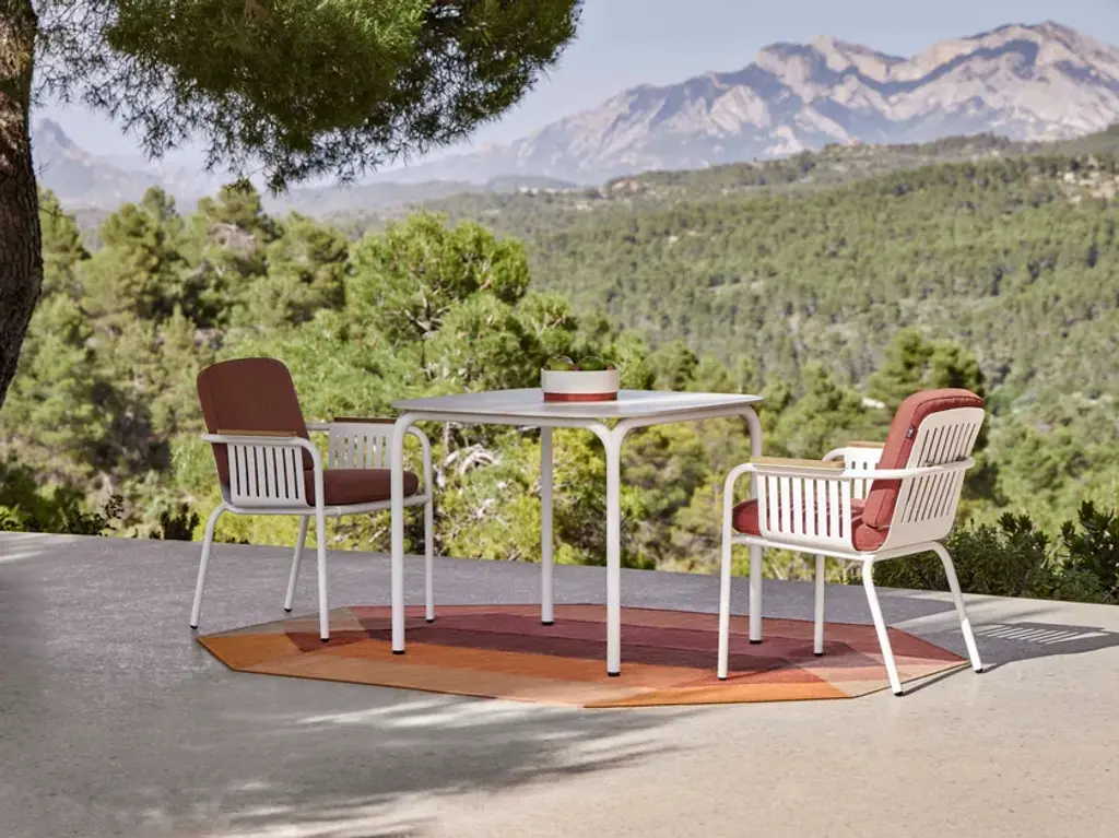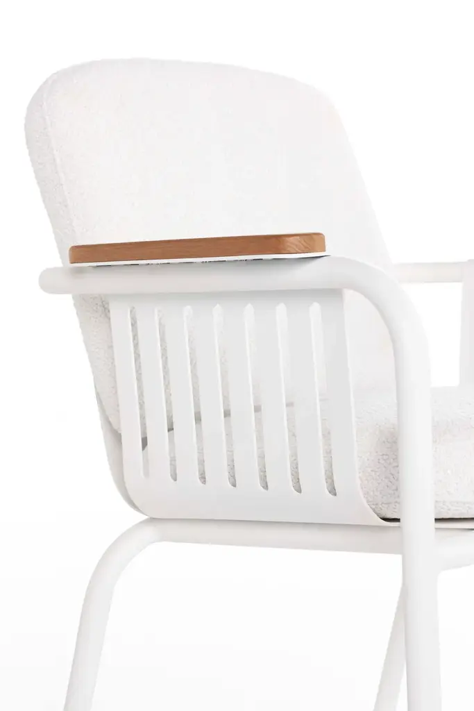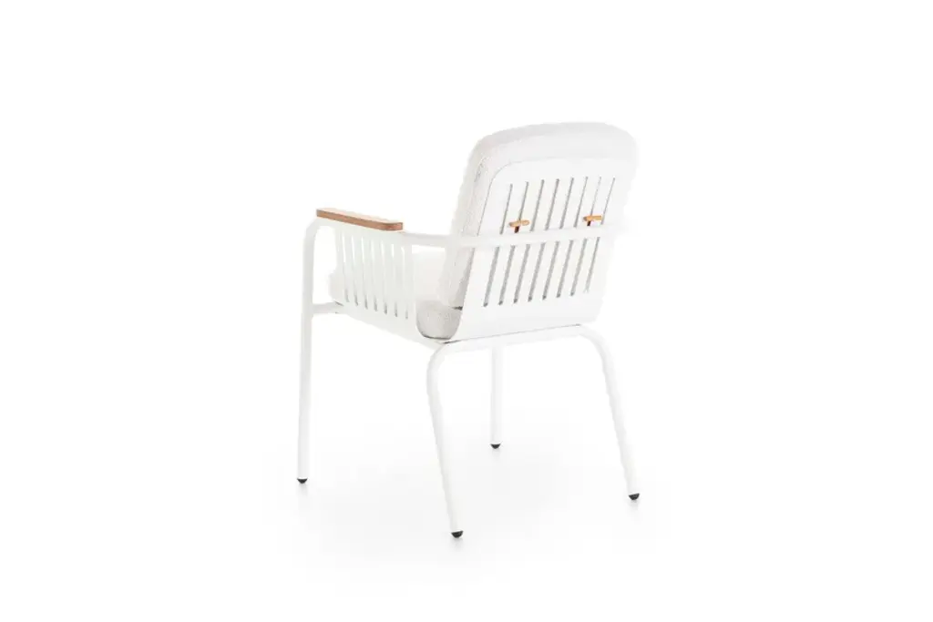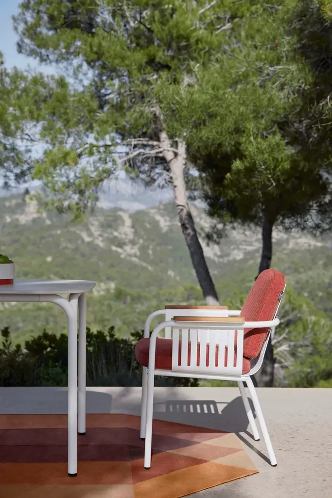 The CAPA dining armchair is a designer chair with a light structure made of tubular profiles and laser-cut slotted aluminum sheet, while its armrests are available in iroko wood or Dekton® by Cosentino porcelain material. The cushions of this exclusive chair are comfortable and resistant, ideal for enjoying moments of relaxation both in the garden or by the pool and for large contract surfaces of hotels or restaurants.MATERIALSPowder-coated aluminiumArmrests in iroko or Dekton® (optional)Polyurethane foam rubber and polyester fibre with water-repellent fabricRemovable technical upholstery for outdoor useSøren Rose brings the essence of Scandinavian design to GANDIABLASCO with a new collection of outdoor furniture with a minimalist feel that combines a functional sense, aesthetic sensitivity and sustainability. Between Copenhagen and New York, the designer skilfully combines opposites to give results as simple and serene as refined and elegant.Thus, CAPA constitutes a compact and versatile series, specially designed to turn an outdoor environment into an intimate and welcoming experience.“I have entered the universe of GANDIABLASCO with a proposal that evokes the Danish concept ‘hygge’, a philosophy of life that encourages to enjoy simple and relaxed plans with people we appreciate”, explains Rose alluding to a design of which she affirms that “it has a soul and appeals to you directly as a user.”CAPA is composed of seats and tables with a thermo-lacquered aluminium structure combined with a shaped aluminium plate with simple bars and curved edges. The tables, in turn, feature multiple finishes and surfaces in porcelain. “We have made very clean designs that users can customize by choosing the fabric and surface finishes,” adds Rose.Thus, the soft light of the Nordic style filters into the catalogue of the Valencian firm with a timeless and sustainable proposal that is placed at the margin of passing trends. “Everything comes down to quality and details. Taking care of these two factors to the extreme allows us to achieve pieces with which we want to live, that endure and acquire meaning over time.”“As a designer you always work to invent something that does not exist. It is like a constant struggle to find a purpose or a need that gives you the solution to a problem.With GANDIABLASCO we have tried to combine its minimalist universe with the Danish concept “hygge”, a philosophy of life that encourages you to enjoy simple and relaxed plans with the people you love. We hope that our collection has soul and speaks to people.”