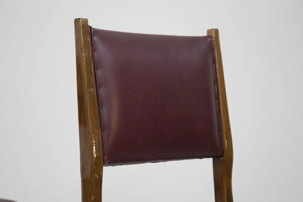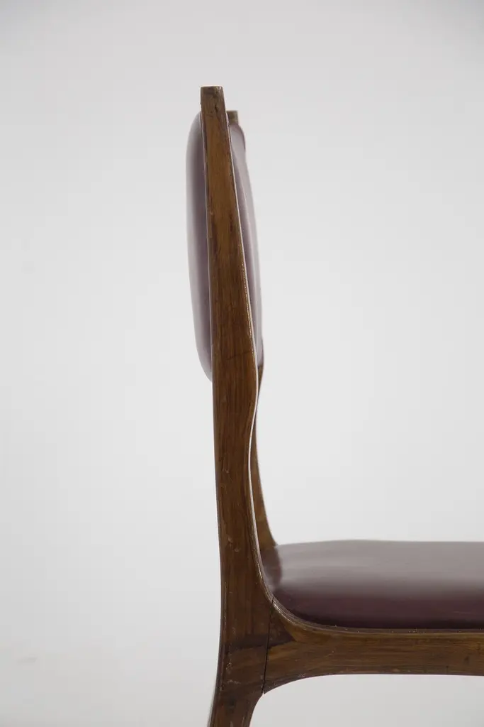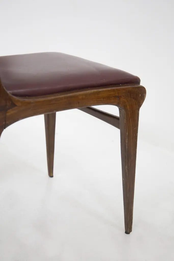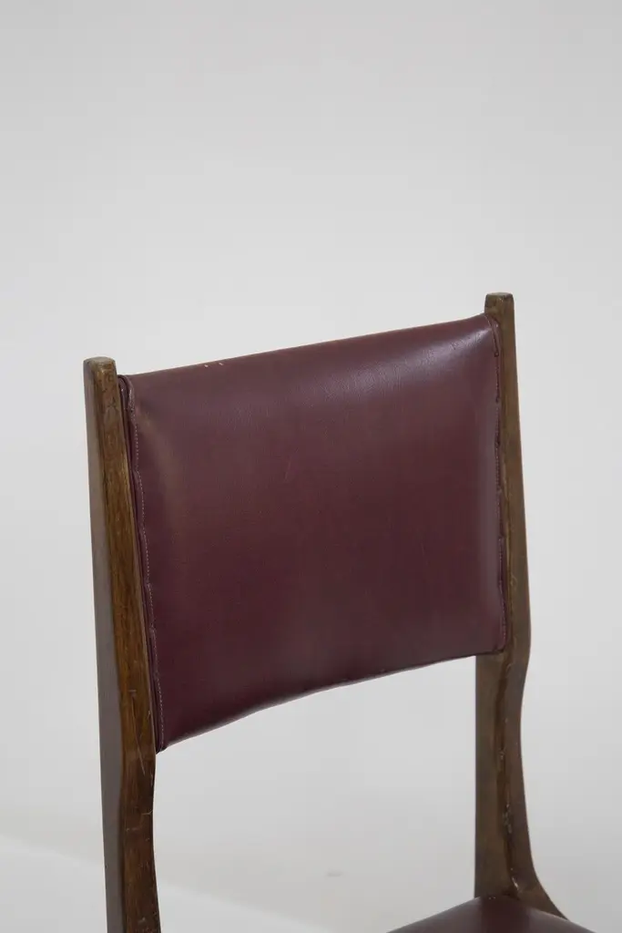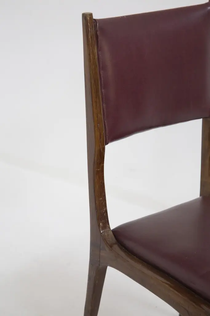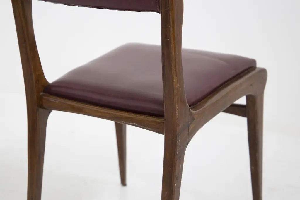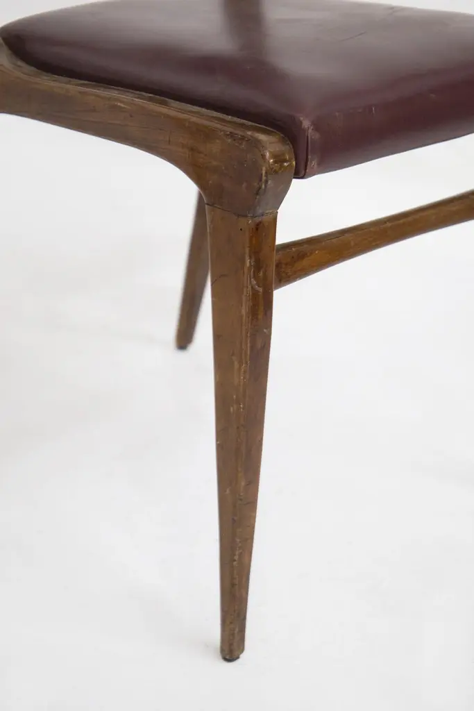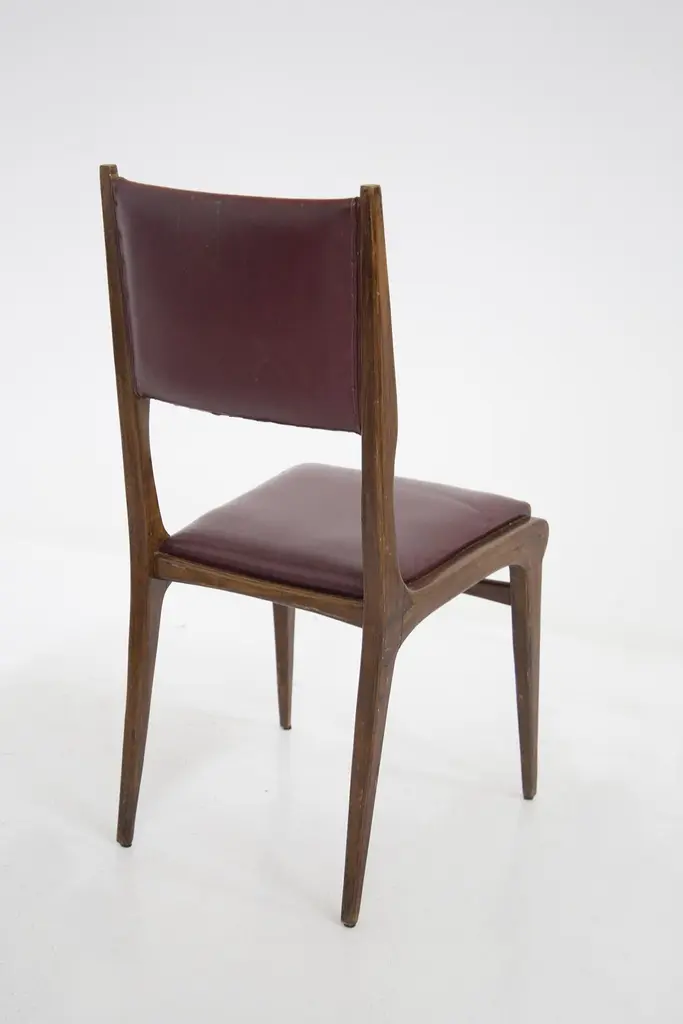 The set of vintage chairs from the ‘50s are designed by Carlo de Carli and made by fine Italian manufacturer. The chairs are solid, made in wood with rigid lines. While the seat and back rest have their original bordeaux leather.This very beautiful chairs are ideal for vintage and elegant dining rooms.