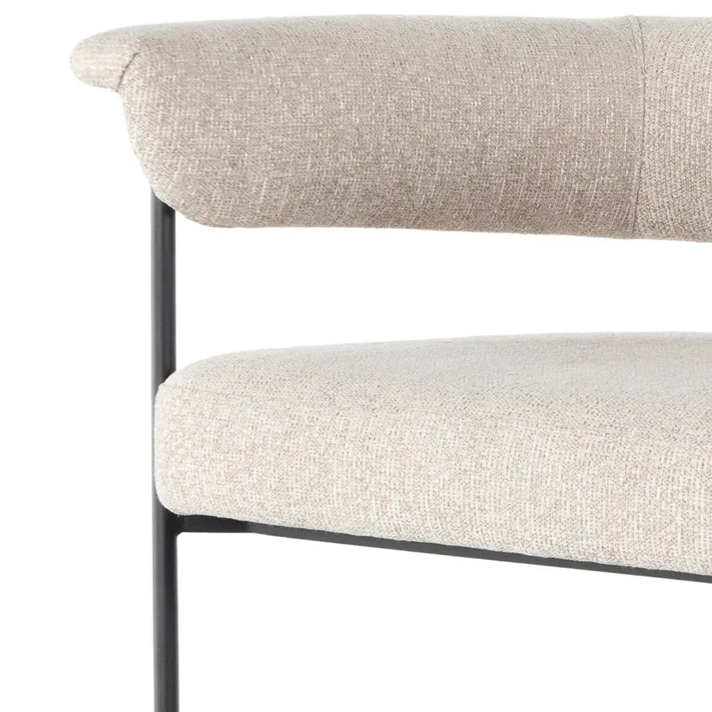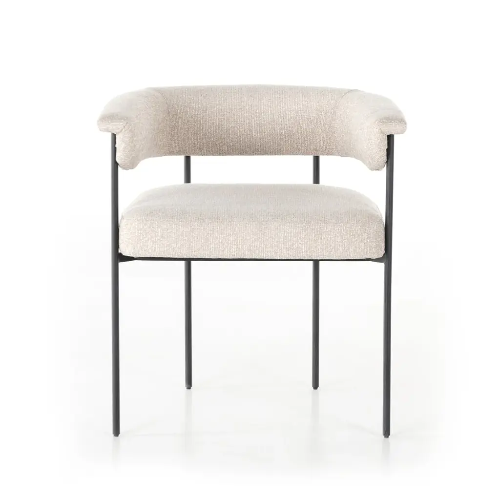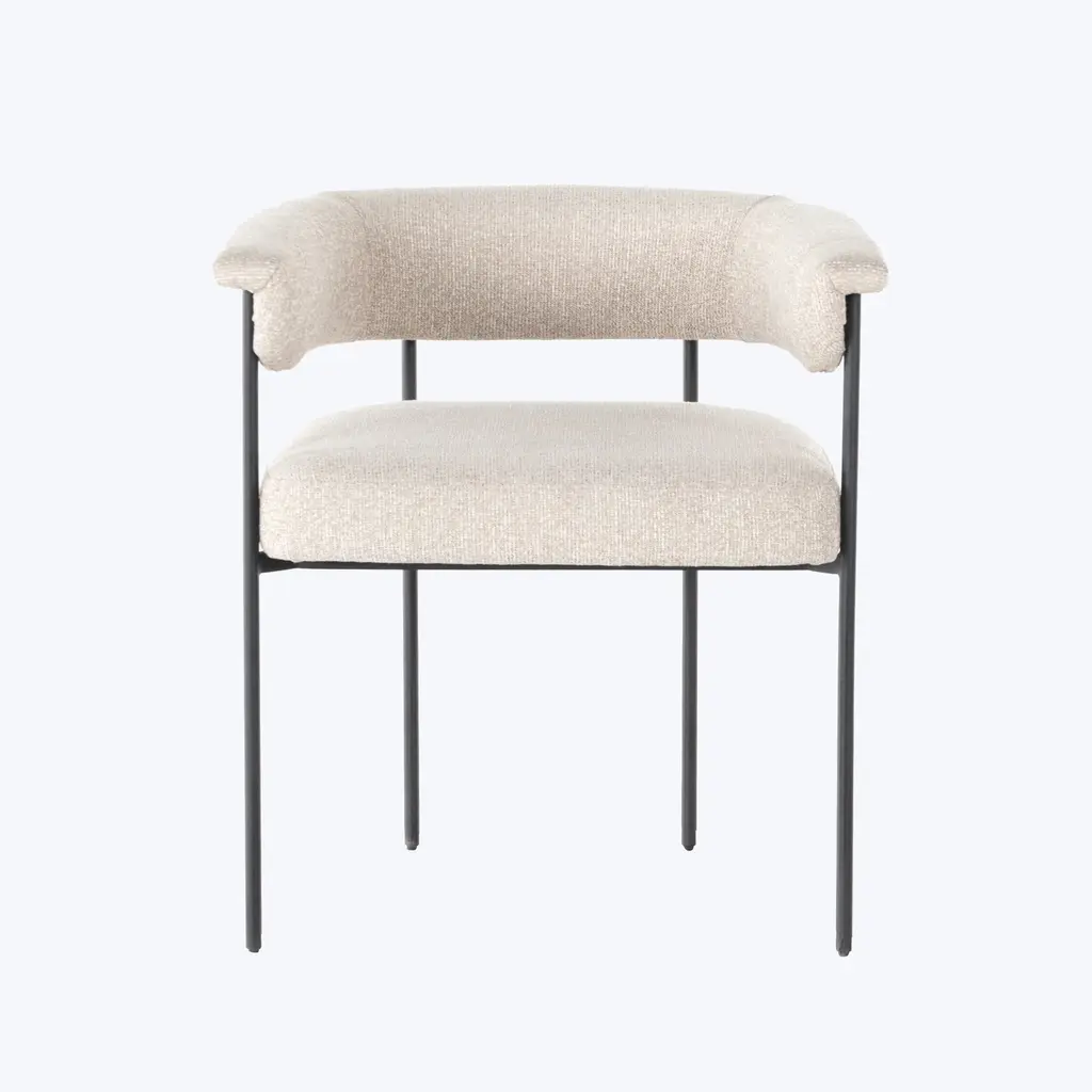 Airy and light with slim, black-finished iron framing, camel-colored upholstery lends texture to a beautifully sculpted dining style featuring a yoke back and exterior fold detailing. Ships In 10-14 Business Days Yoke back This image is for illustrative purposes only. The colors shown are accurate within the constraints of lighting, photography, and the color accuracy of your screen.