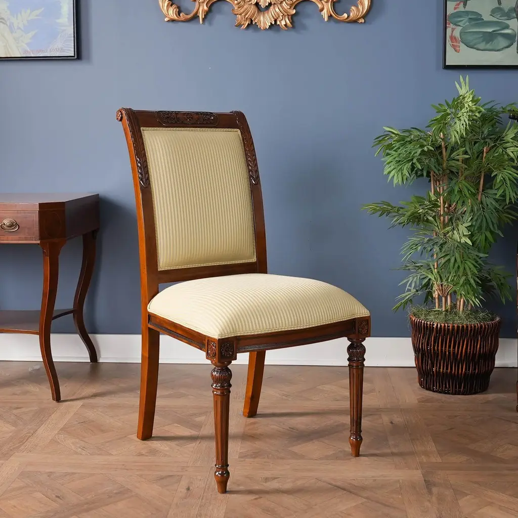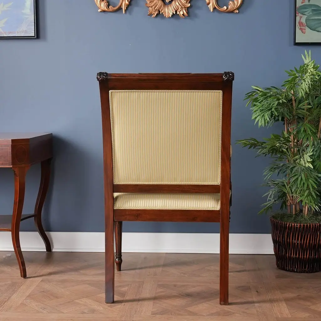 The set of 10 Carved Empire Upholstered Chairs comprise of a group with 2 arm chairs and 8 side chairs. All chairs with a carved top rail and featuring a fully upholstered back which gives this chair a great quality designer look as well as a maximum comfort while seated for dinner. The drop in seat provides the ability to have the fabric changed somewhat easily should you decide to customize the chair with fabric of your choice. The hand carved solid mahogany frames are produced from kiln dried, plantation grown mahogany. The Carved Empire Upholstered Chairs ship out with our most popular, neutral green strip fabric, suitable for use in almost any setting.Arm Height approximately at upholstery point 27.5 inches and seat height approximately 20 inches.Arm Chairs measure 24W x 28D x 40HSide Chairs measure 21W x 25D x 40H.Set consists of 2 Arm and 8 Side Chairs.
