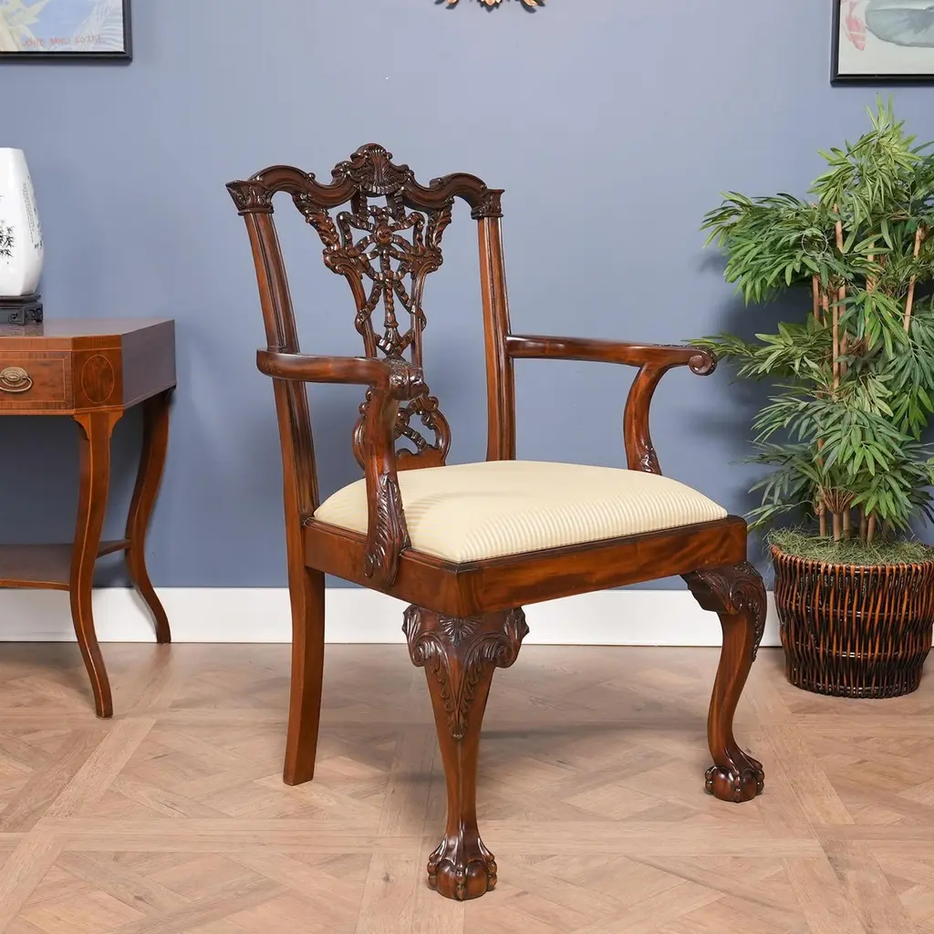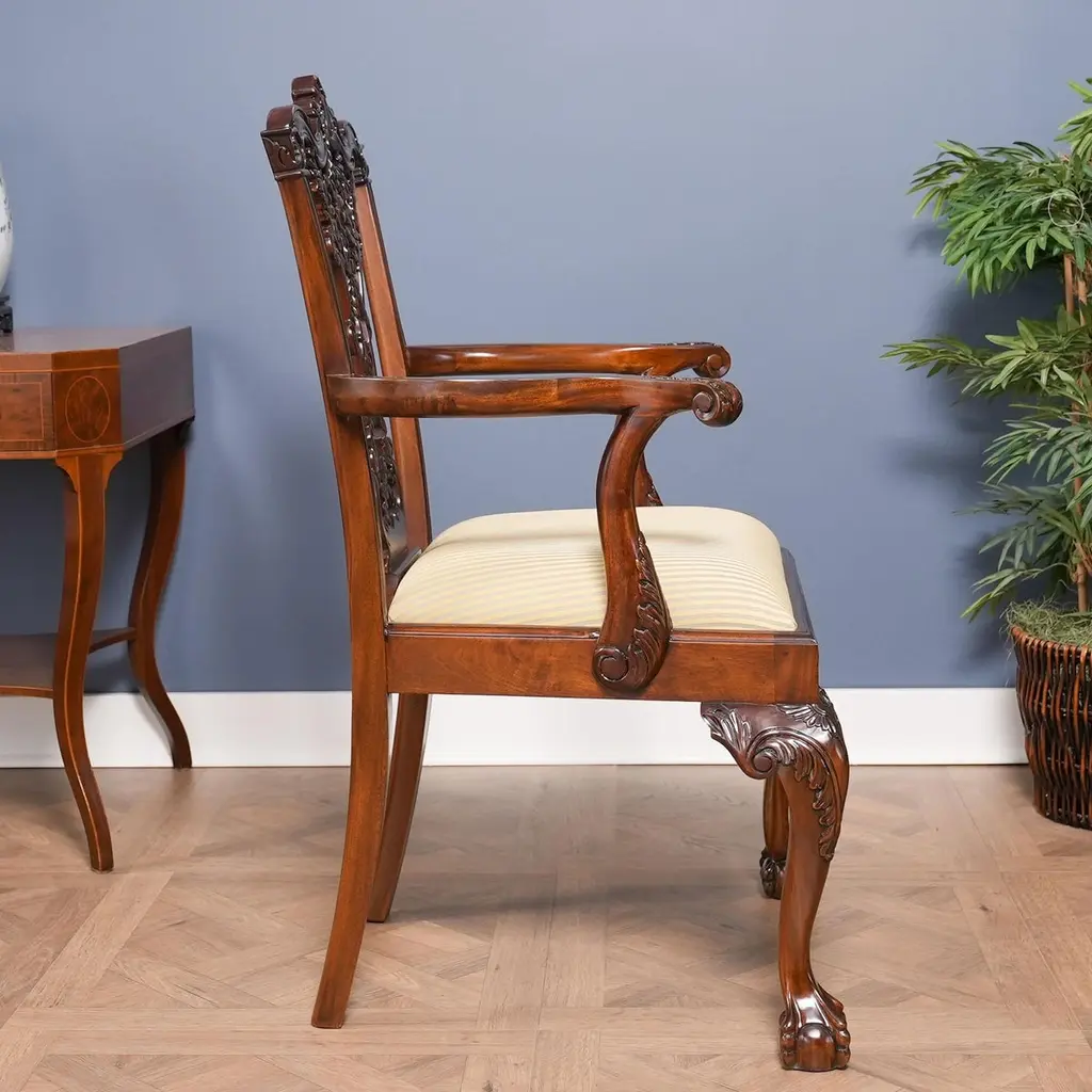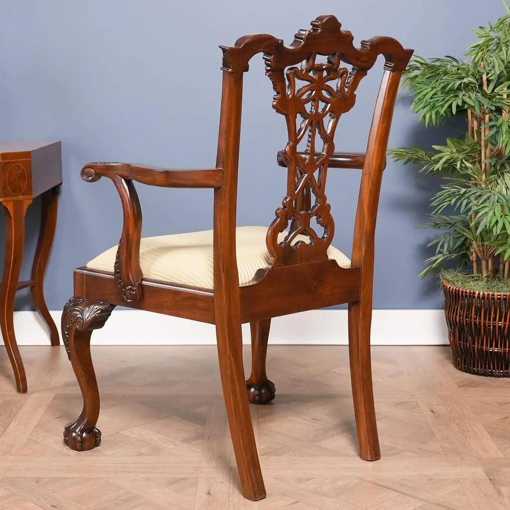 This set of ten Carved Mahogany Chippendale Dining Chairs are also often referred to as ribbon back chairs since the carvings in the back of the chair appear to be ribbons. Each Chair is hand carved from kiln dried, plantation grown solid mahogany. Our most ornate set of dining chairs, they are finished beautifully in a rich, warm brown tone and ready to be used in your home today with our most popular neutral fabric already applied to the seats. These Carved Mahogany Chippendale Chairs feature ribbon and foliate carvings, exaggerated ears on the ends of the crest rails, curved and scrolled arms, acanthus ball and claw feet are available for a very reasonable price.Arm Height approximately 27.5 inches and seat height approximately 20 inches.Arm Chairs measure 27W x 21D x 41HSide Chairs measure 24W x 20D x 41HSet consists of 2 Arm and 8 Side Chairs.