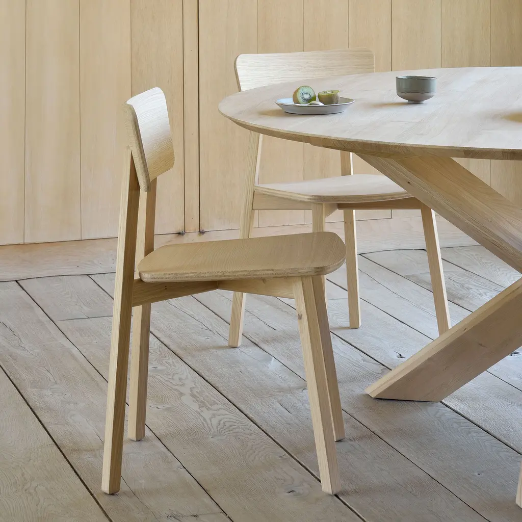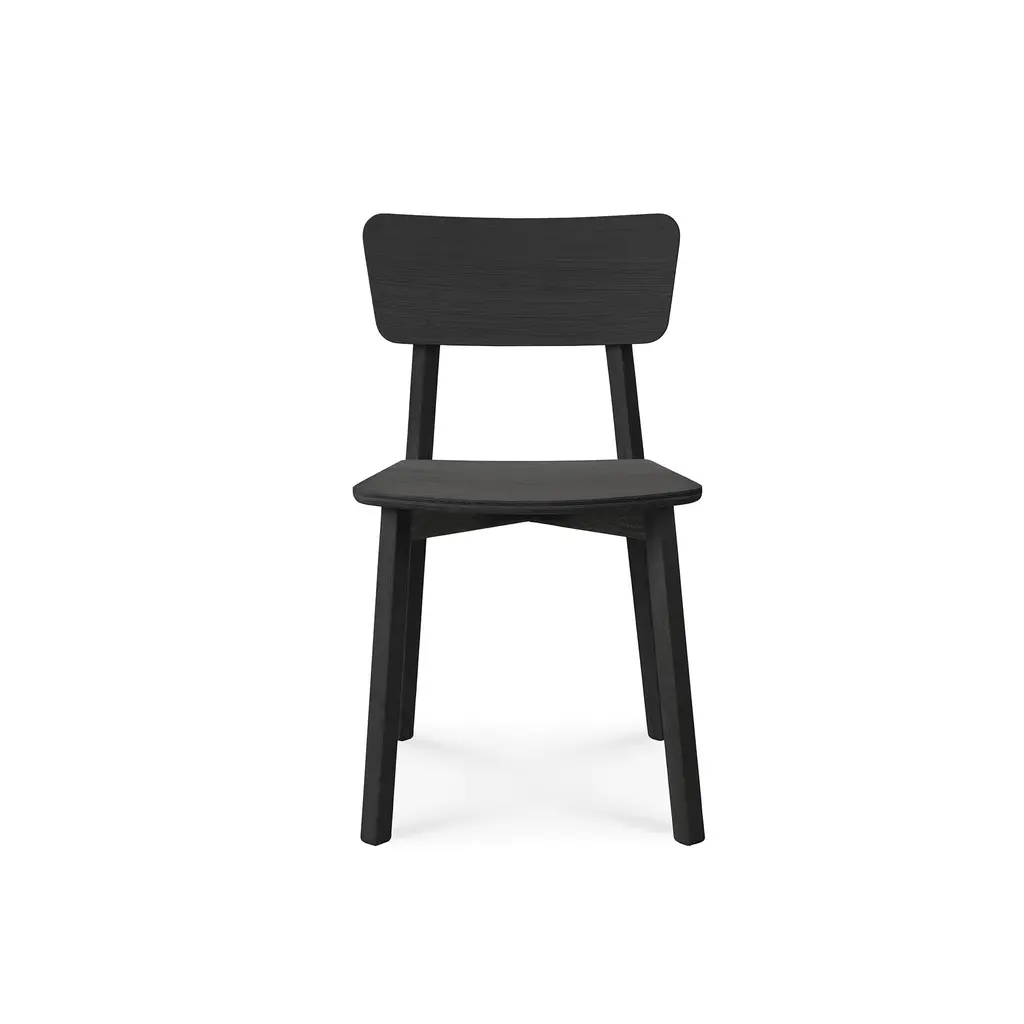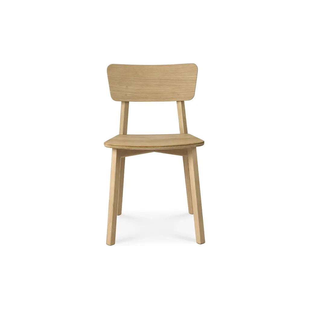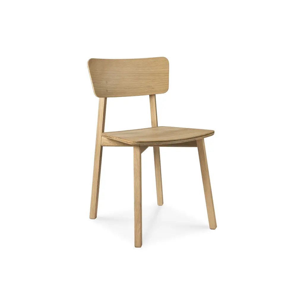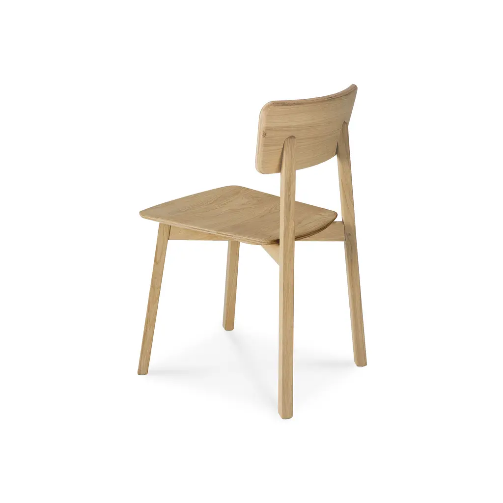 Exploring the expressiveness of simplicity, Studio Kaschkasch created the Casale dining chair with a graceful, delicate silhouette. Part of the Ethnicraft collection, the chair is incredibly versatile thanks to its restrained style and clean lines. The slender legs have a rectangular form while the seat and backrest are subtly curved and feature rounded edges. Manufactured from solid wood, Casale boasts handmade wooden details that showcase the beauty of traditional craftsmanship. Floor protectors shield more delicate flooring surfaces from scratches while making these minimalist dining chairs slide smoothly on polished floors. Available in two finishes, the Ethnicraft Casale Dining Chair complements any home decor.