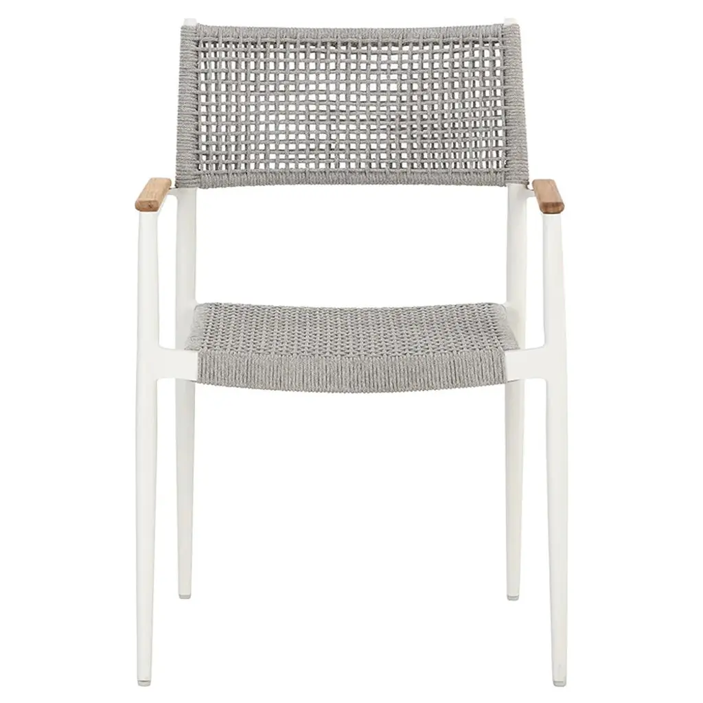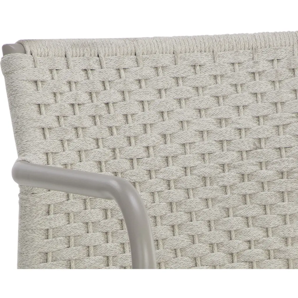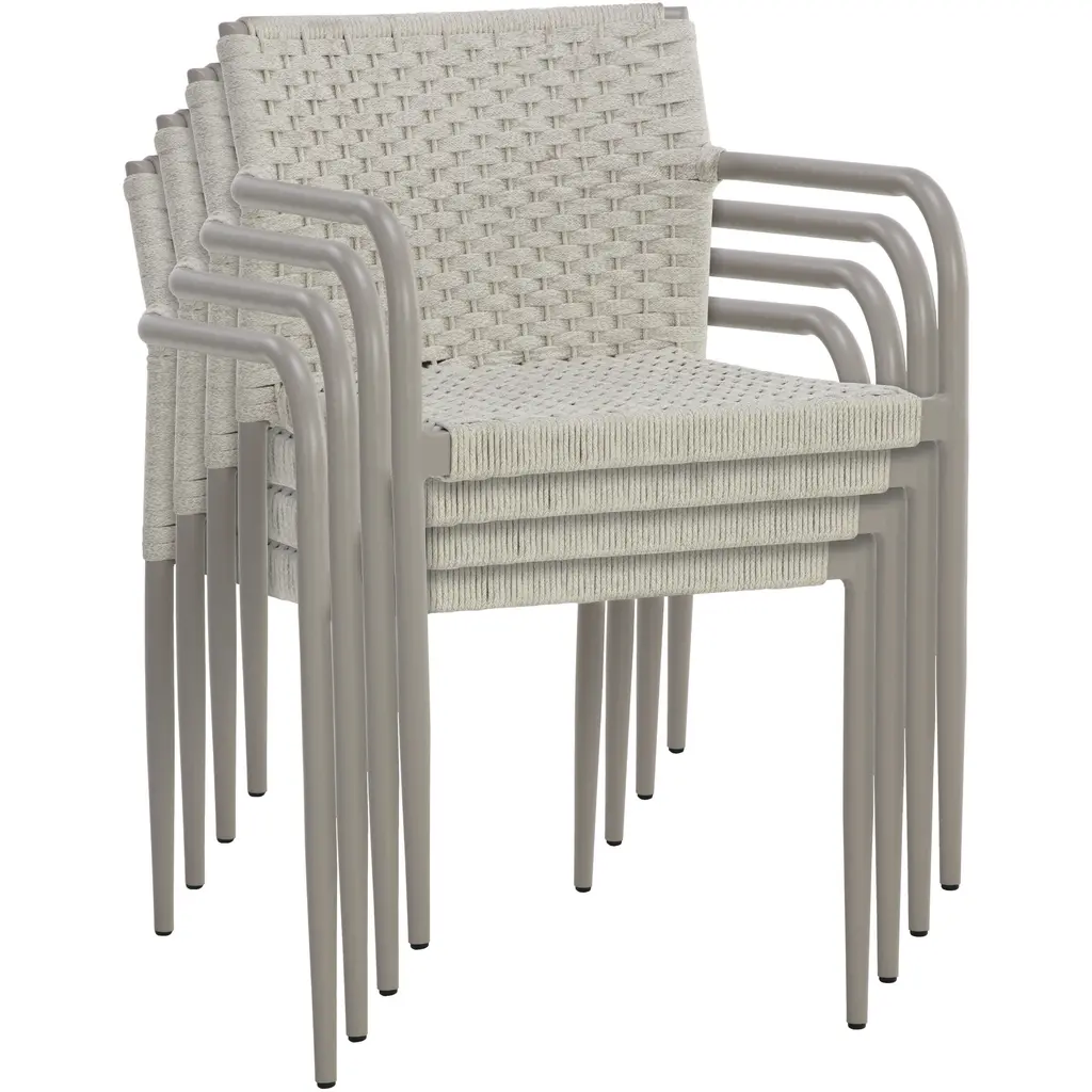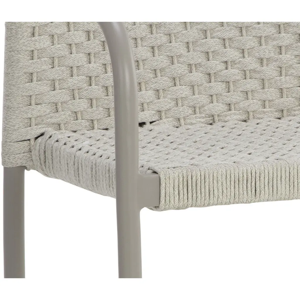 The Casella Stackable Dining Armchair is defined by its simplicity. Features cream rope weaving on the seat and backrest. Finished with a greige powder-coated aluminum frame that complements the neutral palette.