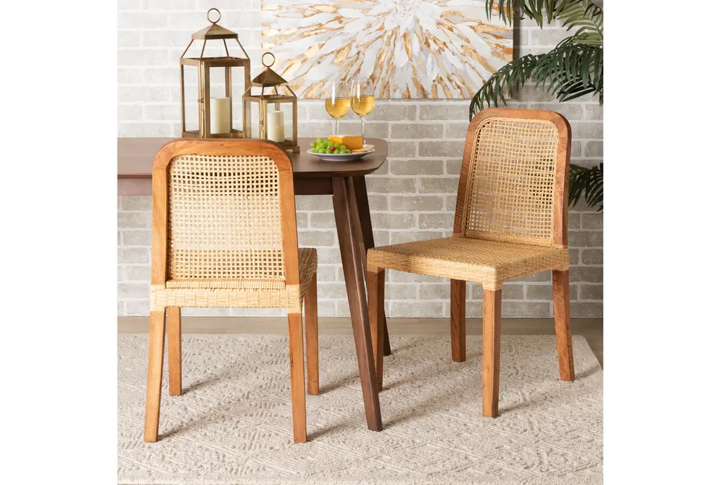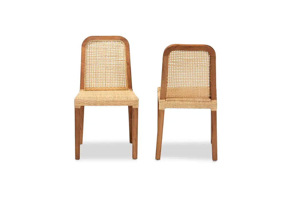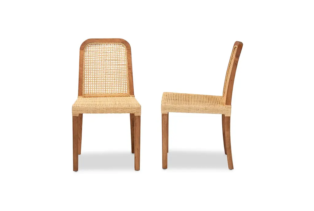 Caspia Mid-Century Modern Walnut Brown Mahogany Wood & Natural Rattan Dining Chair Set Of 2